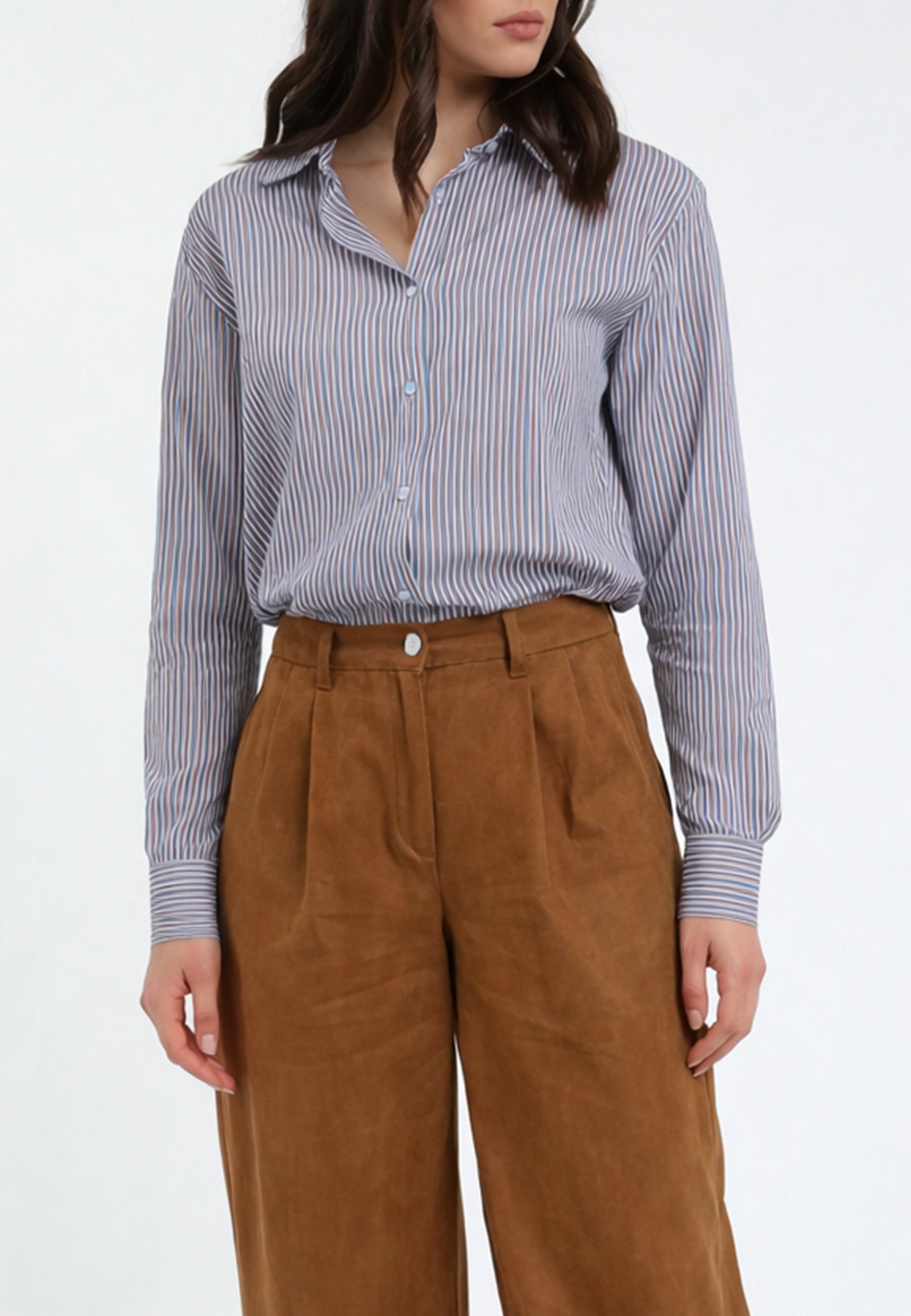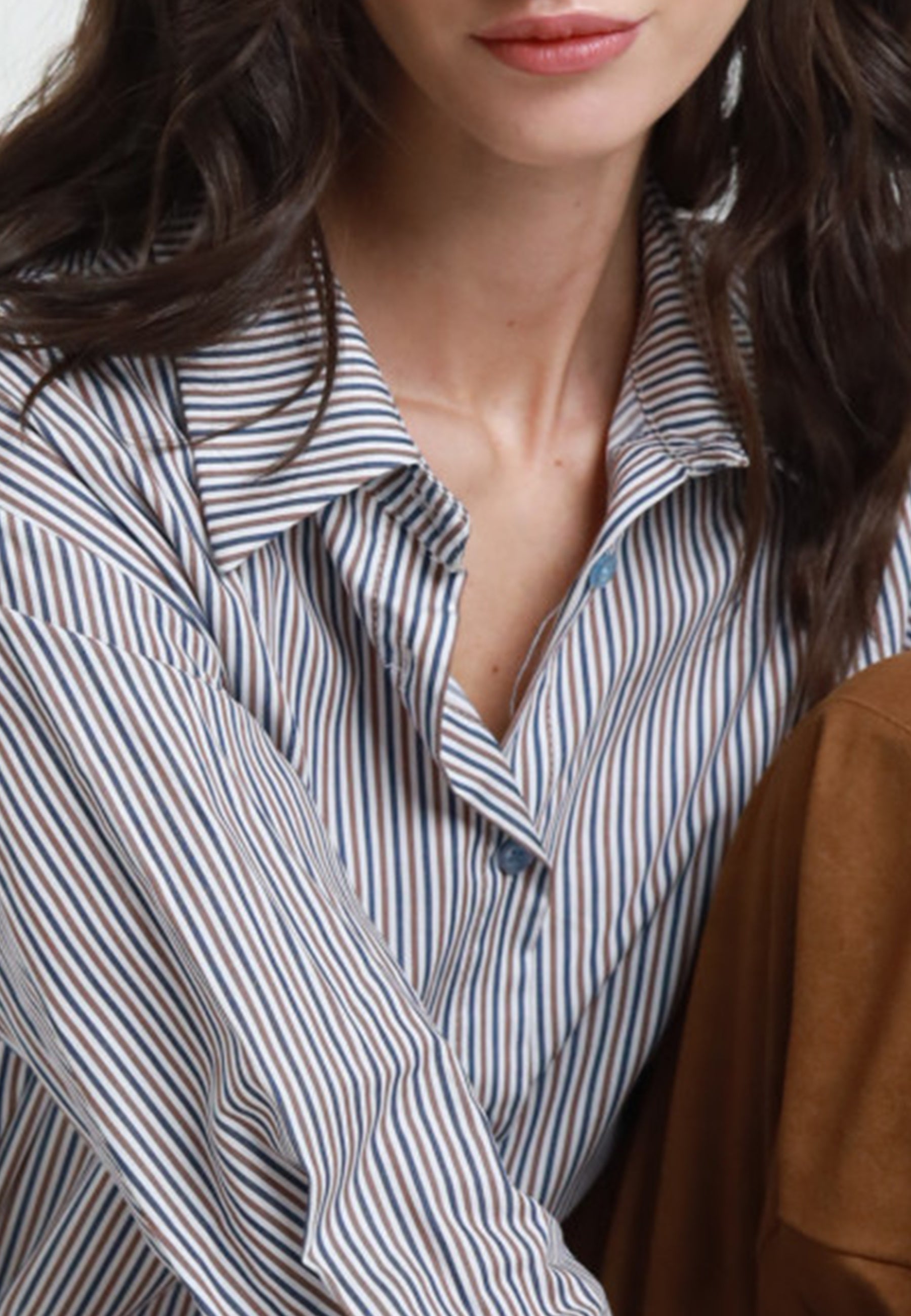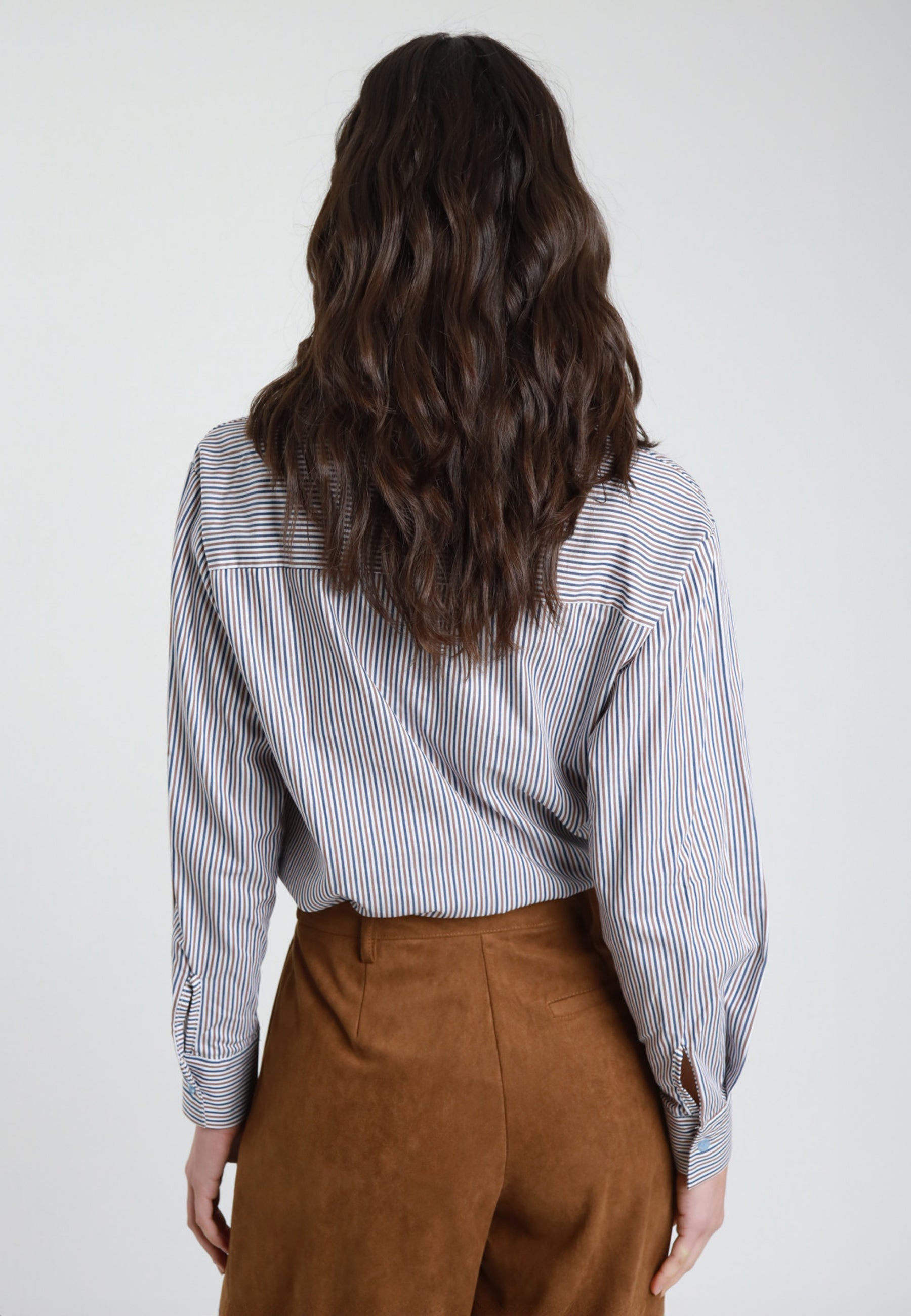 Emerge un modello in puro cotone leggero, caratterizzato da una raffinata fantasia a righe sottili che dona verticalità e un’eleganza naturale al capo. La linea è pulita e rilassata, con vestibilità confortevole che accompagna i movimenti senza costringere, rendendola perfetta per l’uso quotidiano.