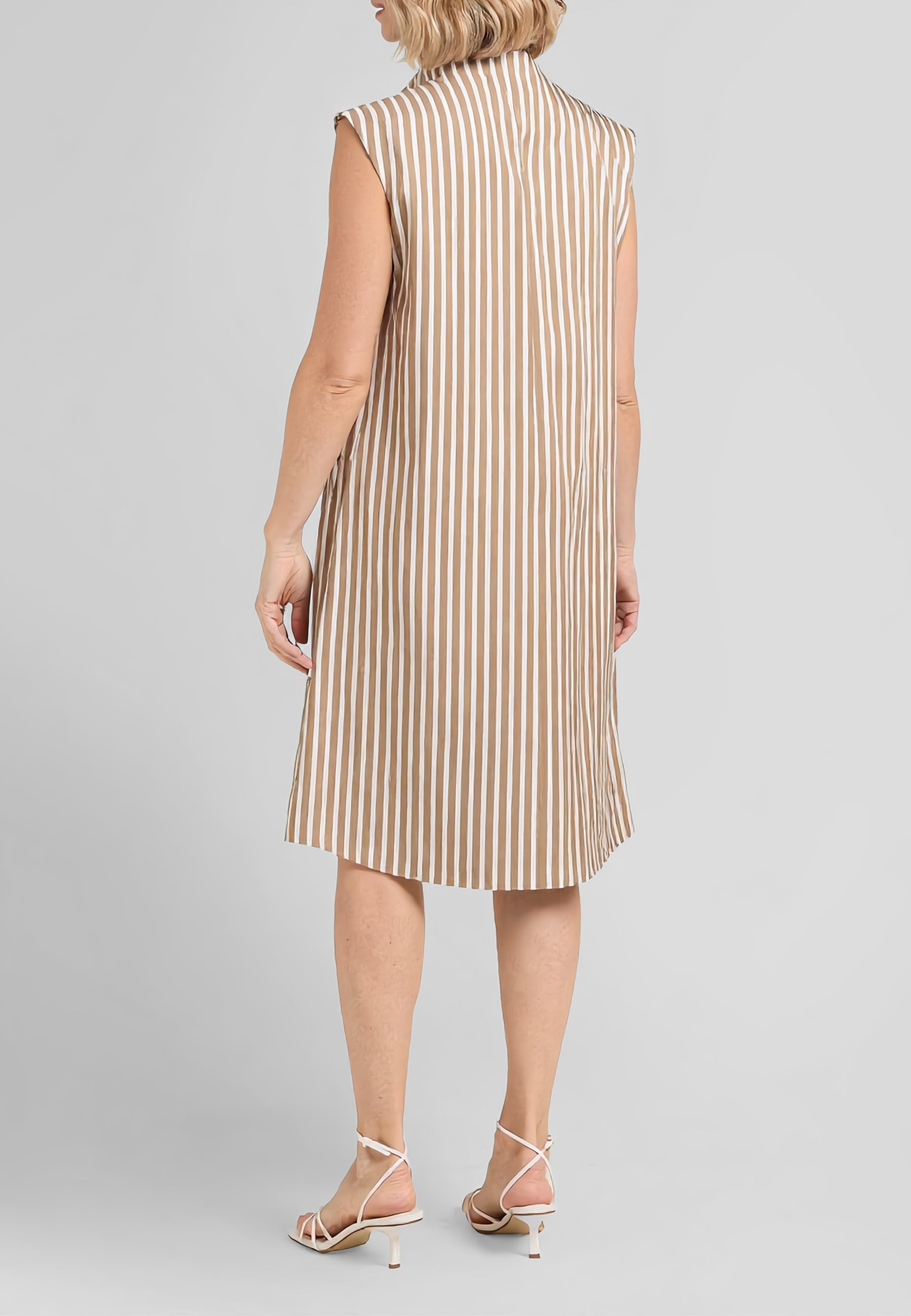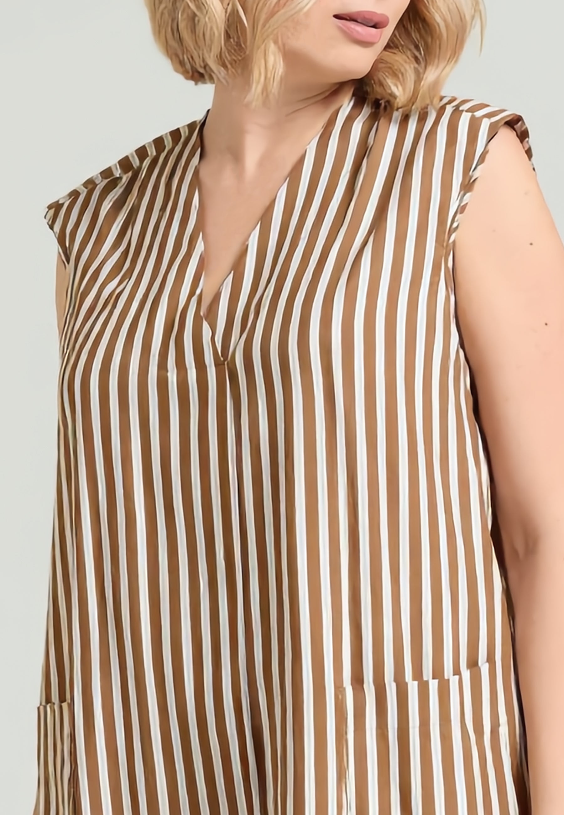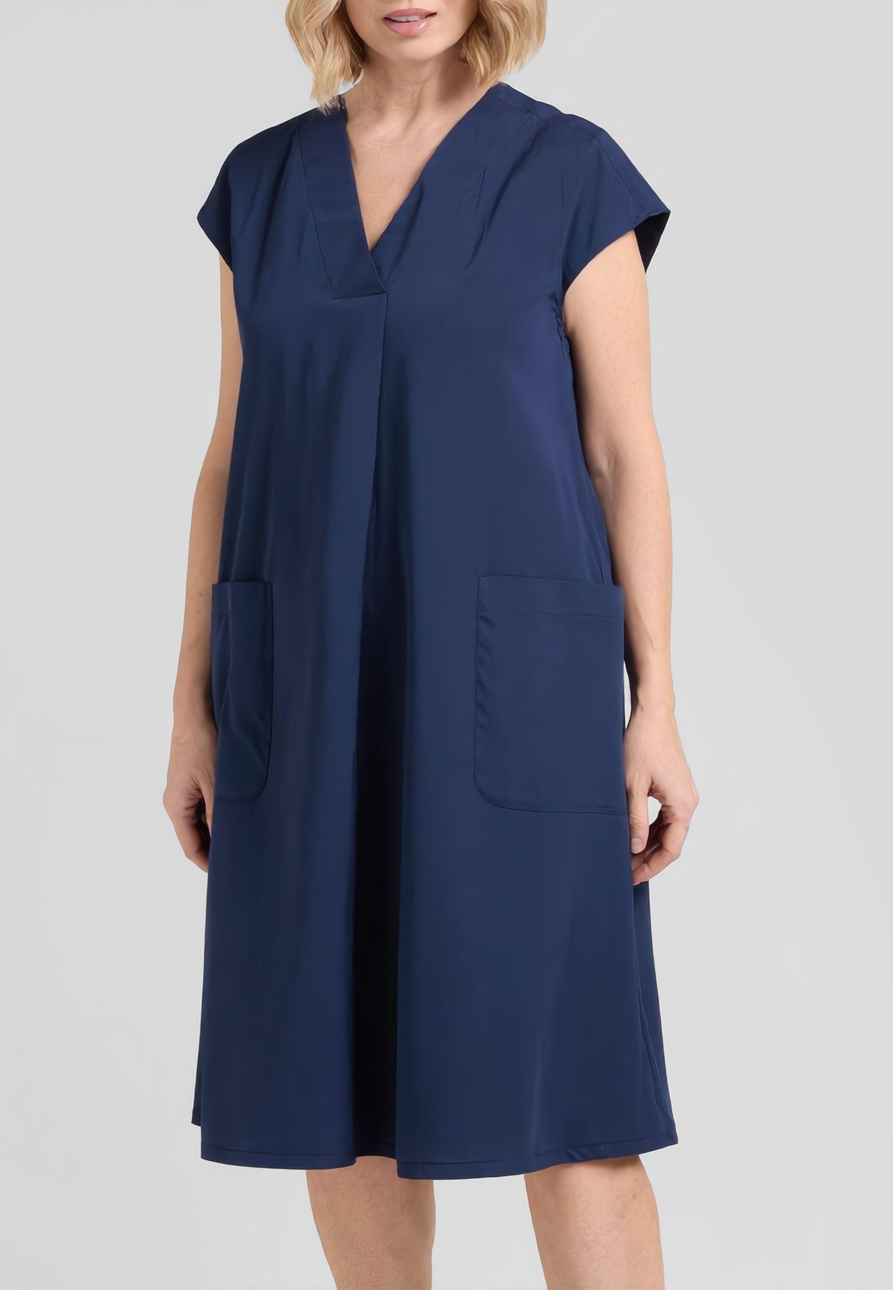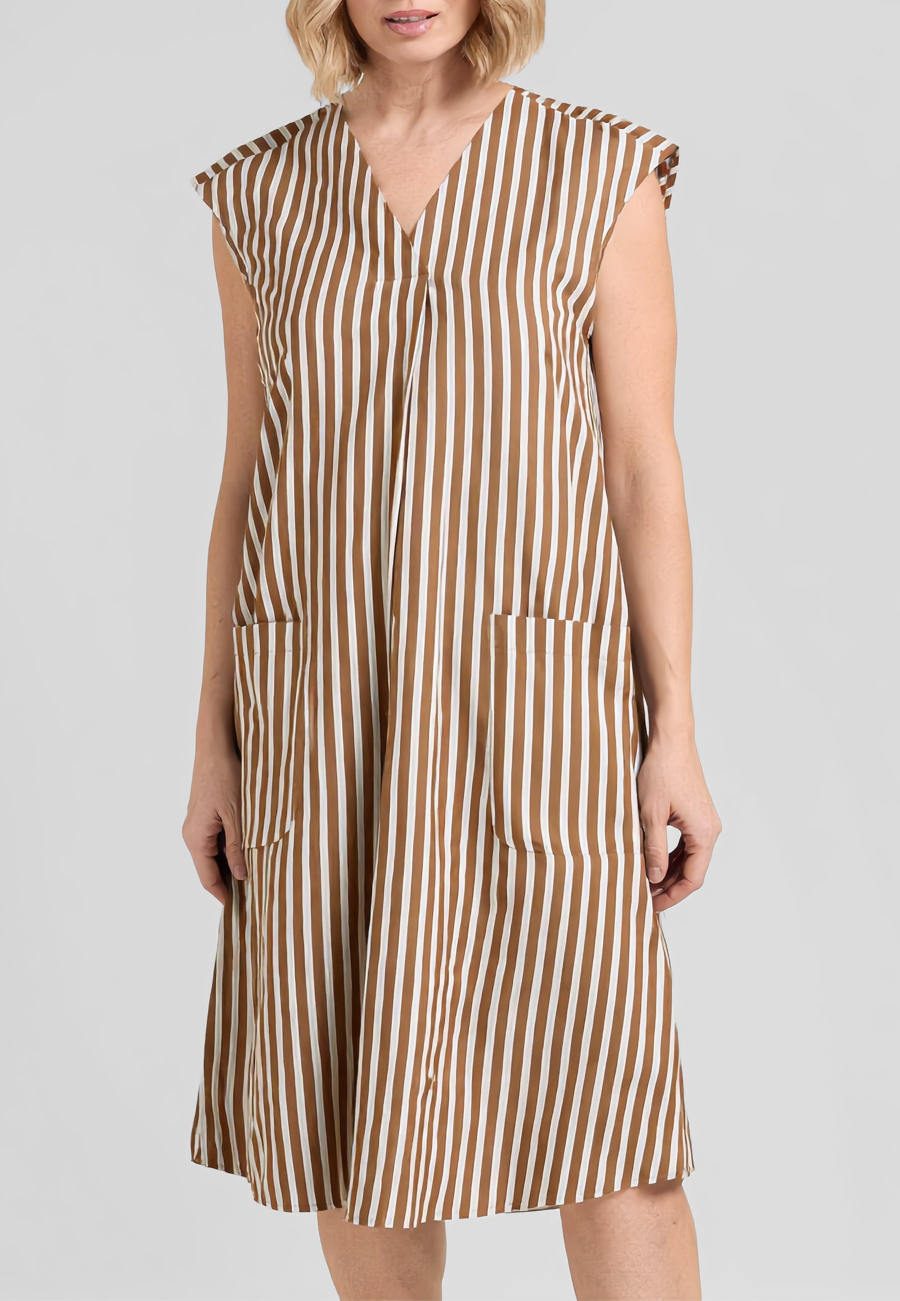 Abito donna Emme Marella smanicato con scollo a V e tasconi laterali in popeline di cotone, ideale per uno stile fresco, pratico ed elegante dal lavoro al tempo libero.