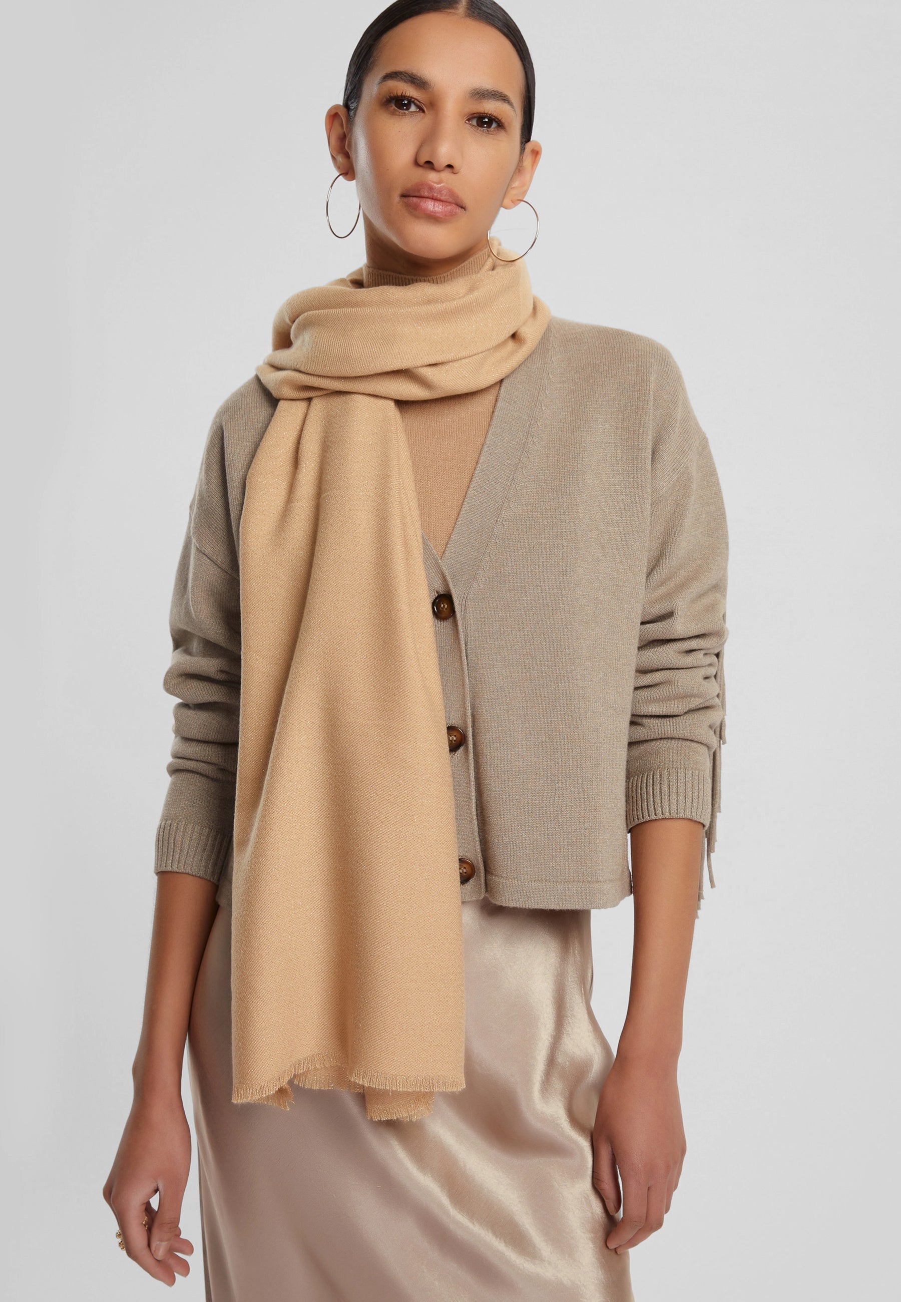 La sciarpa lunga EMME MARELLA è un accessorio elegante e raffinato, pensato per completare con stile ogni look. Realizzata in un pregiato mix di viscosa e filati lurex, questa sciarpa unisce morbidezza e leggerezza a un delicato effetto luminoso che cattura la luce con discrezione. La tinta unita la rende estremamente versatile, perfetta sia per gli outfit quotidiani che per le occasioni più speciali. Il design lungo consente di indossarla in diversi modi, avvolgendola attorno al collo o lasciandola cadere morbida sulle spalle. Un tocco di classe che arricchisce il guardaroba con sobria eleganza.
