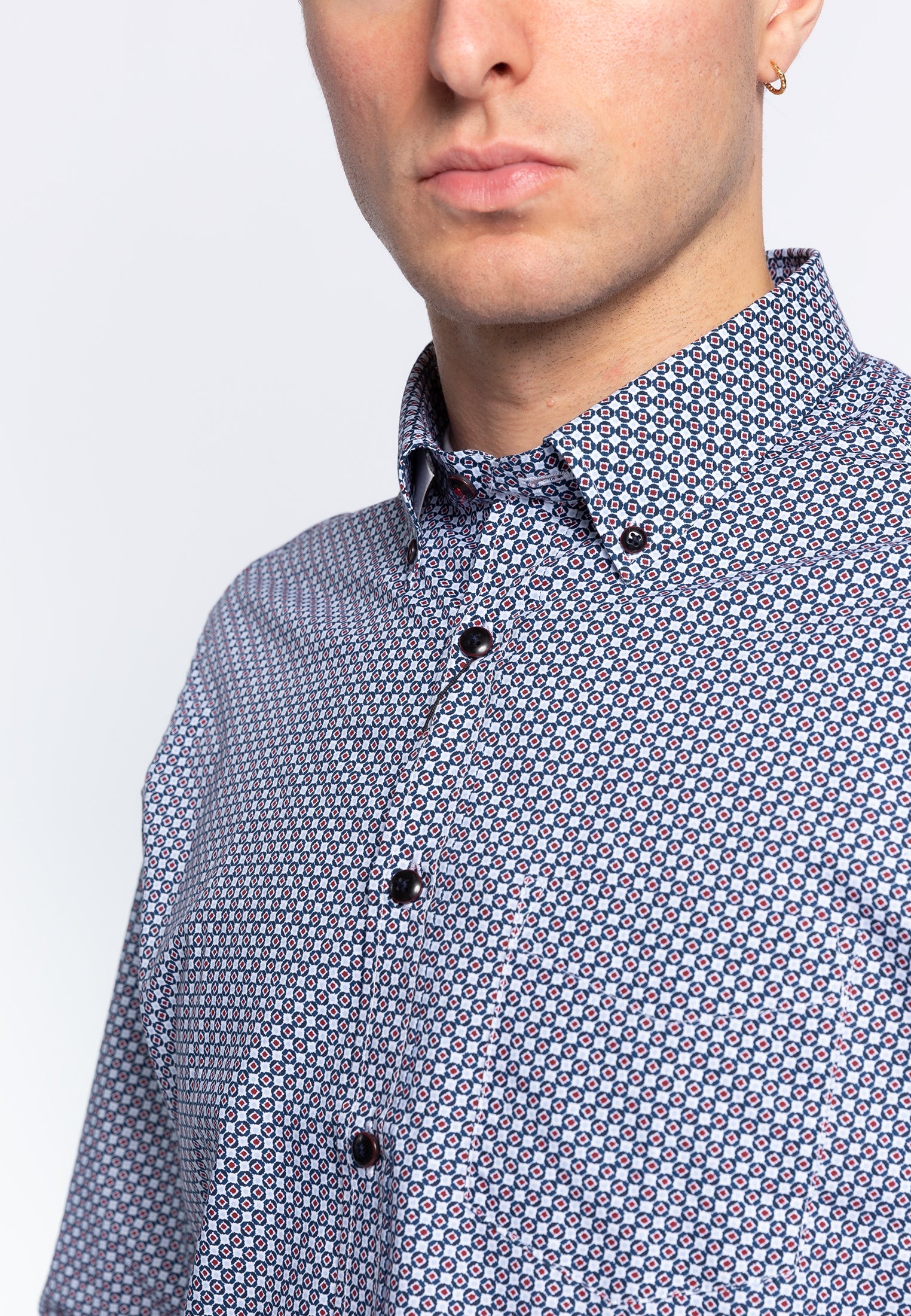 Aggiungi un tocco di lusso alla tua collezione di abbigliamento con questa camicia BUGATTI 9350-48802 in microfantasia geometrica. Ideale per un look classico o moderno, è ottimamente confortevole ed elegante, con maniche lunghe, collo botton down e bottoni in contrasto.