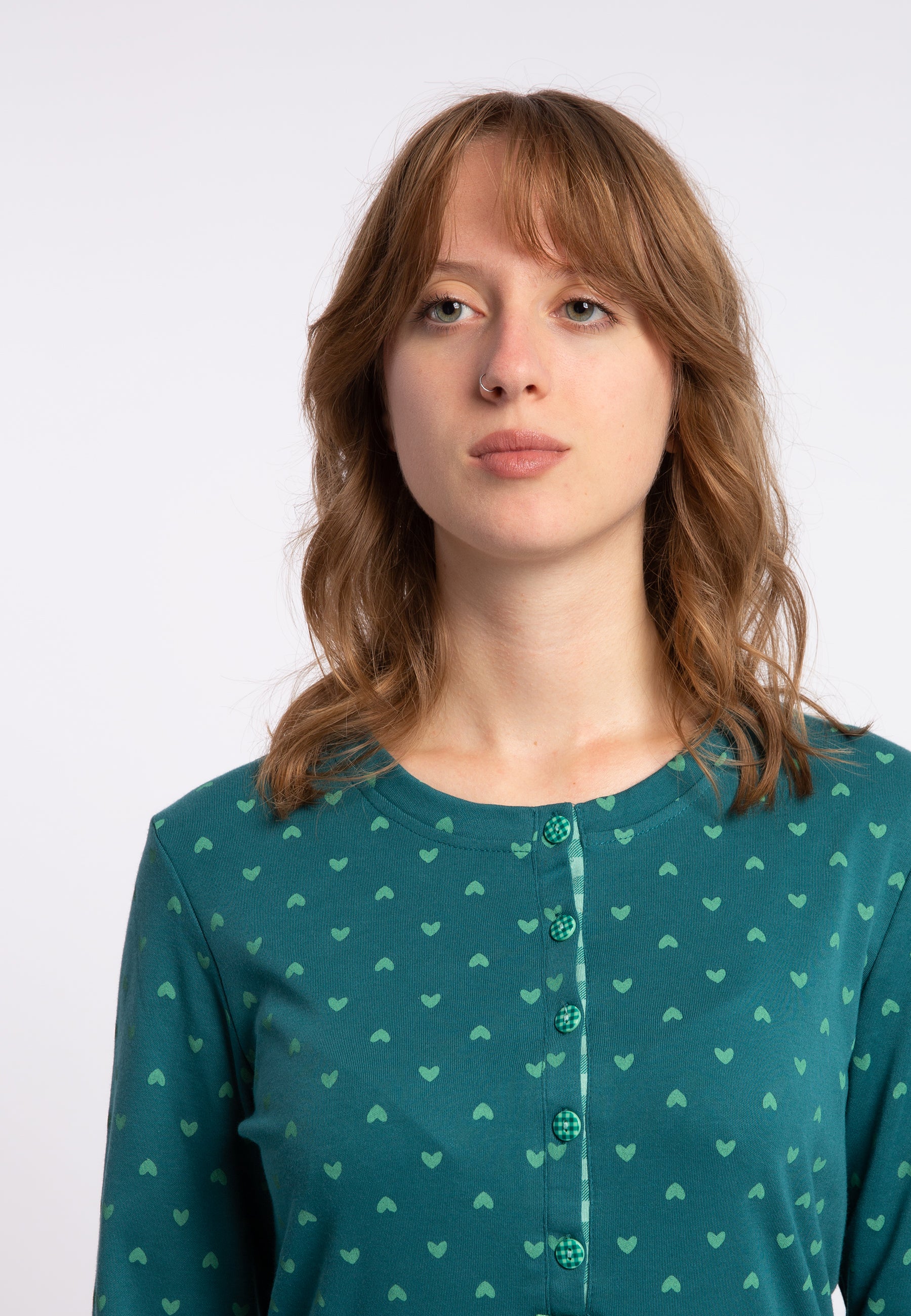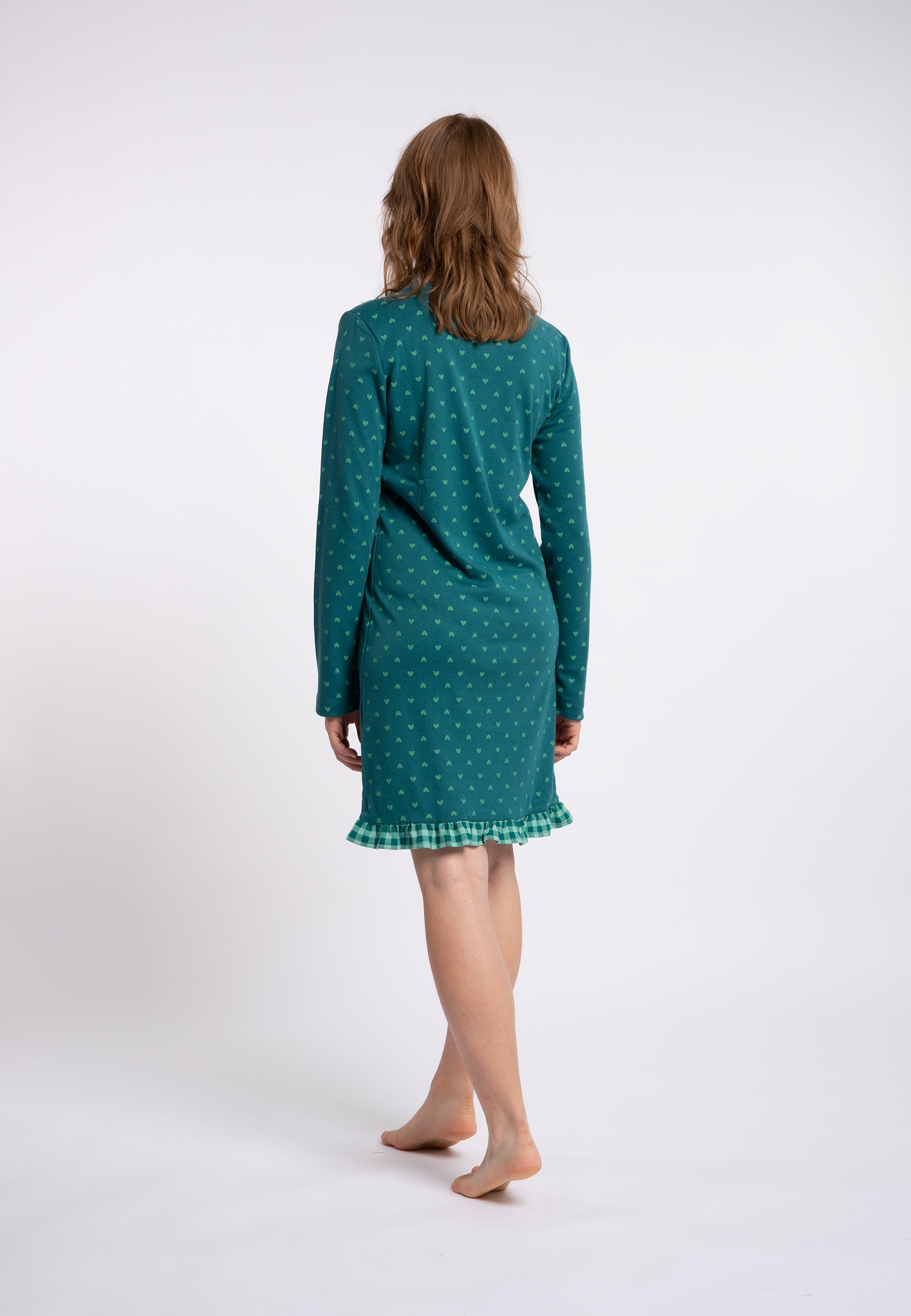 Questa camicia da notte da donna della Noi di Notte ti accoglierà con morbidezza e comfort grazie alla sua morbida maglia interlock di cotone felpato. Perfetta per le serate fresche, presenta una fantasiosa stampa di cuoricini e maniche lunghe per un look dolce e romantico.