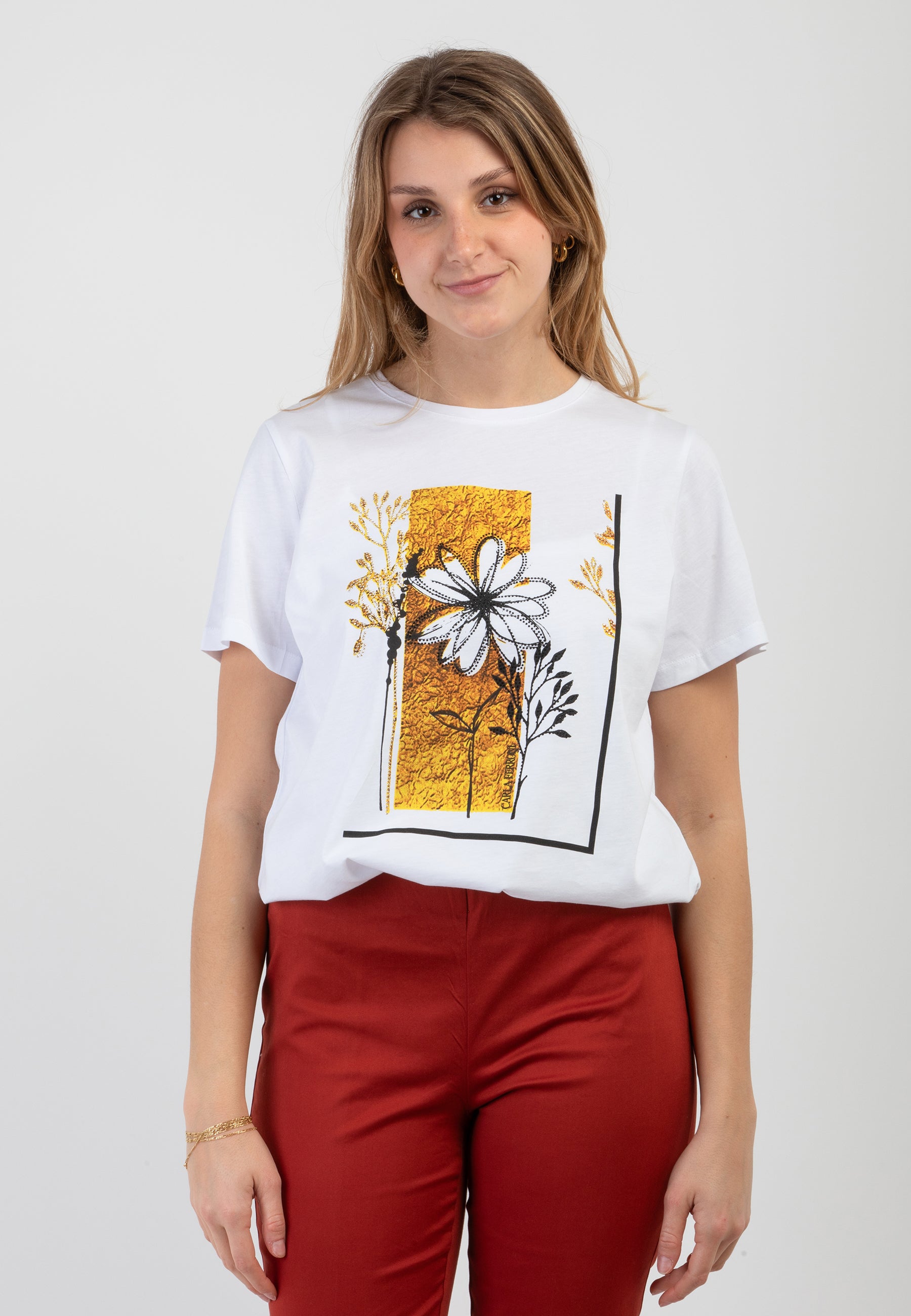 La T-shirt a mezza manica di CARLA FERRONI è il capo ideale per chi cerca un look casual ma con un tocco di eleganza. Realizzata in puro cotone, questa maglia offre una vestibilità comoda e traspirante, perfetta per ogni stagione. La stampa raffinata e le applicazioni di strass aggiungono un dettaglio di luminosità che rende questa T-shirt un pezzo unico nel tuo guardaroba. Facile da abbinare a jeans, pantaloni o gonne, questa T-shirt è un'ottima scelta per un look moderno e sofisticato, perfetto per diverse occasioni, dal giorno alla sera. Con il suo stile semplice ma ricercato, diventerà presto un capo irrinunciabile per ogni donna che ama distinguersi con eleganza.
