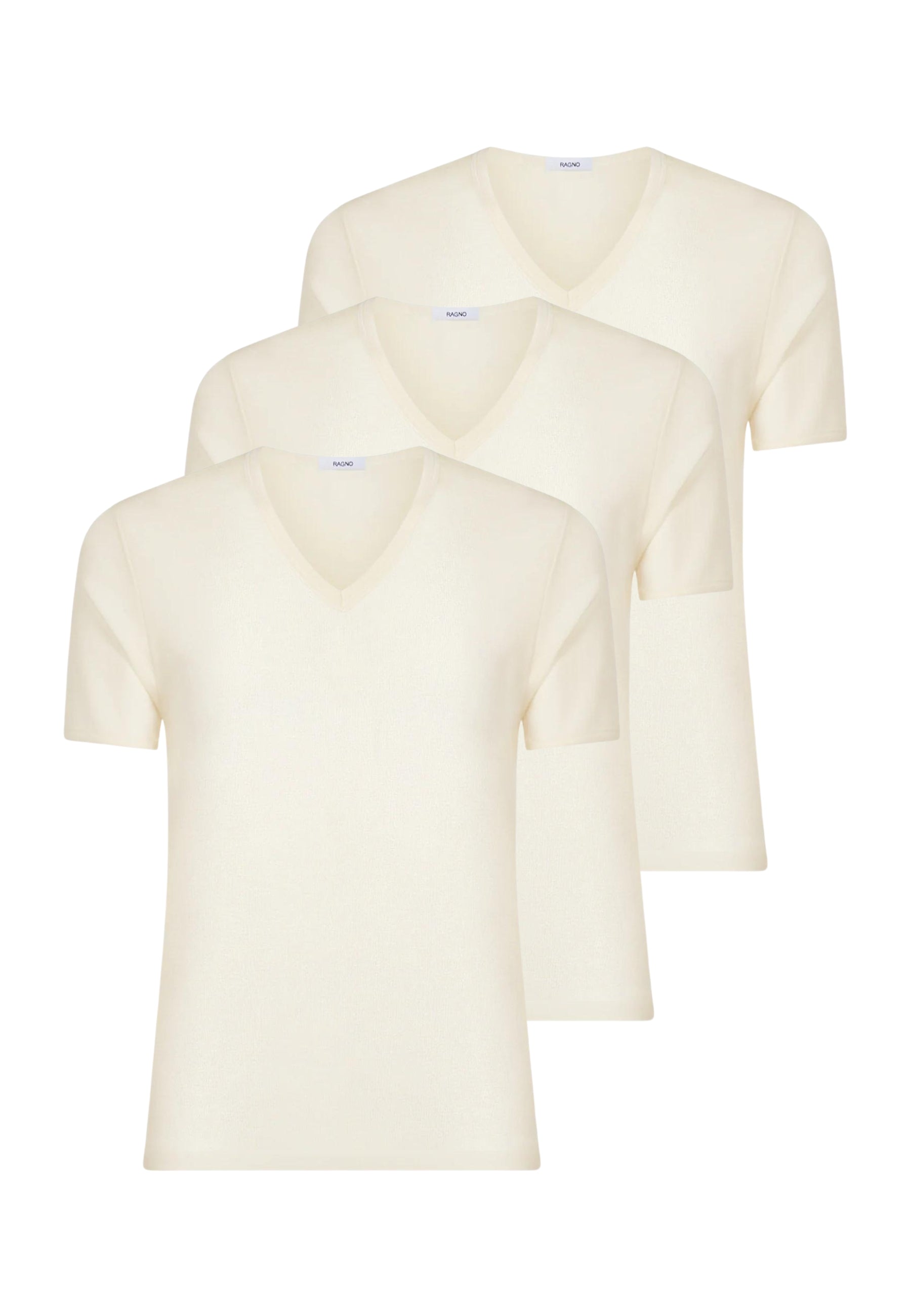 3 Magliette intima uomo con scollo a V e manica corta in maglia unita di pura lana merino di peso medio articolo RAGNO 060038. Capo realizzato in pura lana merino extrafine dalle rinomate proprietà termoregolanti e naturale elasticità della lana tessute in maglia unita di peso medio. (Il prezzo si riferisce alla confezione da 3 t-shirt).