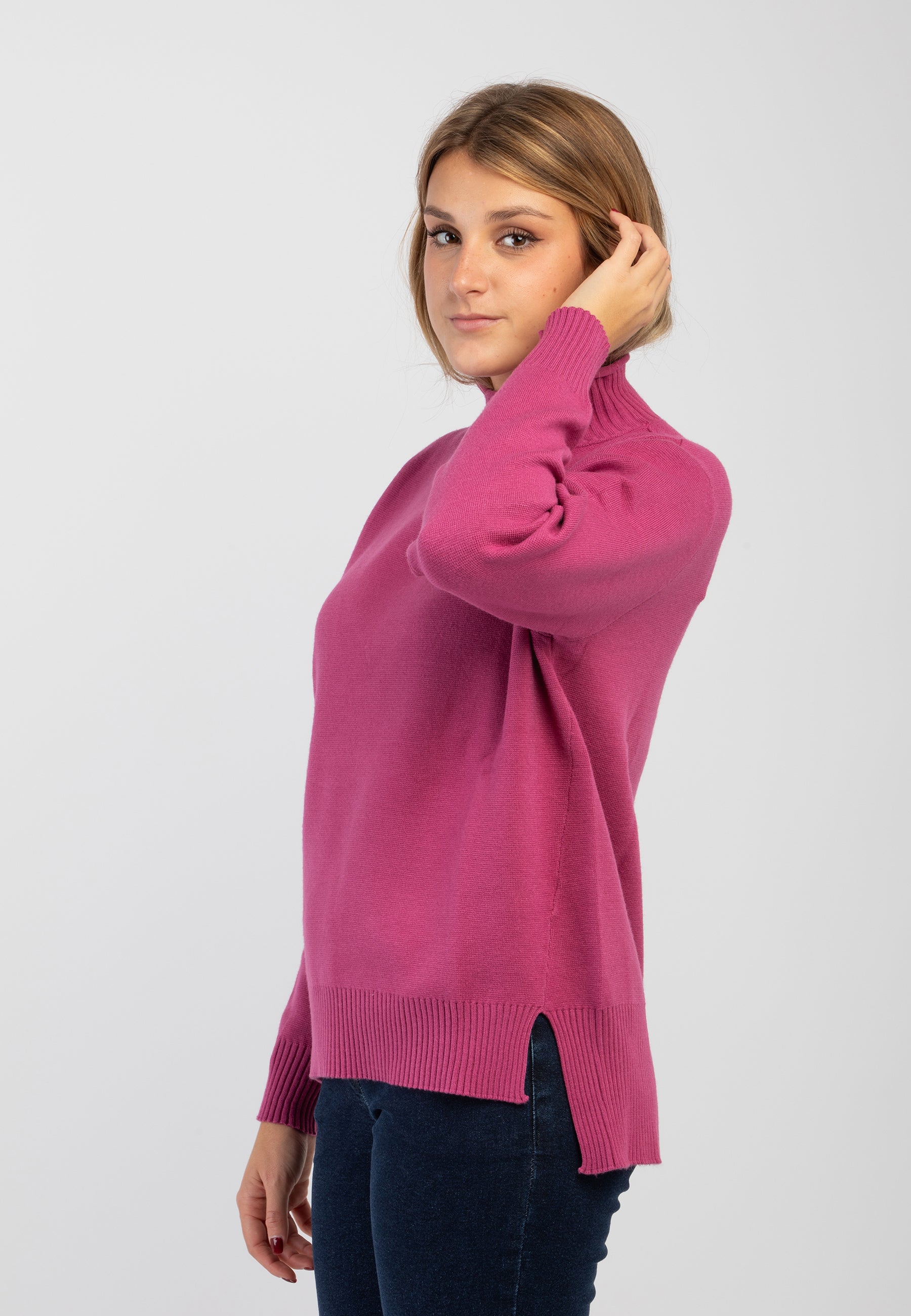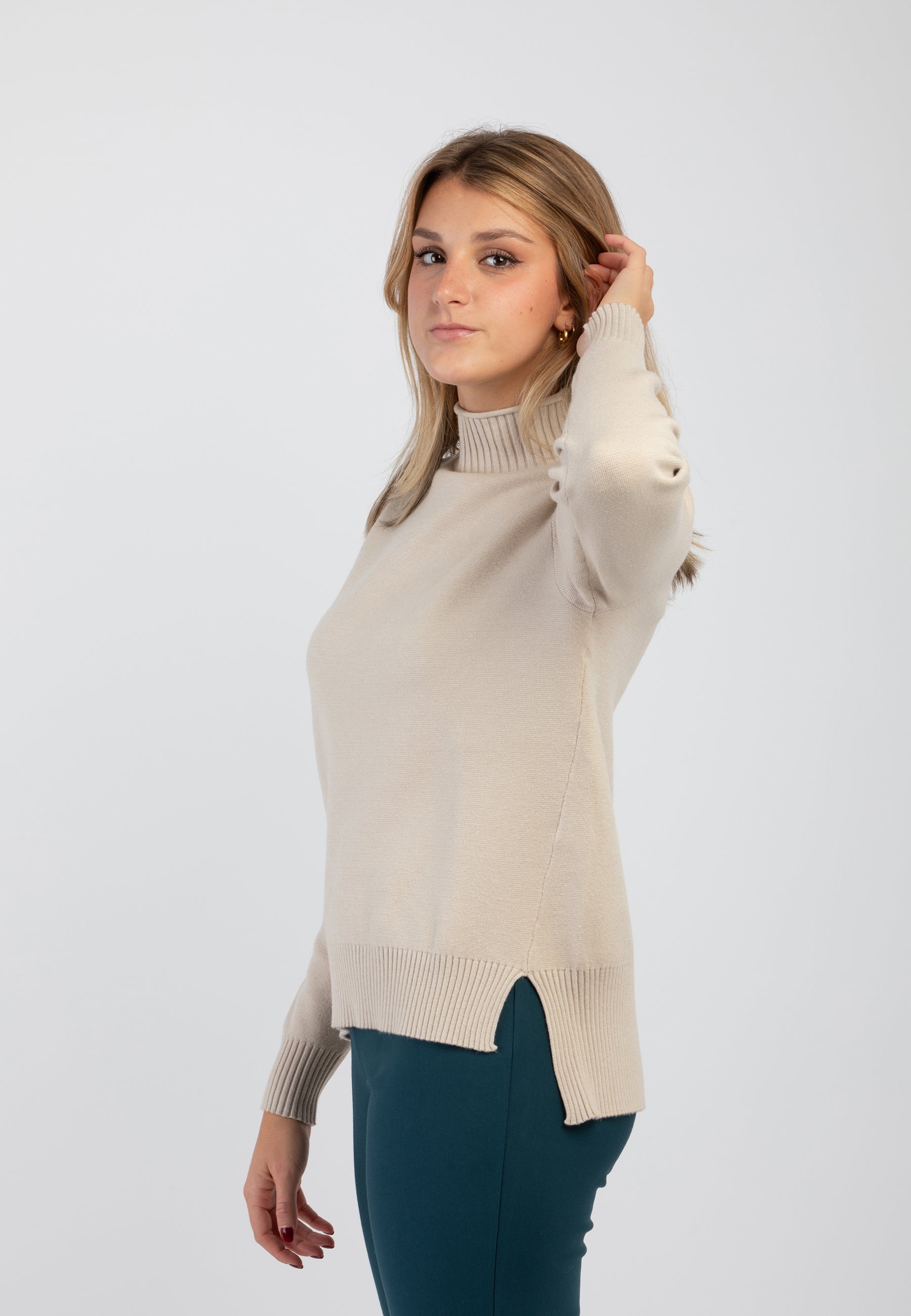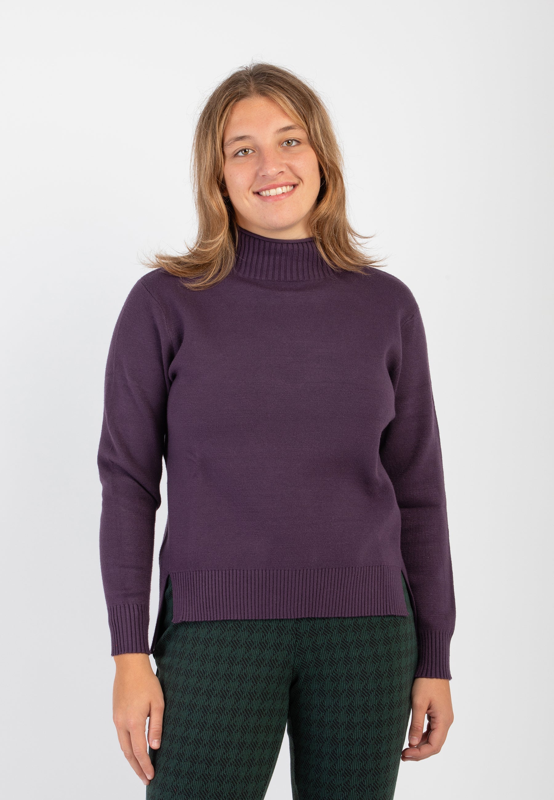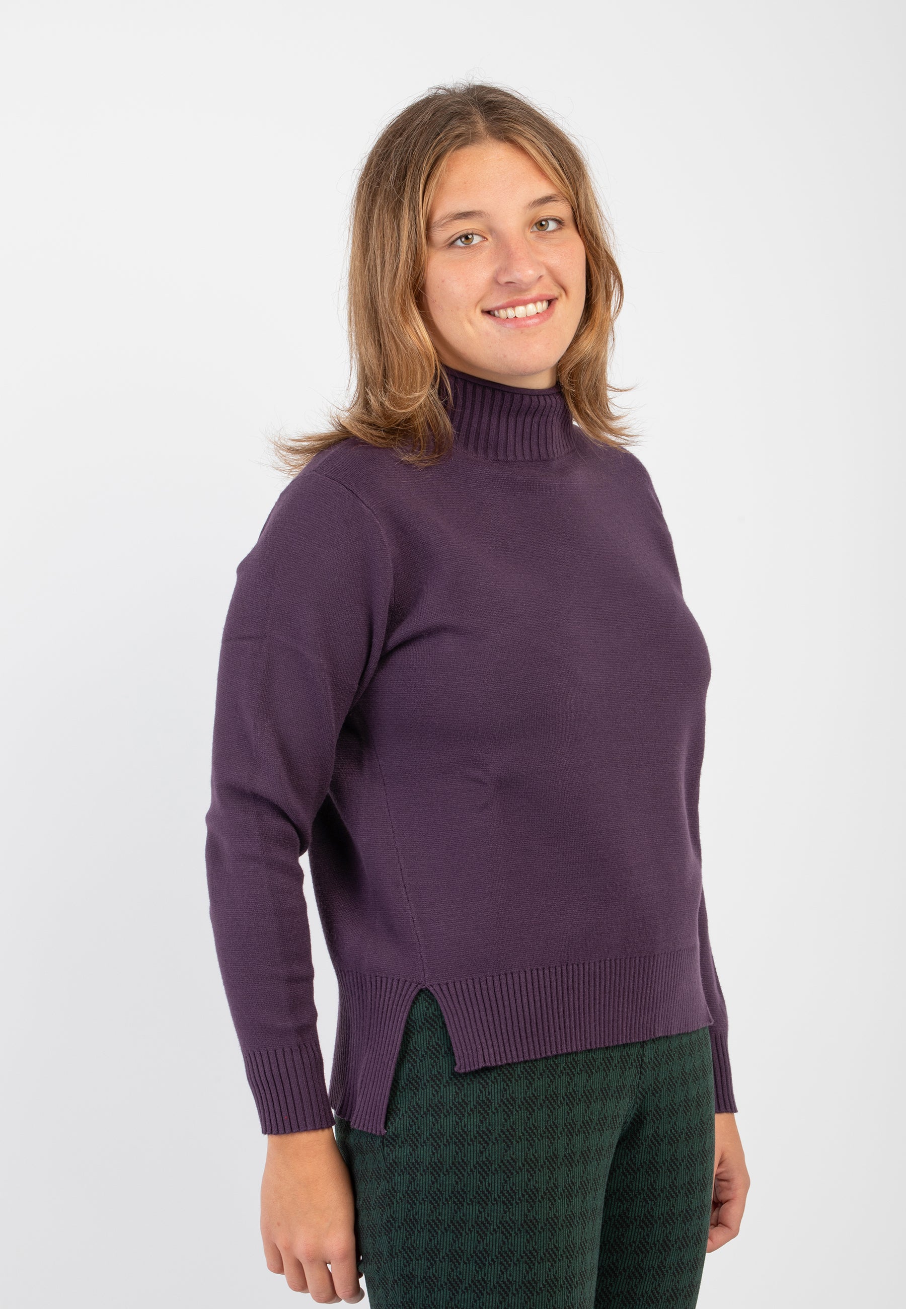 La Maglia a lupetto da donna in viscosa è caldo, morbido e pratico con una tessitura finezza 12. Le aperture laterali, i polsini e il design asimmetrico lo rendono moderno e dinamico. La vestibilità boxy e il collo lupetto offrono comfort e protezione durante le giornate più fredde.