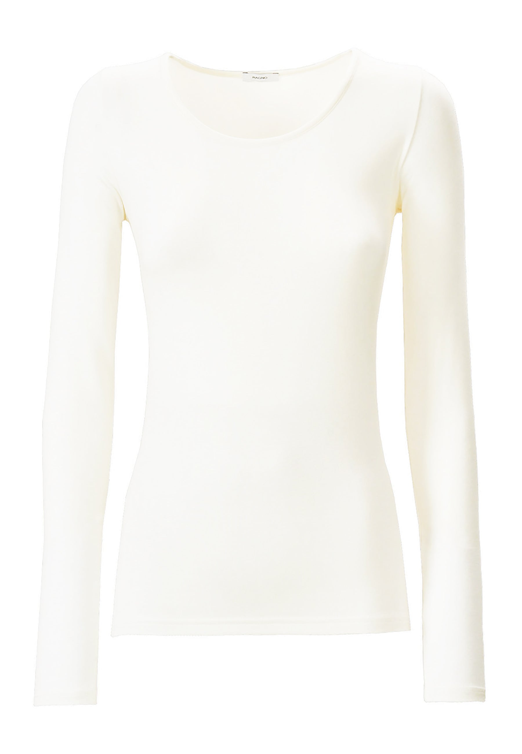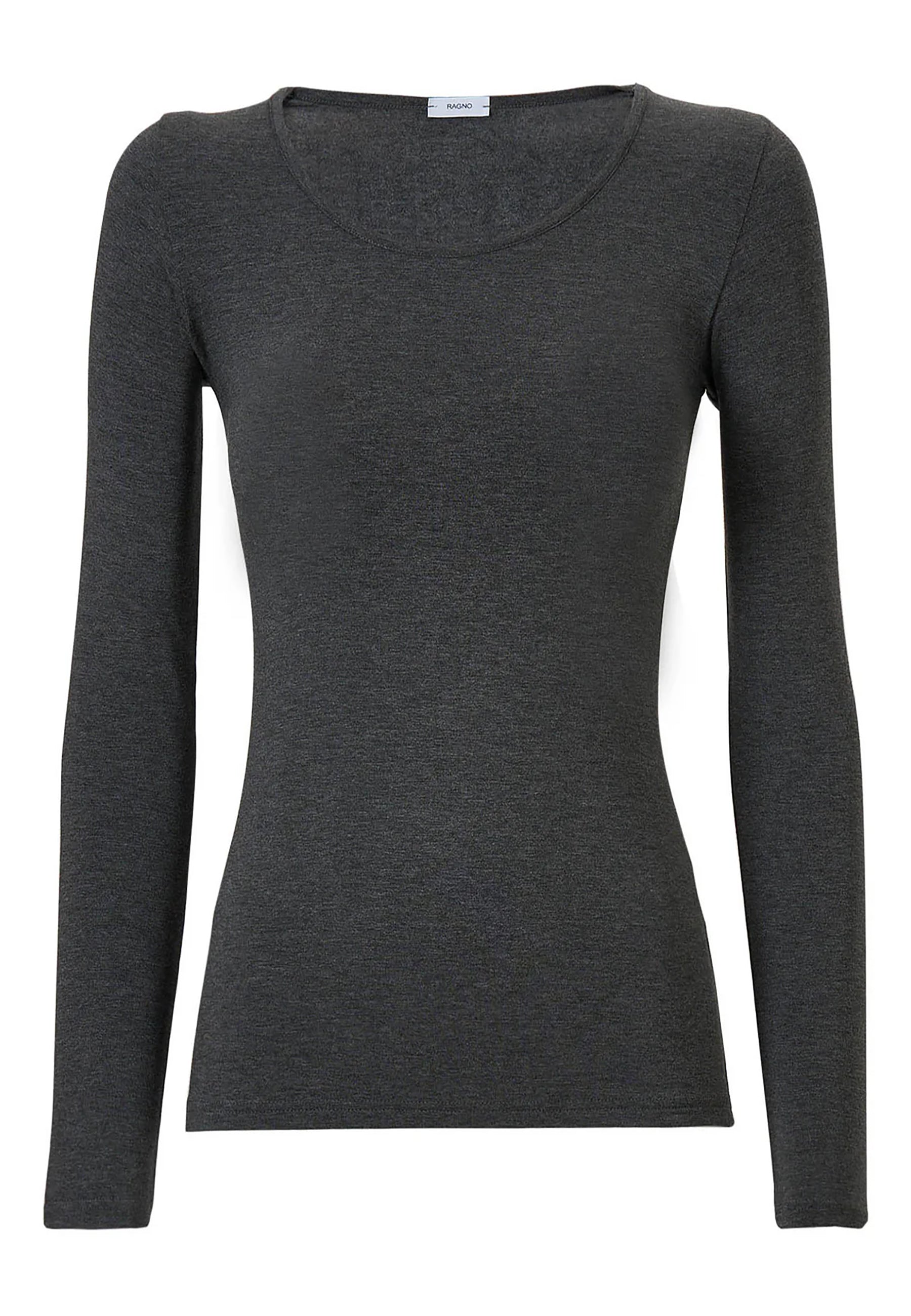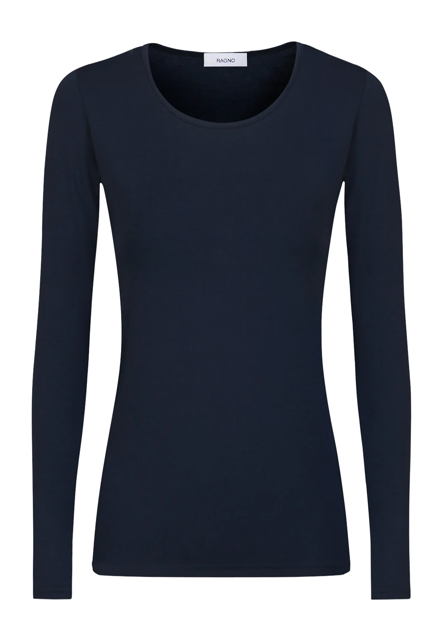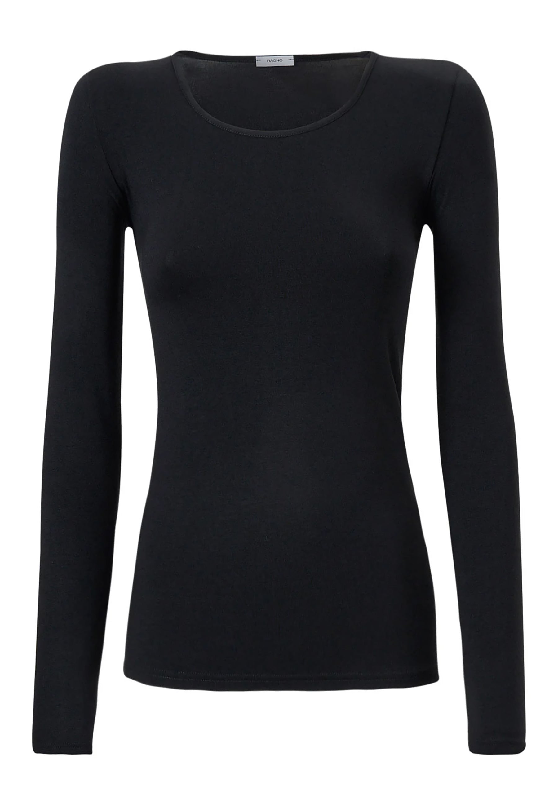 Maglietta girocollo da donna in jersey di viscosa elasticizzata della line Perfetta di Ragno, modello girocollo e manica lunga dalla vestibilità skinny che segue le forme del corpo. Perfetta da indossare sotto un maglione o un blazer senza ingombrare. Realizzata in Eco Viscosa, jersey di viscosa lucente e delicata anche sulle pelli più sensibili ma allo stesso tempo resistente e traspirante. Comoda, pratica e lavabile in lavatrice.
