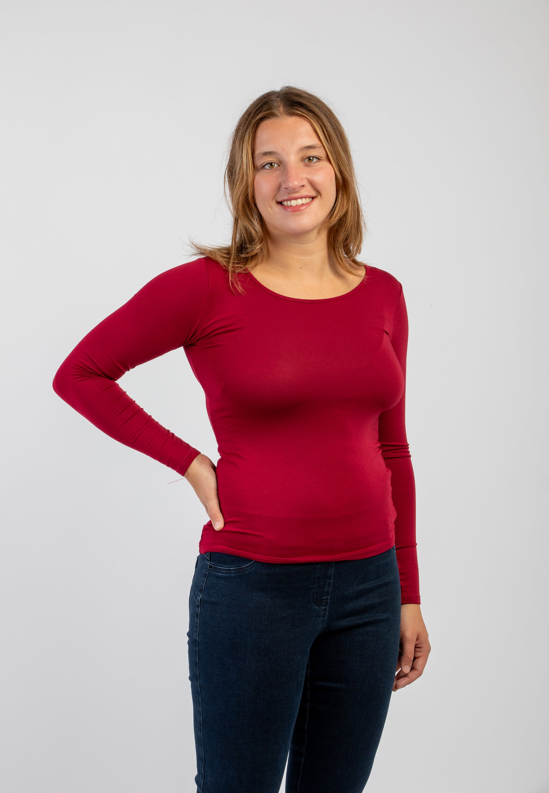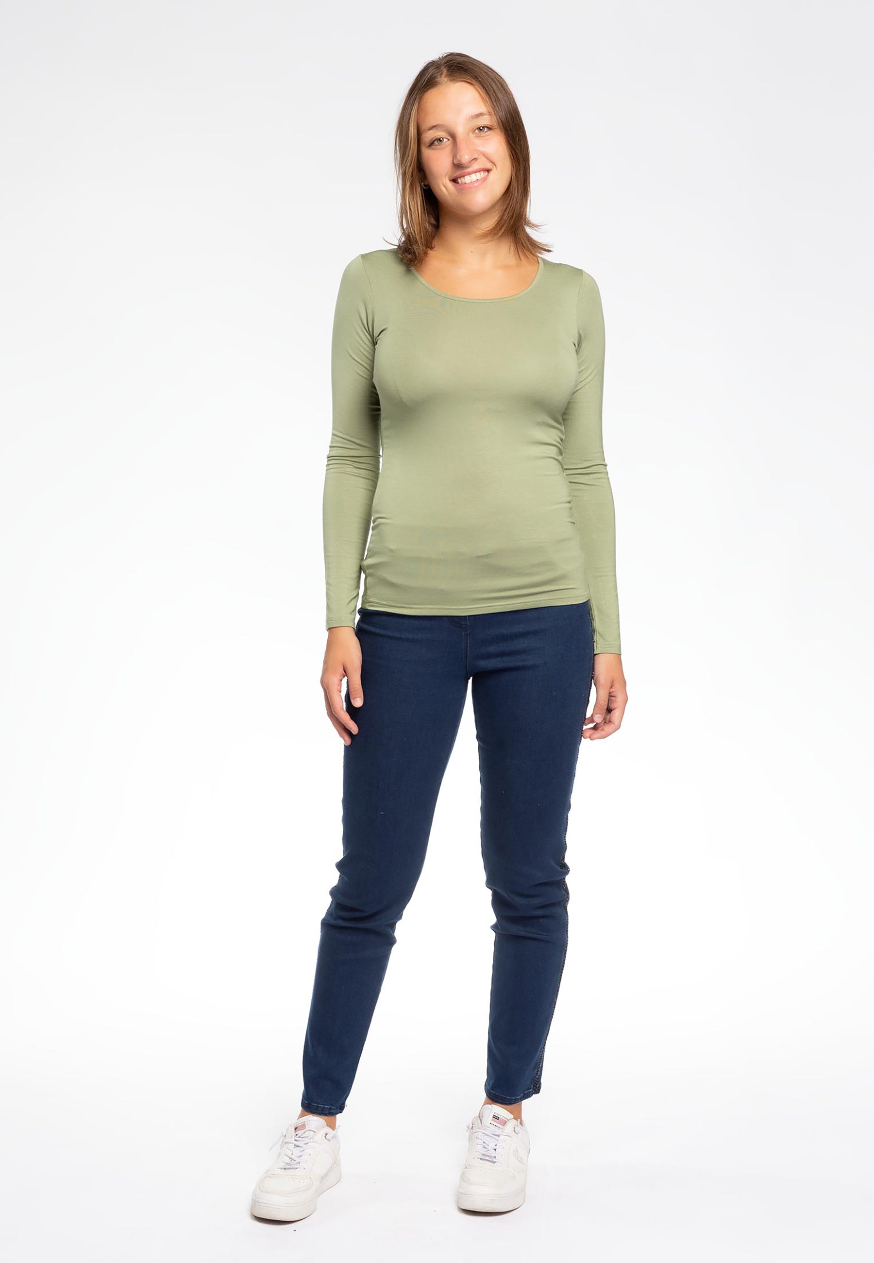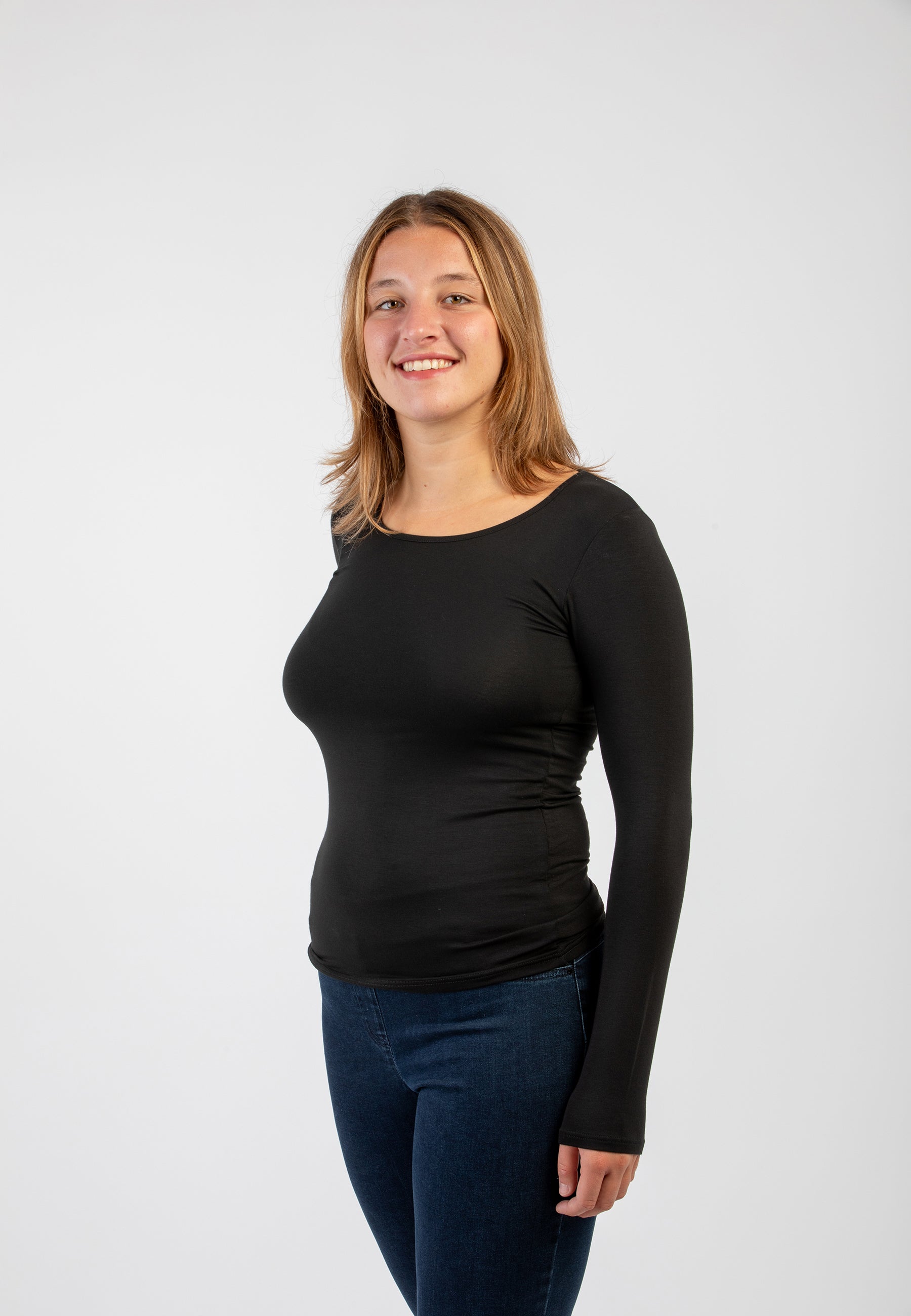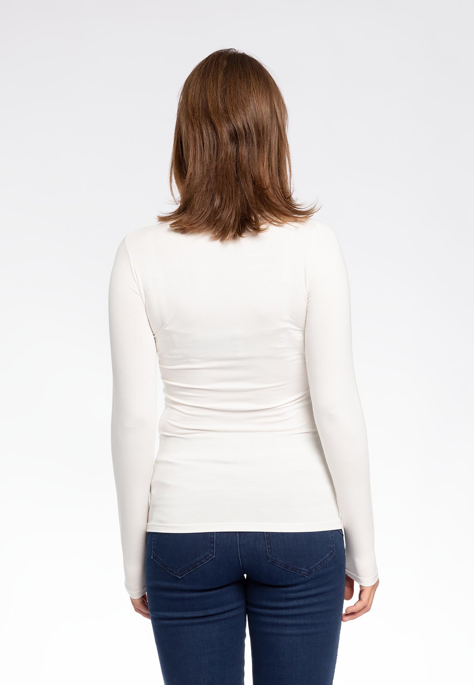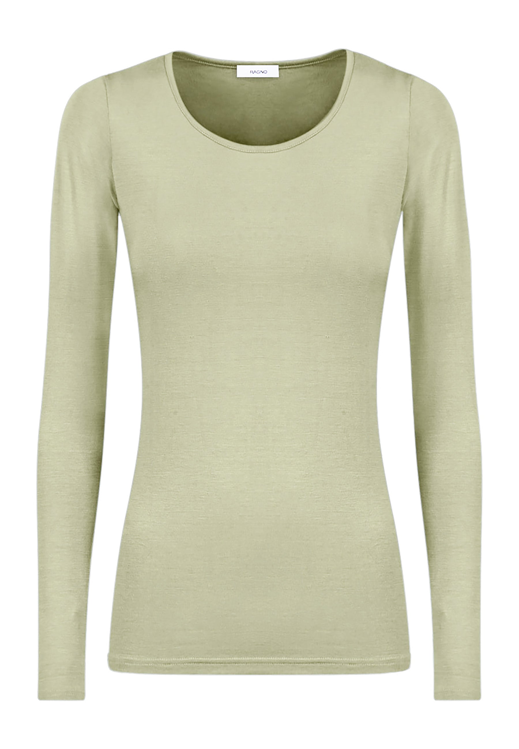 Maglietta girocollo da donna in jersey di viscosa elasticizzata della line Perfetta di Ragno, modello girocollo e manica lunga dalla vestibilità skinny che segue le forme del corpo. Perfetta da indossare sotto un maglione o un blazer senza ingombrare. Realizzata in Eco Viscosa, jersey di viscosa lucente e delicata anche sulle pelli più sensibili ma allo stesso tempo resistente e traspirante. Comoda, pratica e lavabile in lavatrice.