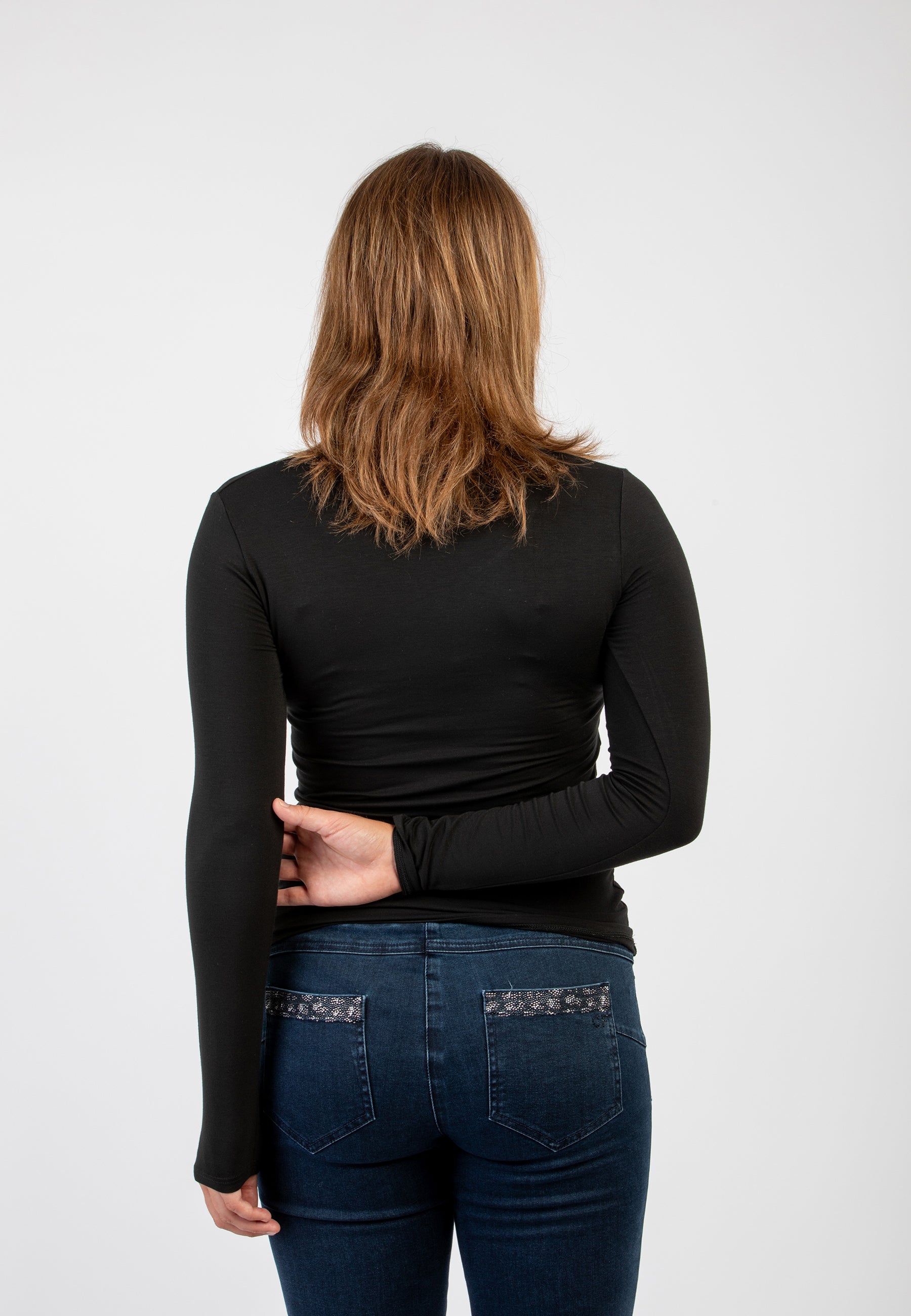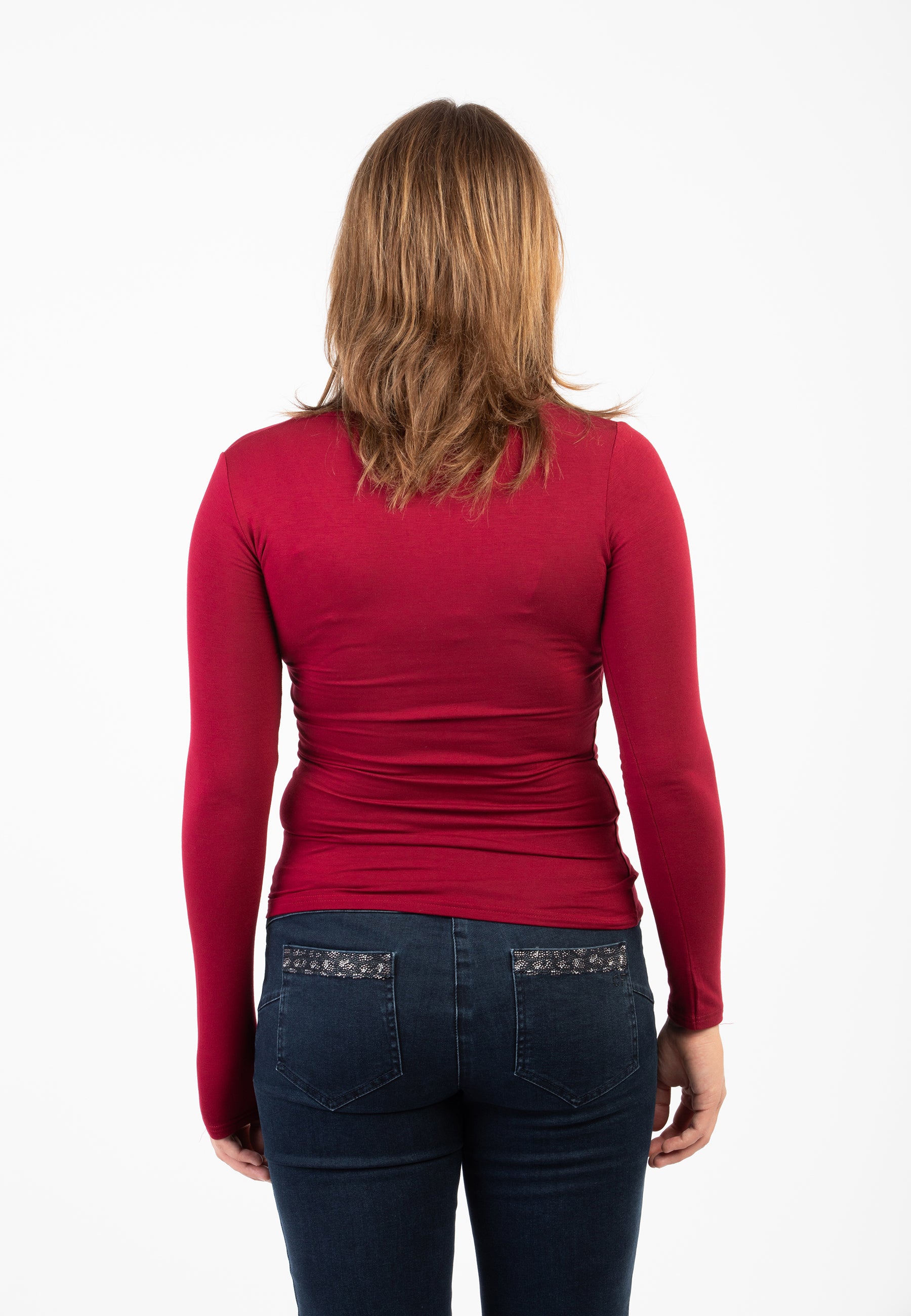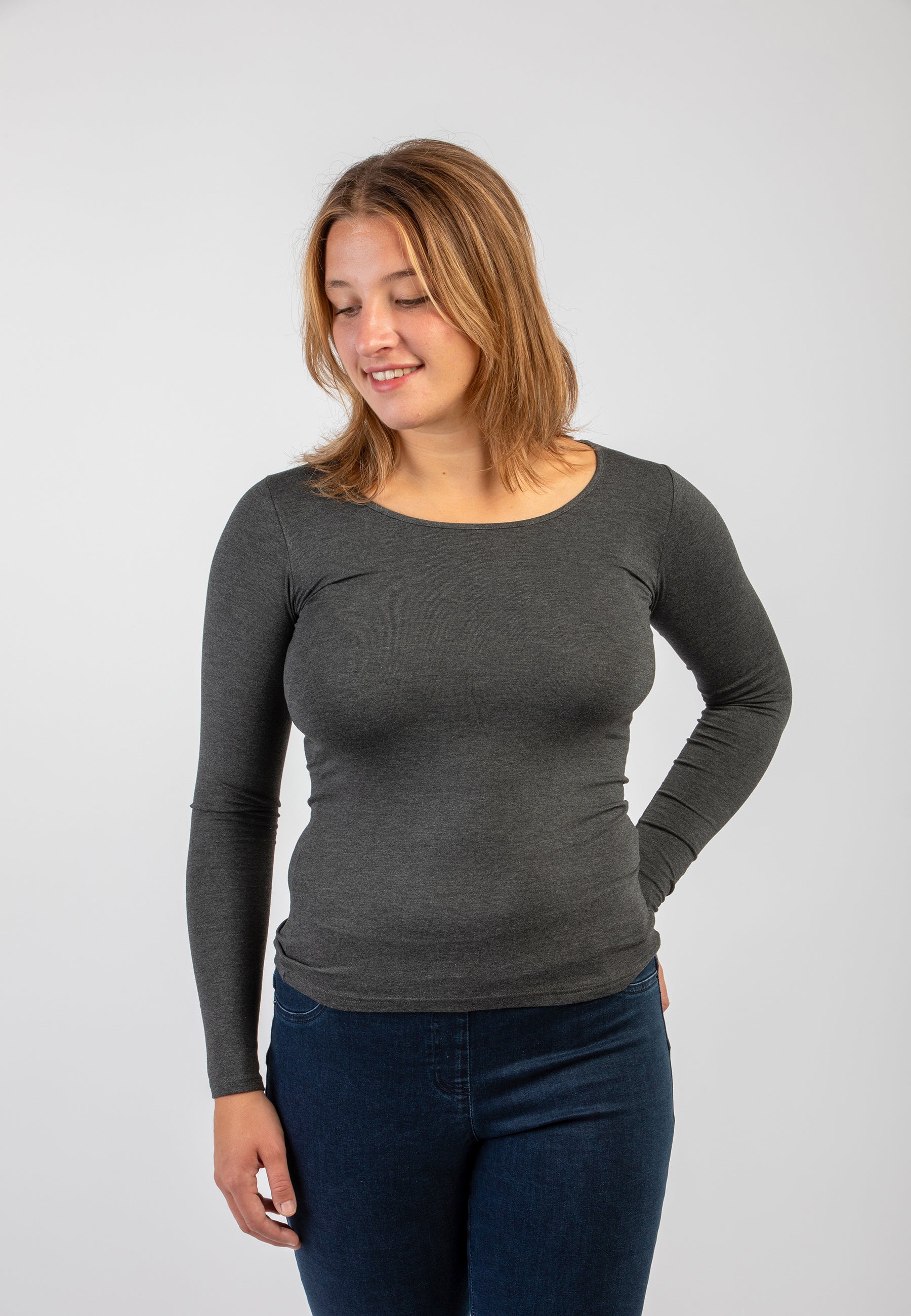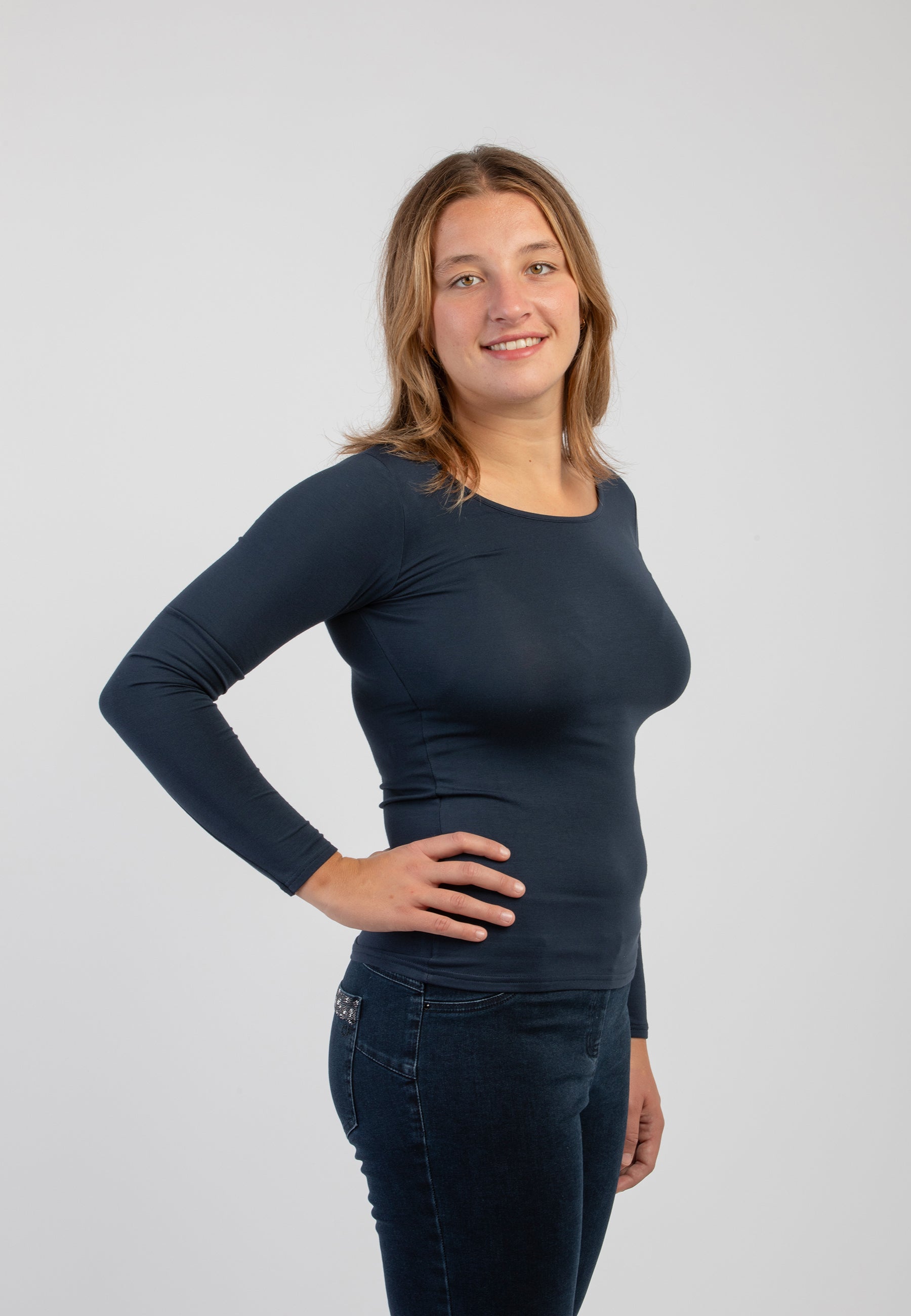 Maglietta girocollo da donna in jersey di viscosa elasticizzata della line Perfetta di Ragno, modello girocollo e manica lunga dalla vestibilità skinny che segue le forme del corpo. Perfetta da indossare sotto un maglione o un blazer senza ingombrare. Realizzata in Eco Viscosa, jersey di viscosa lucente e delicata anche sulle pelli più sensibili ma allo stesso tempo resistente e traspirante. Comoda, pratica e lavabile in lavatrice.