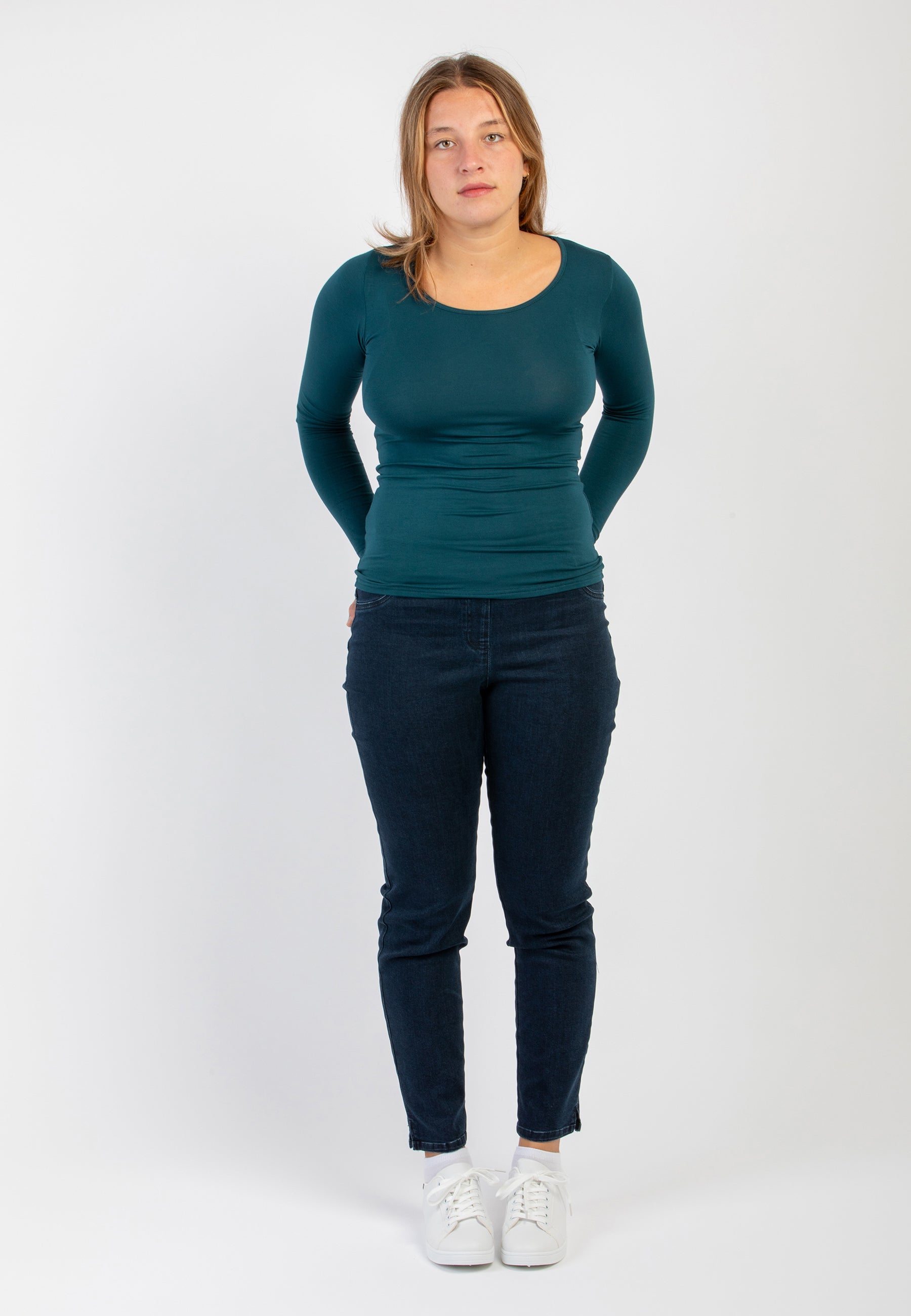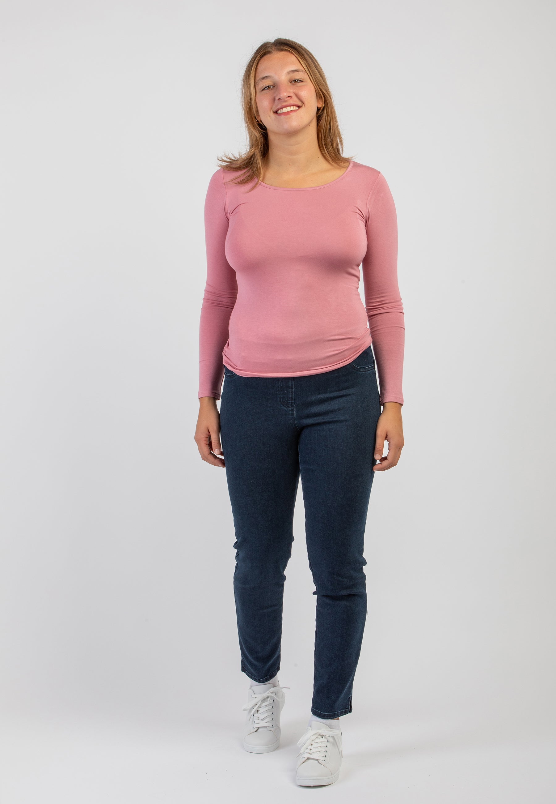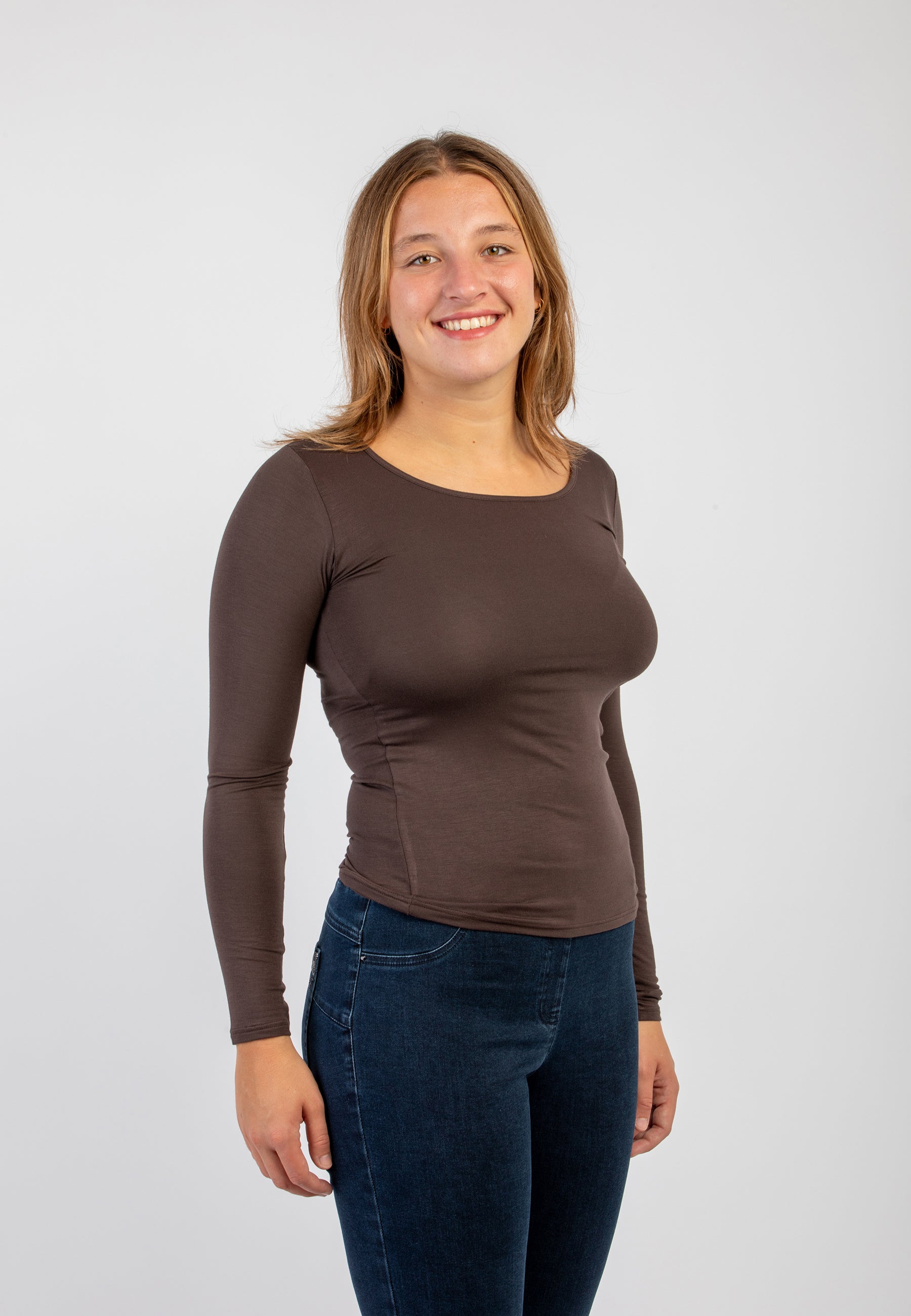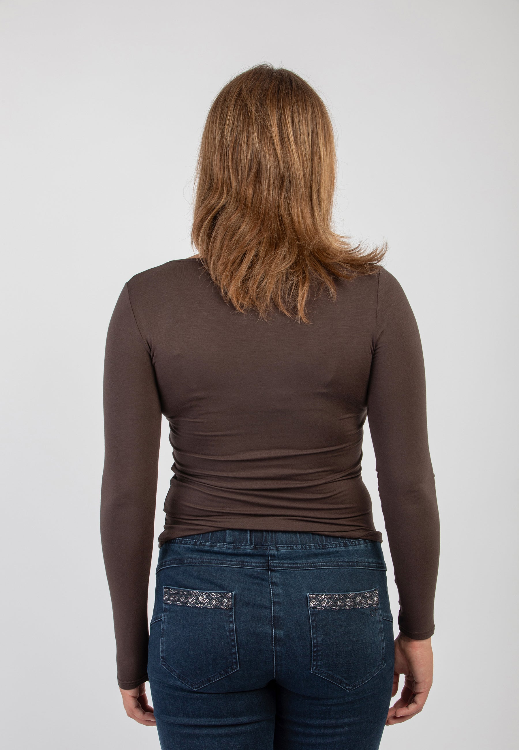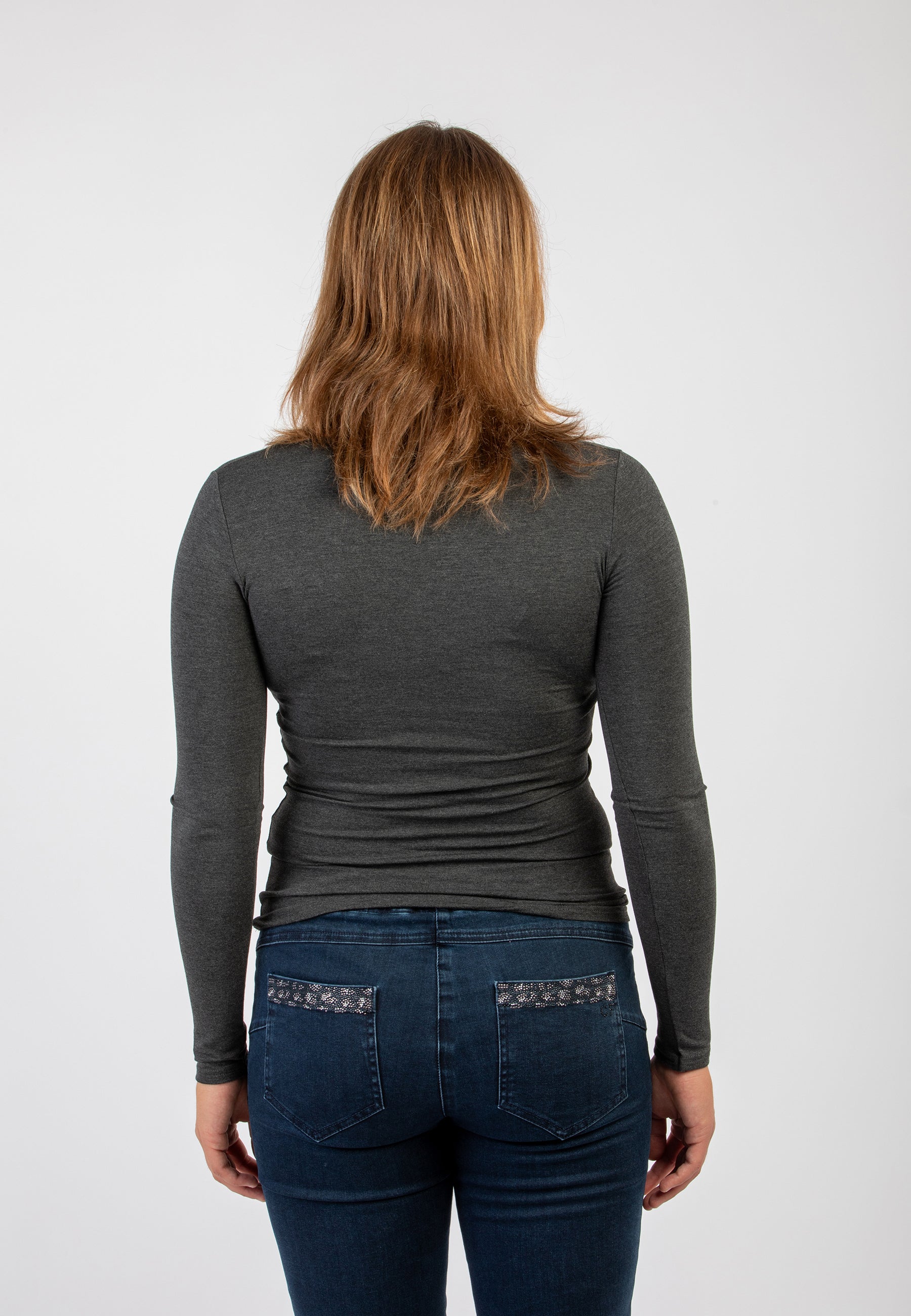 Maglietta girocollo da donna in jersey di viscosa elasticizzata della line Perfetta di Ragno, modello girocollo e manica lunga dalla vestibilità skinny che segue le forme del corpo. Perfetta da indossare sotto un maglione o un blazer senza ingombrare. Realizzata in Eco Viscosa, jersey di viscosa lucente e delicata anche sulle pelli più sensibili ma allo stesso tempo resistente e traspirante. Comoda, pratica e lavabile in lavatrice.