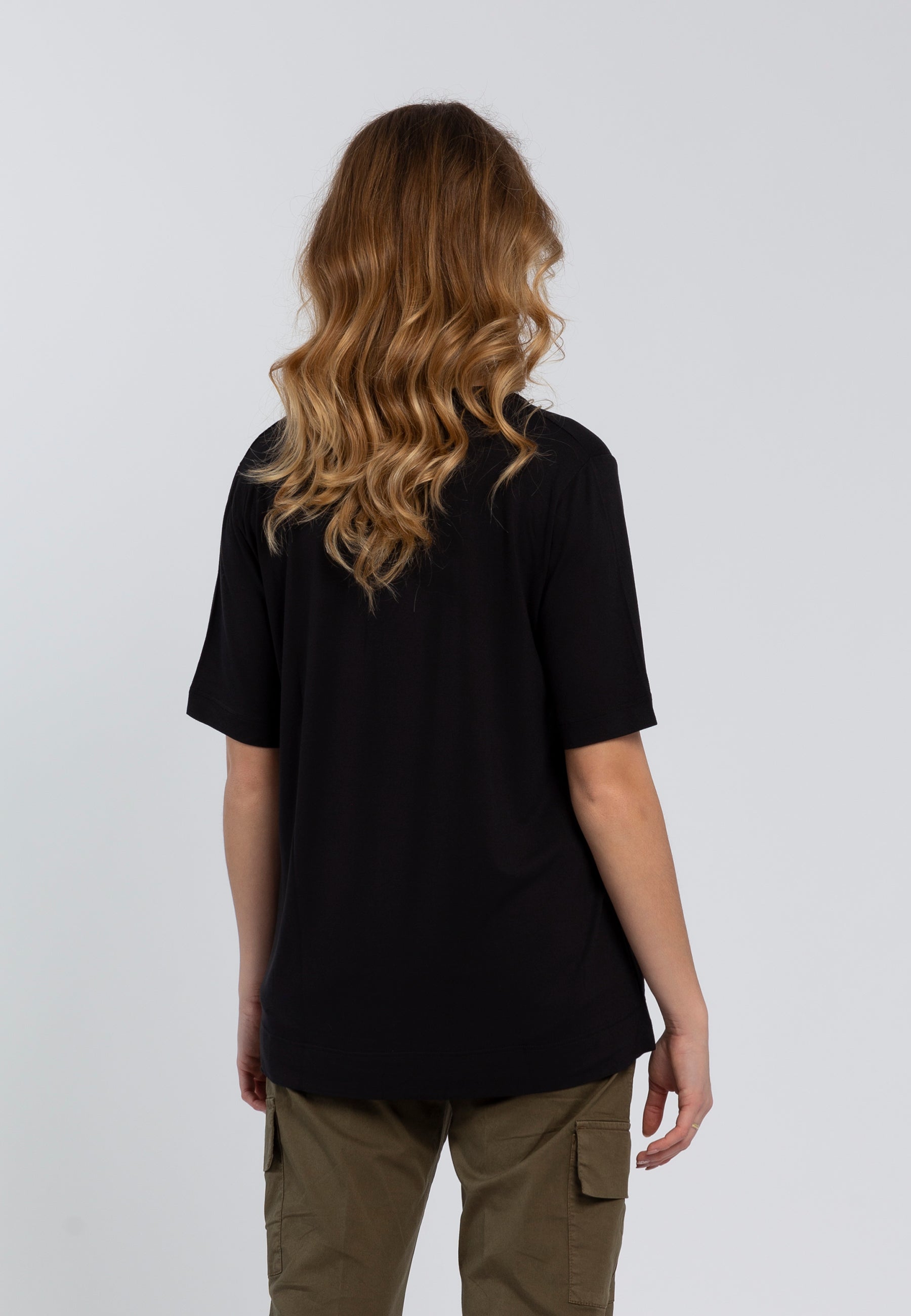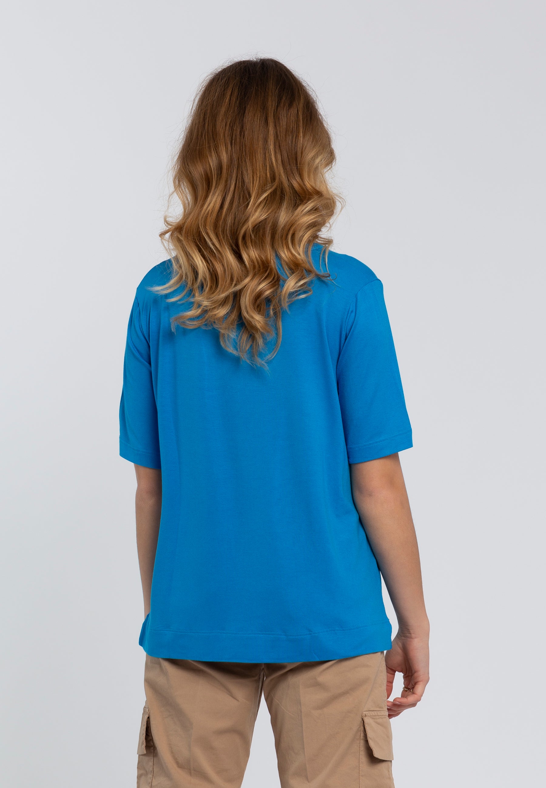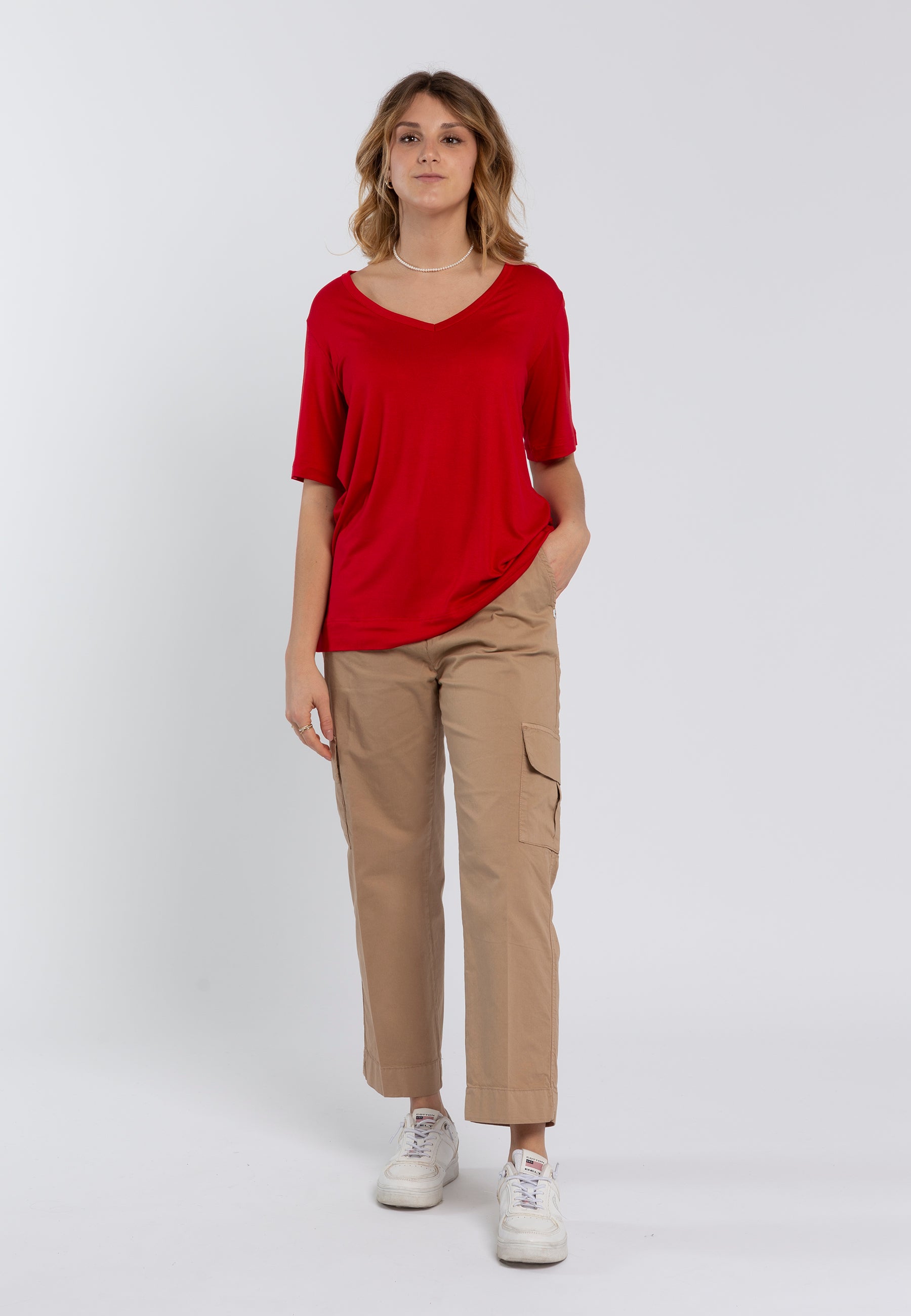 Maglia donna mezza manica con scollo a V, realizzata in fresca e leggera maglina di viscosa. Il tessuto garantisce un'ottima vestibilità e una sensazione di freschezza sulla pelle. Ideale per le giornate calde, questa maglia versatile e dalle linee semplici è perfetta da indossare in molteplici occasioni.