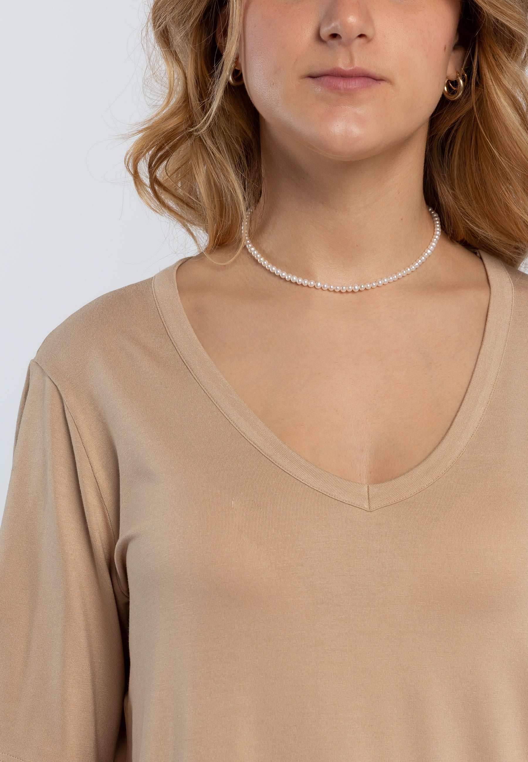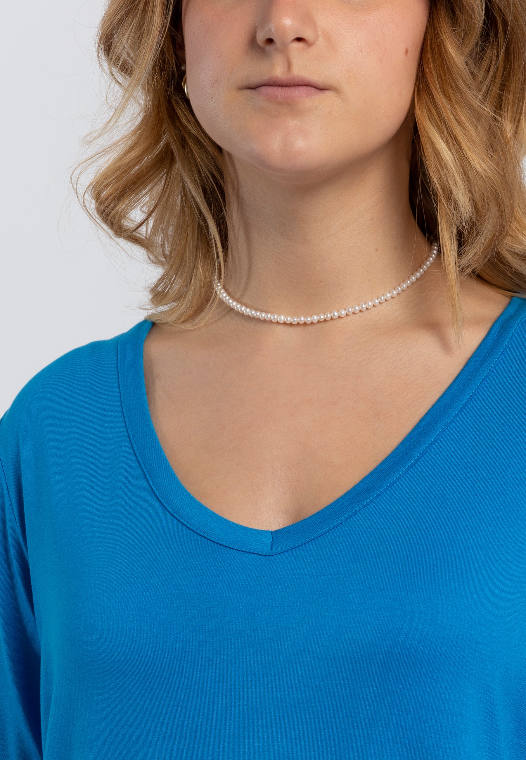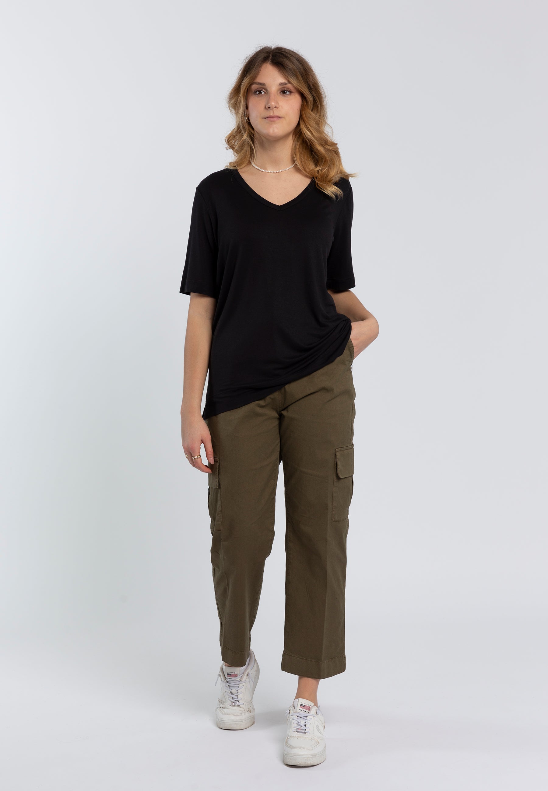 Maglia donna mezza manica con scollo a V, realizzata in fresca e leggera maglina di viscosa. Il tessuto garantisce un'ottima vestibilità e una sensazione di freschezza sulla pelle. Ideale per le giornate calde, questa maglia versatile e dalle linee semplici è perfetta da indossare in molteplici occasioni.