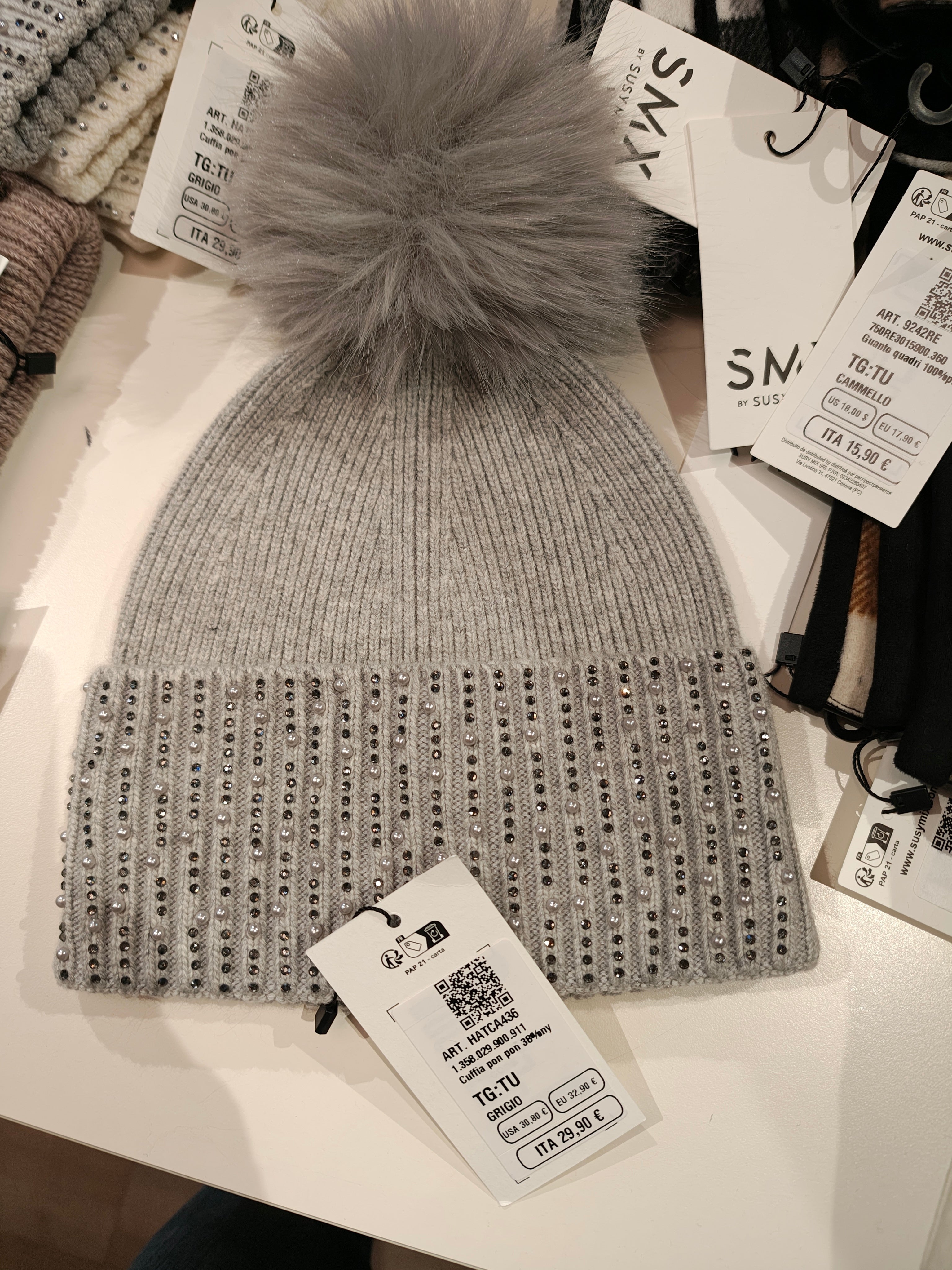 SUSY MIX Cuffia Donna in Maglia Bordo a Coste con Perline e Pom Pom ART. HATCA436