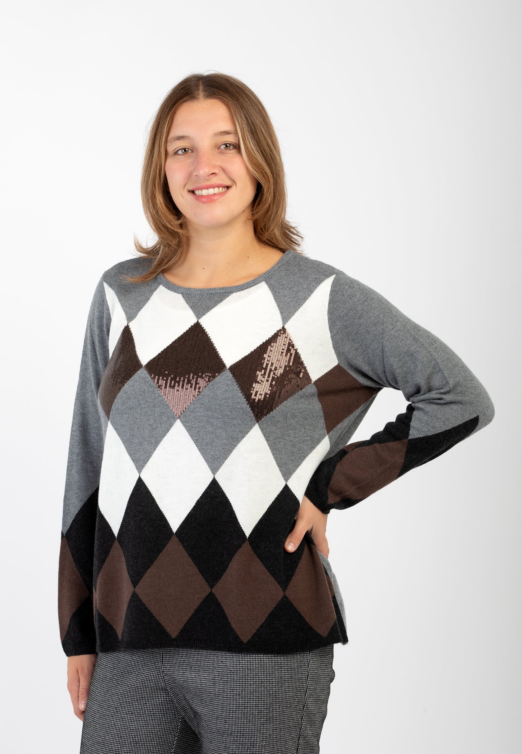 La maglia da donna LUISA VIOLA è un capo elegante e raffinato, pensato per valorizzare ogni look con un tocco di originalità. Realizzata con maniche lunghe, si distingue per la sua particolare fantasia a rombi che dona dinamismo e carattere al design. L’applicazione discreta ma luminosa di paillettes aggiunge una nota di brillantezza, perfetta per chi ama uno stile femminile ma ricercato. Il taglio confortevole garantisce una vestibilità comoda, ideale sia per l’uso quotidiano che per occasioni speciali. Un capo versatile che unisce gusto moderno e dettagli preziosi, firmato dalla qualità e dall’esperienza del brand LUISA VIOLA.