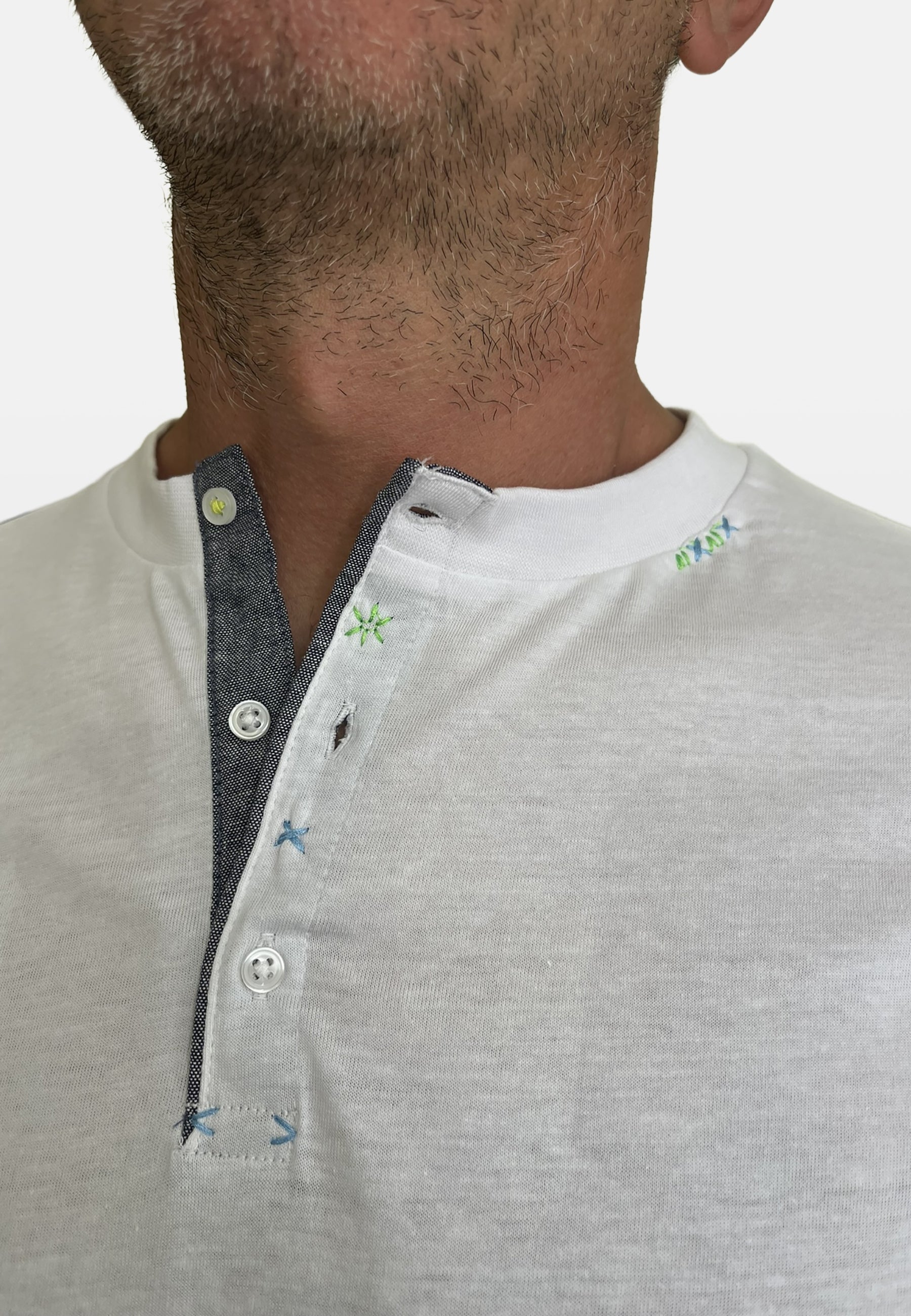 Questa maglietta da uomo è perfetta per l'estate grazie al suo puro cotone fresco e leggero. Il collo serafino e il bordo lavorato aggiungono un tocco di stile, mentre le mezza maniche la rendono comoda e versatile. Un must-have per ogni guardaroba maschile.
