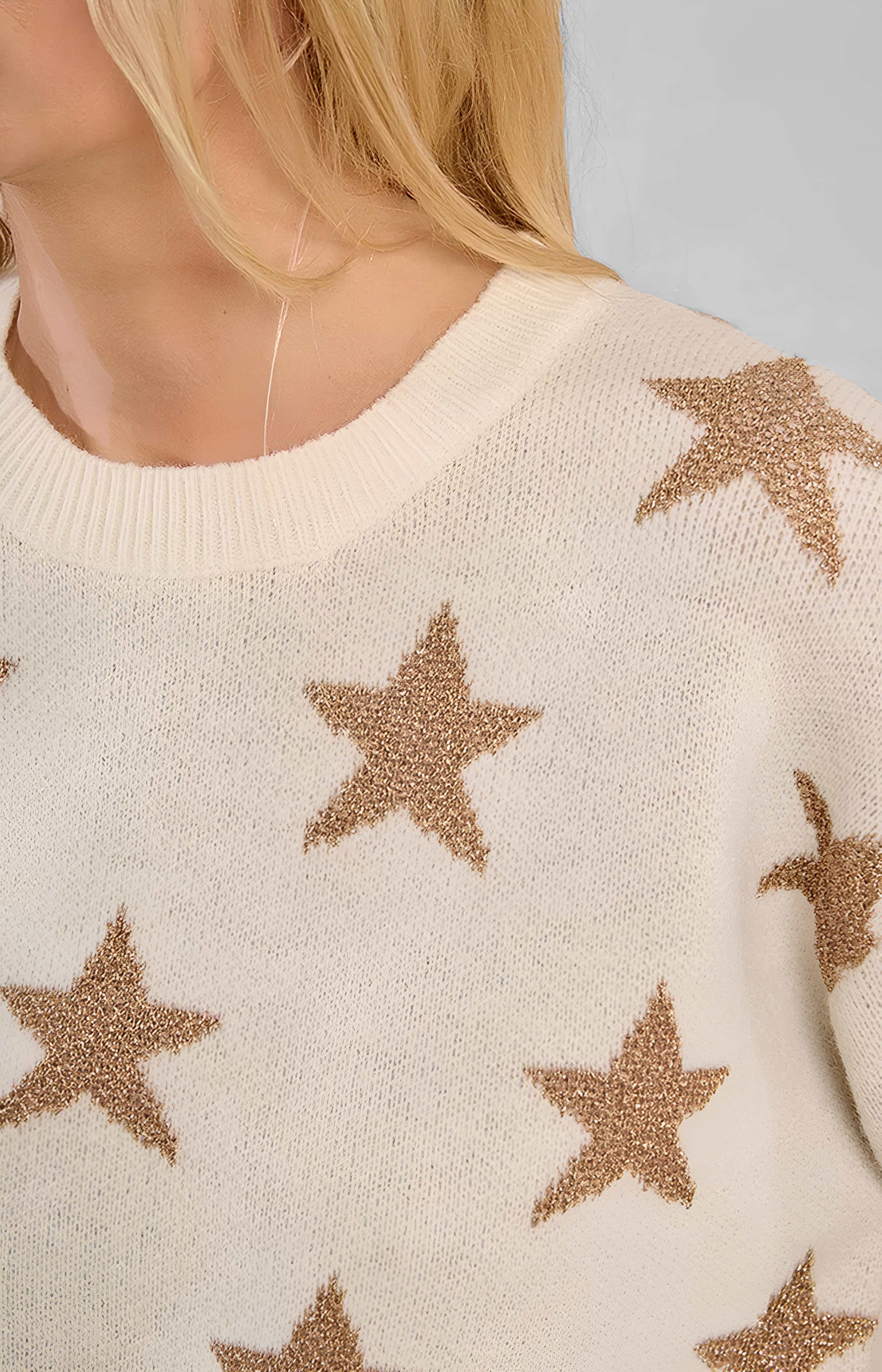 Questa maglia da donna firmata MOLLY BRACKEN unisce eleganza e comfort in un capo dal design raffinato e contemporaneo. Realizzata in un tessuto morbido e piacevole al tatto, presenta un classico scollo girocollo che valorizza la linea del collo con discrezione. Il dettaglio distintivo è la lavorazione a stelle in lurex, che aggiunge un tocco di luce e originalità al look, perfetto per chi ama distinguersi con stile. Ideale da indossare sia di giorno che di sera, questa maglia si abbina facilmente a pantaloni o gonne, regalando un’allure sofisticata e femminile in ogni occasione.