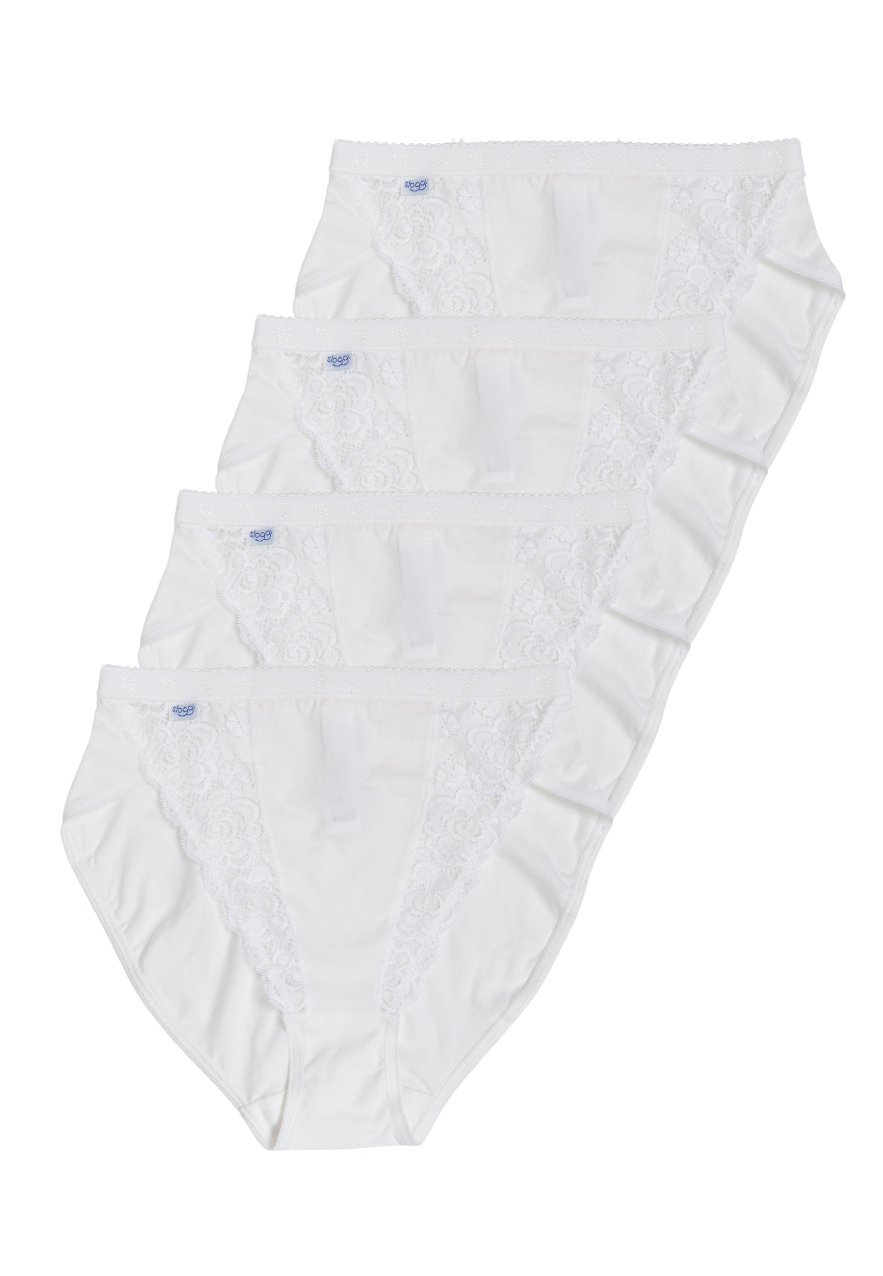 Slip sgambato da donna con inserti in pizzo elasticizzato sulla parte anteriore realizzato con una maglina di cotone elasticizzato che conferisce al capo una morbidezza e una comodità unica. A seconda della quantità ordinata la confezione potrebbe cambiare. (Il prezzo si riferisce alla confezione da 4 slip).