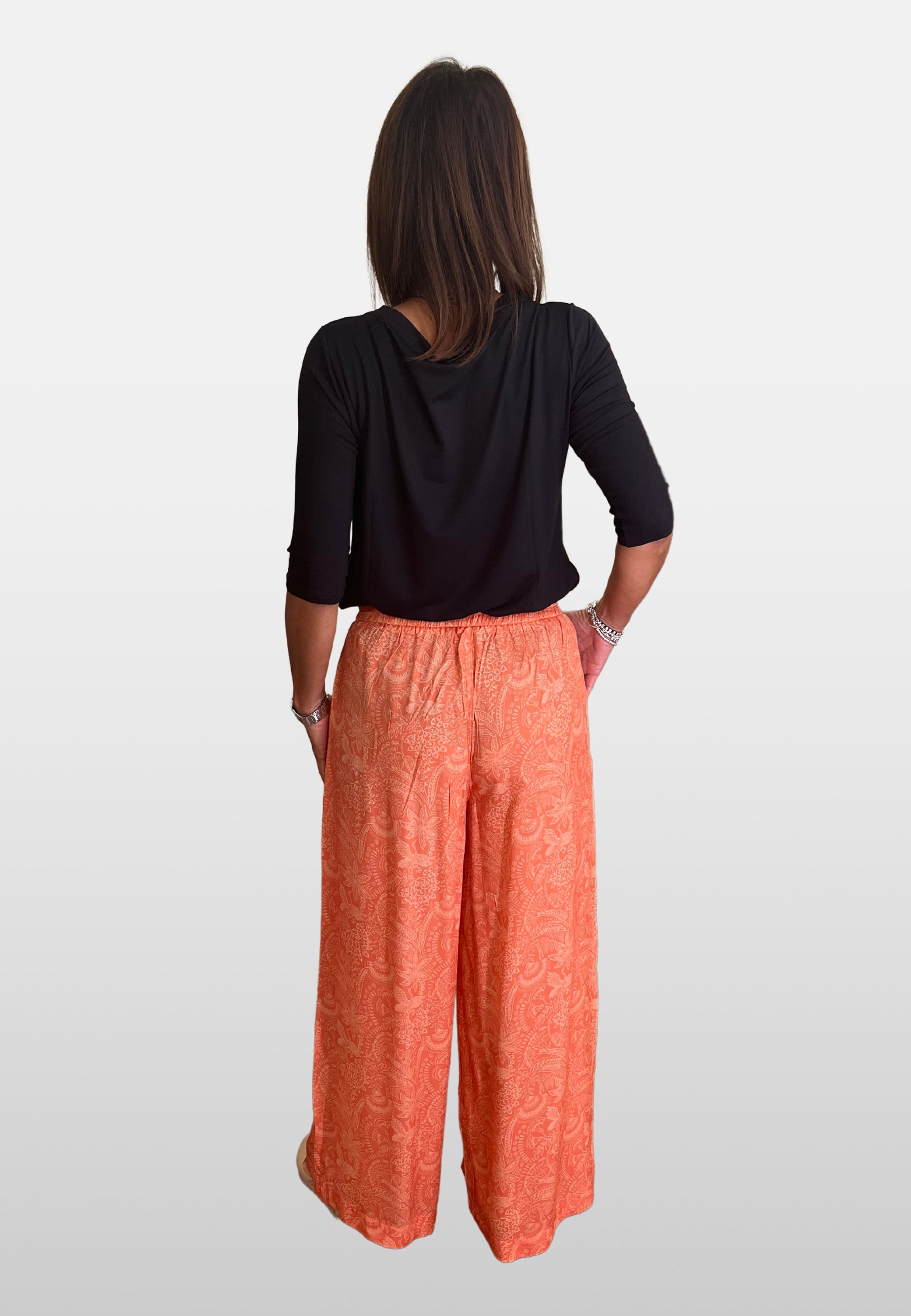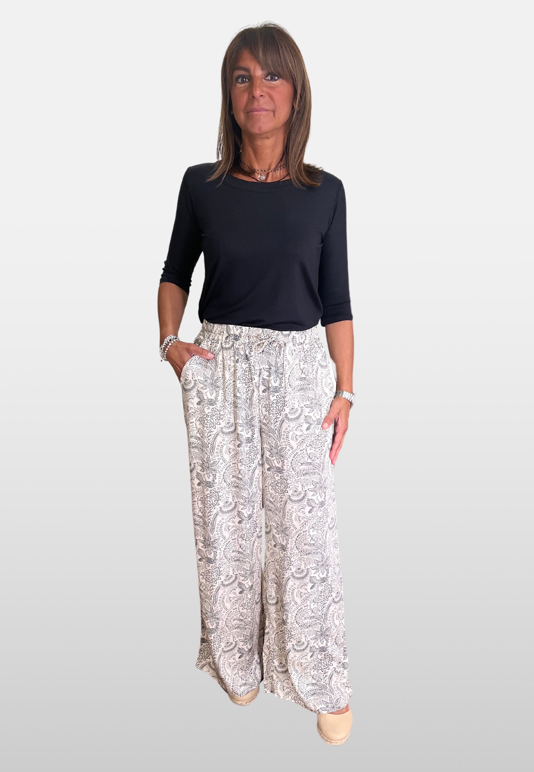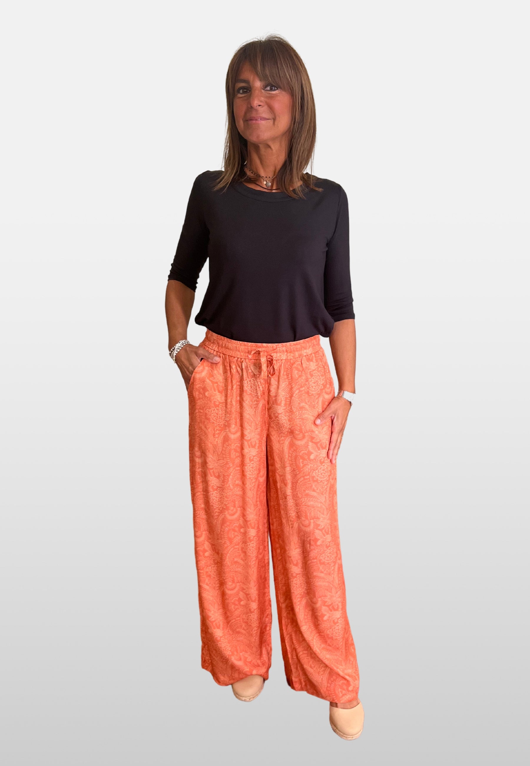 Il pantalone donna con coulisse in vita è realizzato in tessuto di pura viscosa, per garantire freschezza e morbidezza. La fantasia di questo pantalone aggiunge un tocco di stile al look, mentre la coulisse in vita permette di regolare comodamente la vestibilità. Perfetto per un look fresco e confortevole.