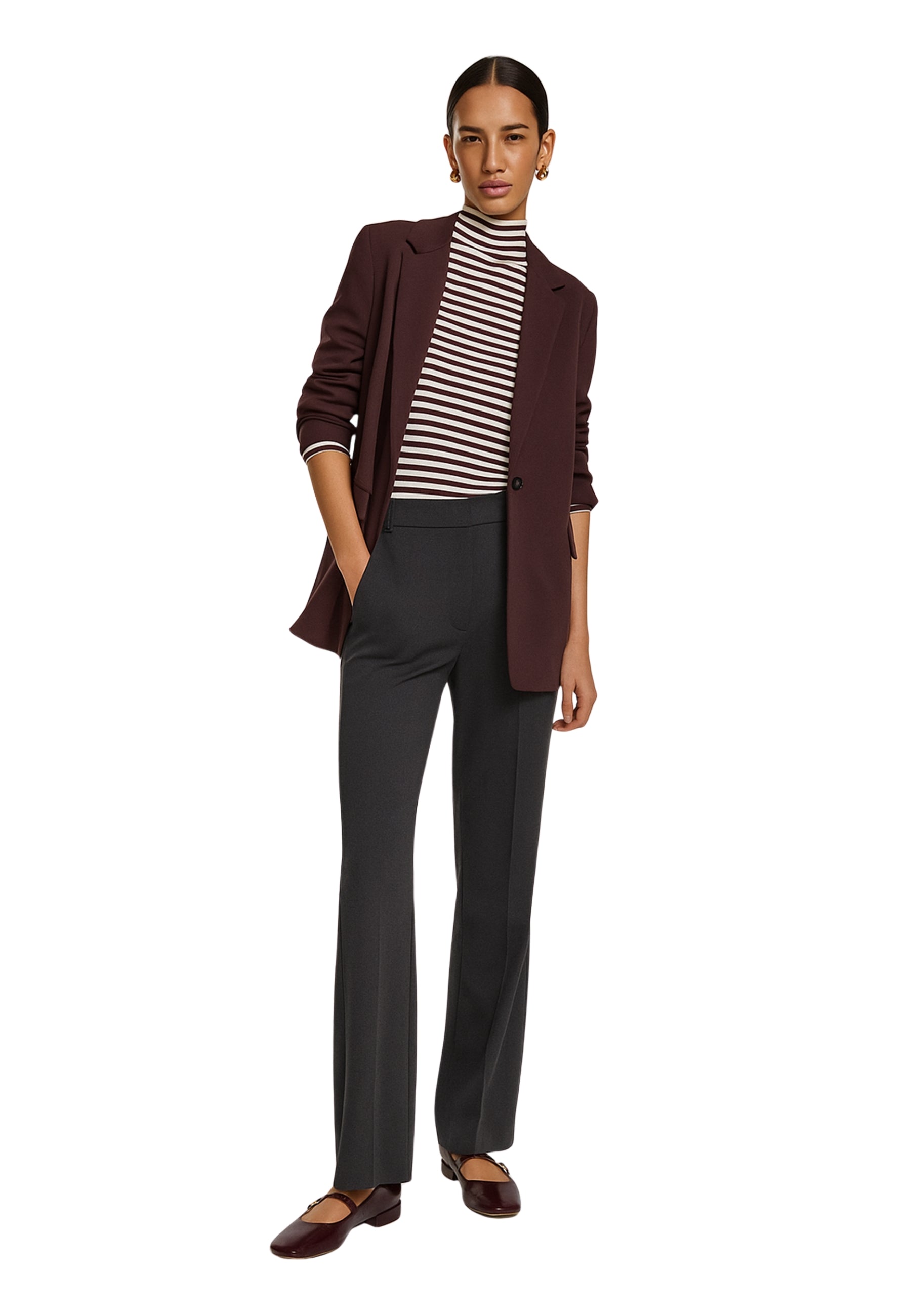 Il pantalone a zampetta da donna di EMME MARELLA è un capo elegante e versatile, pensato per offrire comfort e stile in ogni occasione. Realizzato in jersey punto Milano, un tessuto morbido e compatto a base di viscosa, questo pantalone avvolge la figura con una vestibilità fluida e femminile. La chiusura con zip e bottone dona un tocco di praticità e rifinitura pulita, mentre la linea leggermente svasata sul fondo valorizza la silhouette con un'eleganza contemporanea. Perfetto da abbinare a camicie o blazer per un look da ufficio, oppure a maglie leggere per un outfit più informale ma sempre curato.