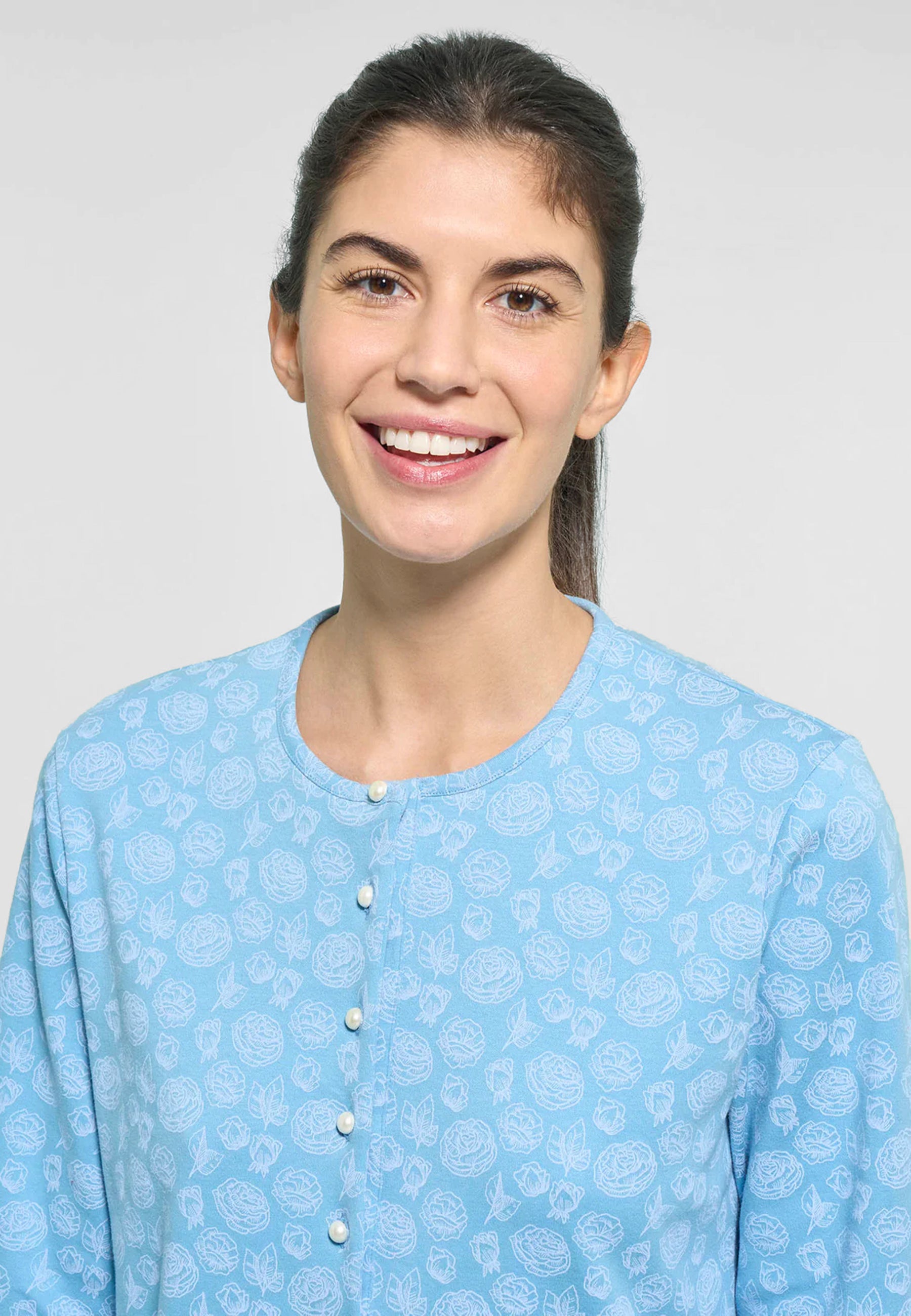 Con il pigiama da donna in cotone interlock, avvolgiti in morbidezza e comfort. La casacca con fantasia floreale, delizioso bordo in pizzo e bottoni in perline è un classico intramontabile. Il pantalone regular offre un'opzione versatile mentre i polsini assicurano una vestibilità perfetta. Ideale per rilassarsi a casa.