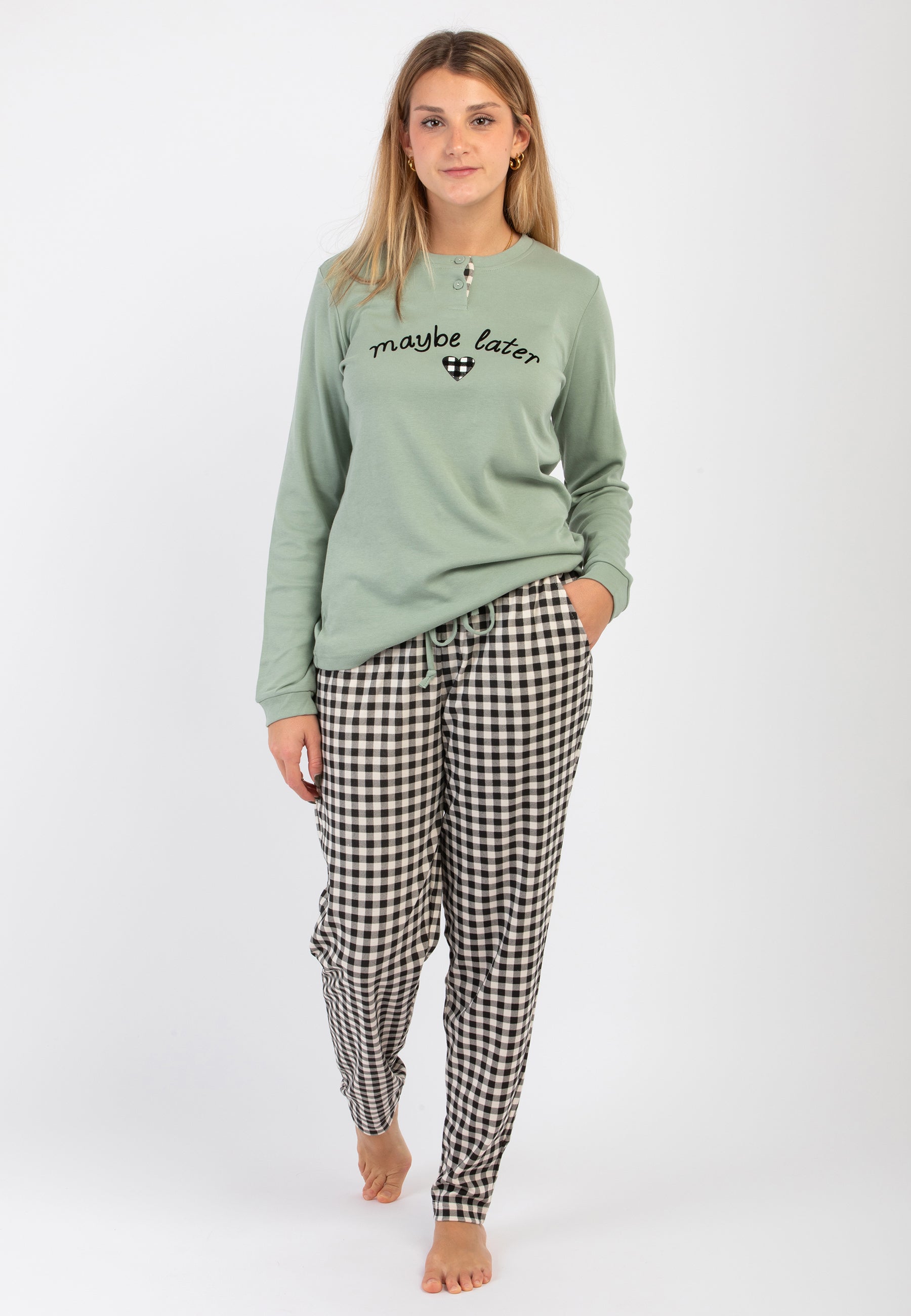 Il pigiama donna in cotone felpato firmato NOI DI NOTTE combina comfort e stile per le notti più fresche. La maglia presenta una morbida scritta decorativa, mentre i pantaloni, dal taglio comodo, sono caratterizzati da un elegante motivo a quadri che dona un tocco di originalità. Realizzato in tessuto caldo e traspirante, questo pigiama è perfetto per chi cerca calore senza rinunciare alla moda. Ideale per rilassarsi in casa o per dormire, è la scelta perfetta per chi ama l'abbigliamento da notte di alta qualità e dallo stile contemporaneo.