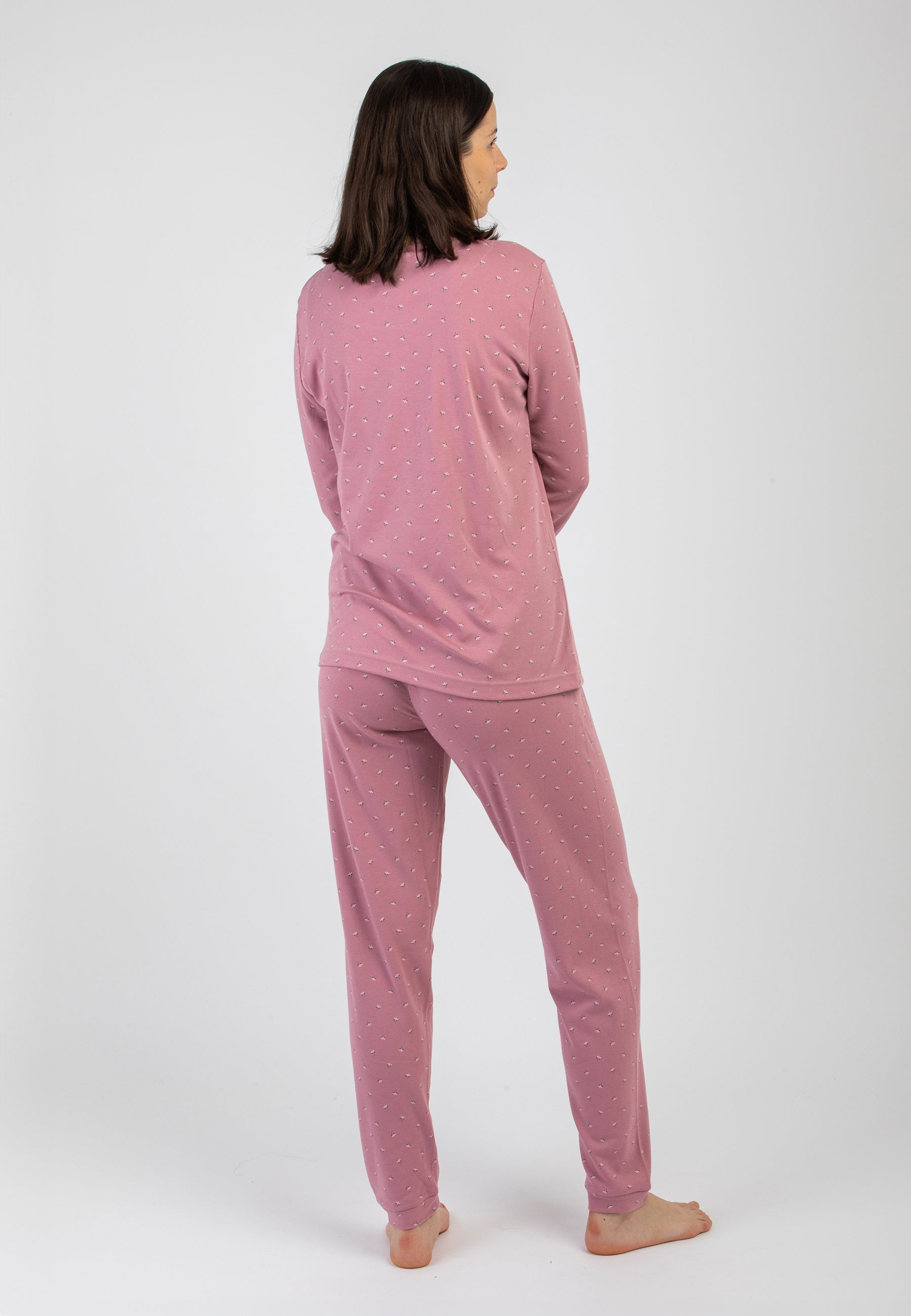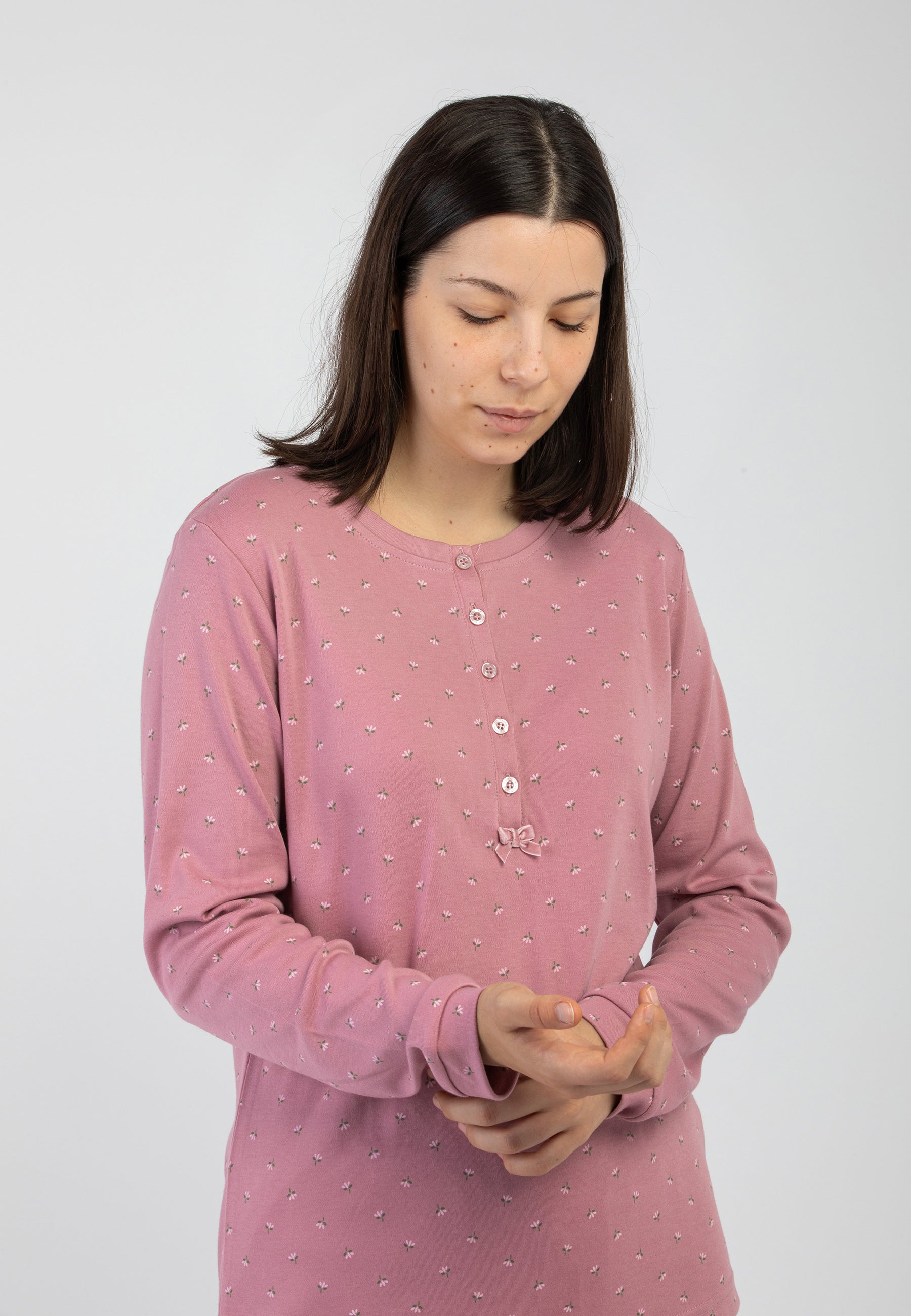 Questo pigiama da donna è realizzato in morbido e confortevole cotone interlock, con una superficie felpata per garantire un calore e una morbidezza eccezionali durante la notte. Il design tinta unita è arricchito da una delicata microfantasia per un tocco di eleganza. Dormi sonni tranquilli con NOI DI NOTTE!