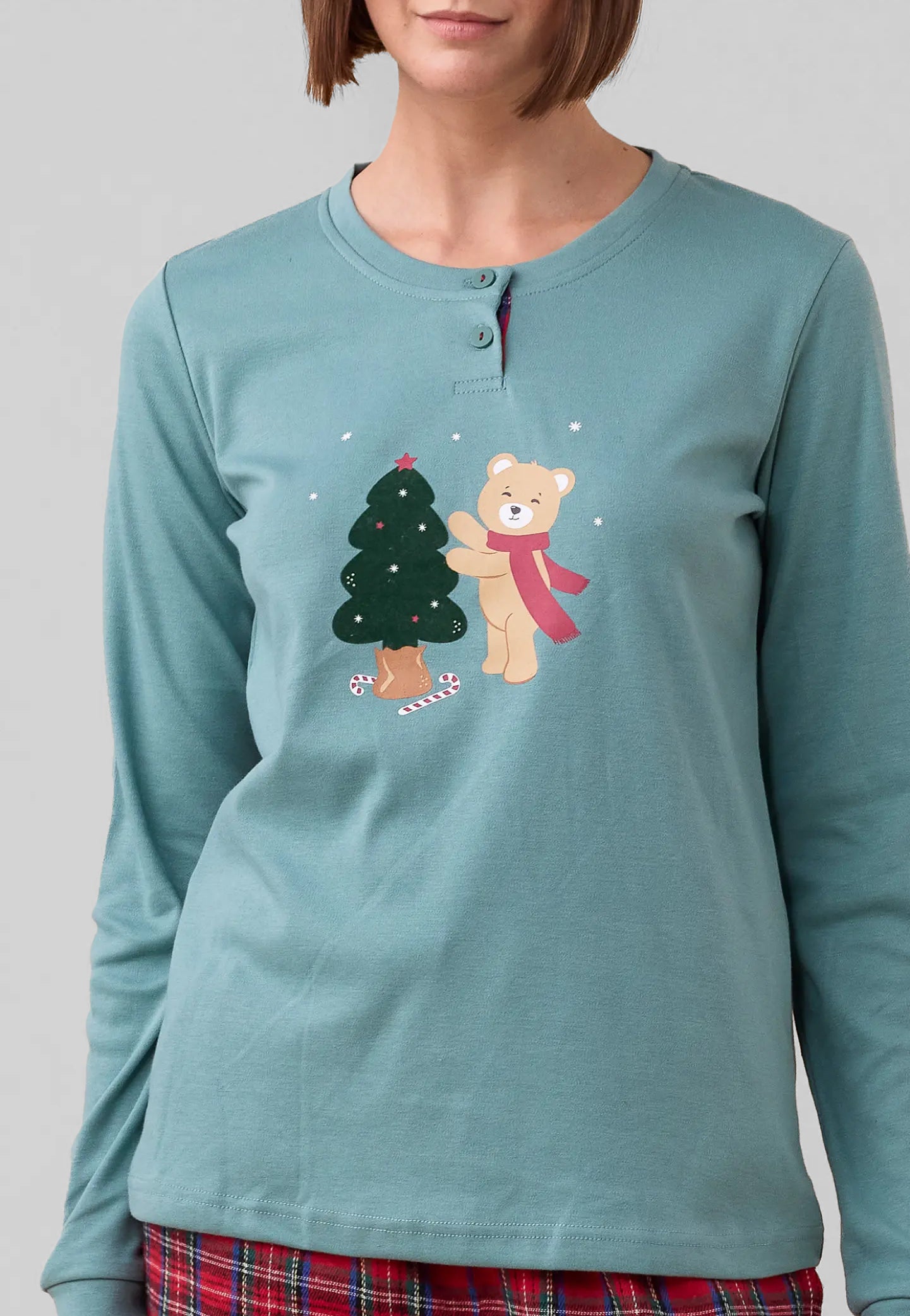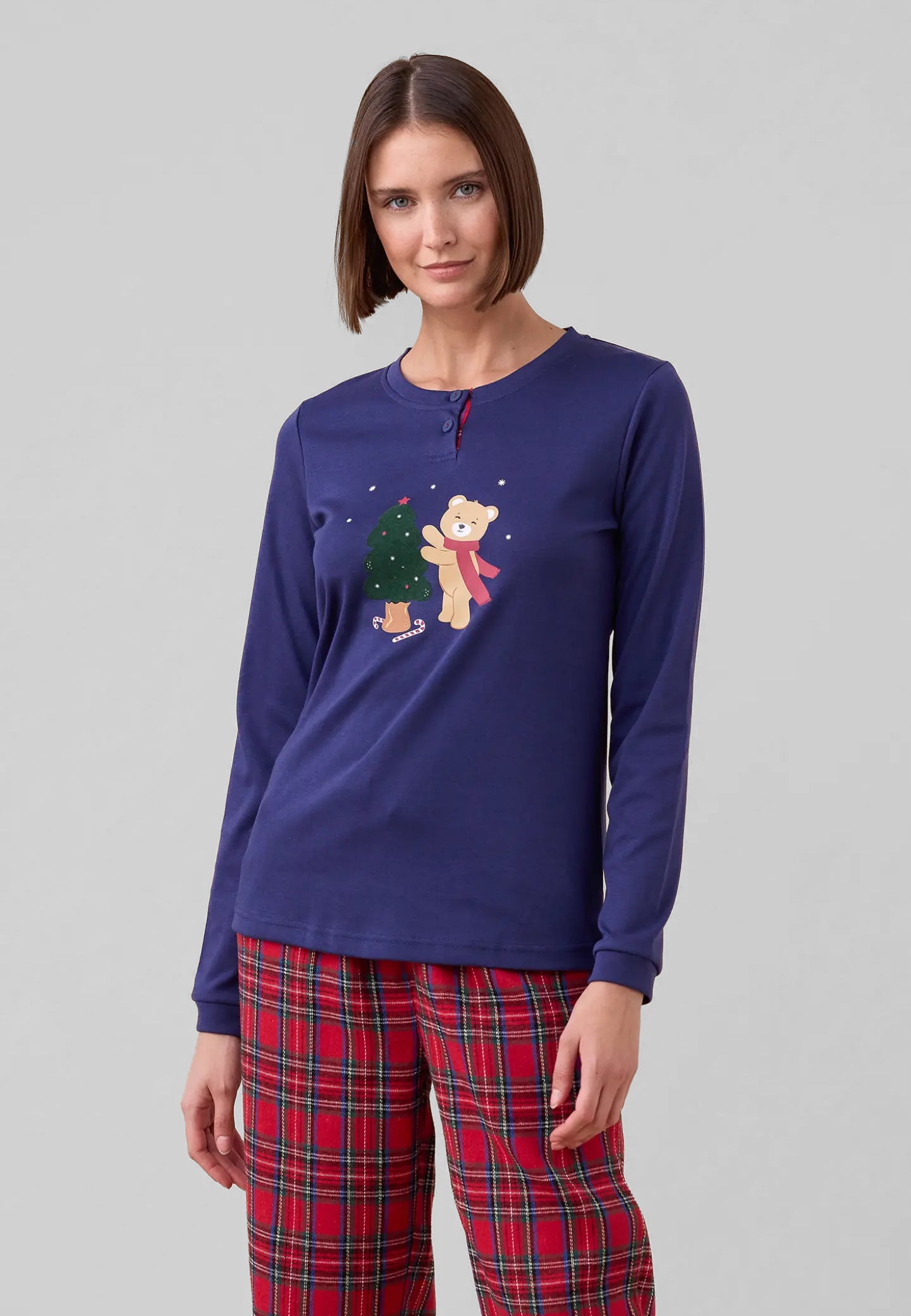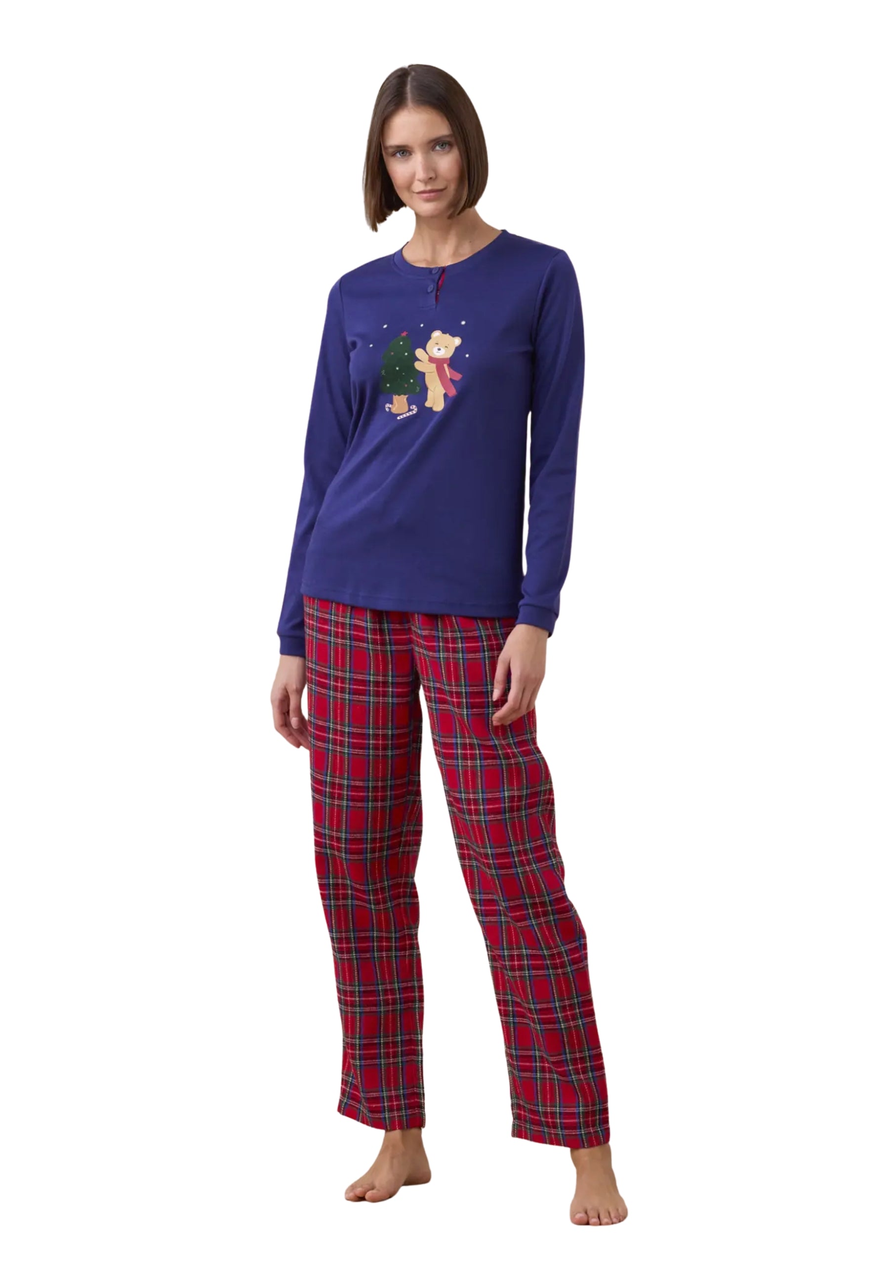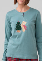 Scopri il pigiama donna invernale lungo manica lunga della linea Natale firmato Noi di Notte, perfetto per chi cerca un pigiama natalizio donna dal comfort avvolgente. Realizzato in morbido cotone interlock felpato (80 % cotone e 20 % poliestere), questo pigiama caldo per donna inverno offre calore e qualità, ideale per dormire o rilassarsi in casa durante le feste. Il modello presenta un elegante collo serafino e una maglia decorata con applicazione orso e albero, che unisce stile festivo e dolcezza natalizia. I pantaloni a quadri completano l’insieme conferendo un tocco tradizionale ma raffinato, rendendo questo pigiama in cotone felpato Natale la scelta perfetta per chi desidera un capo versatile, morbido e dedicato al relax. Scegli il piacere di un pigiama donna confortevole e festoso con Noi di Notte.