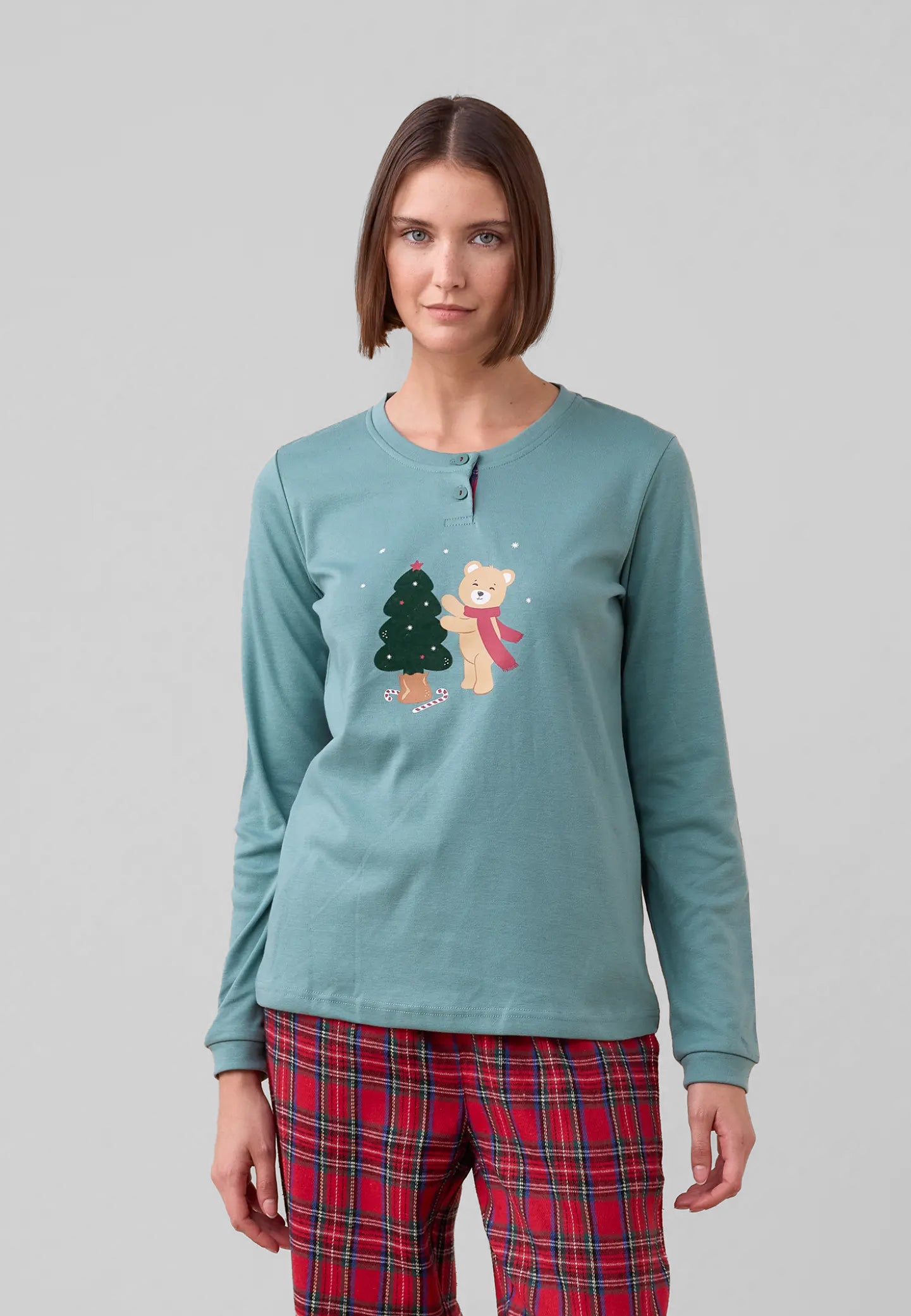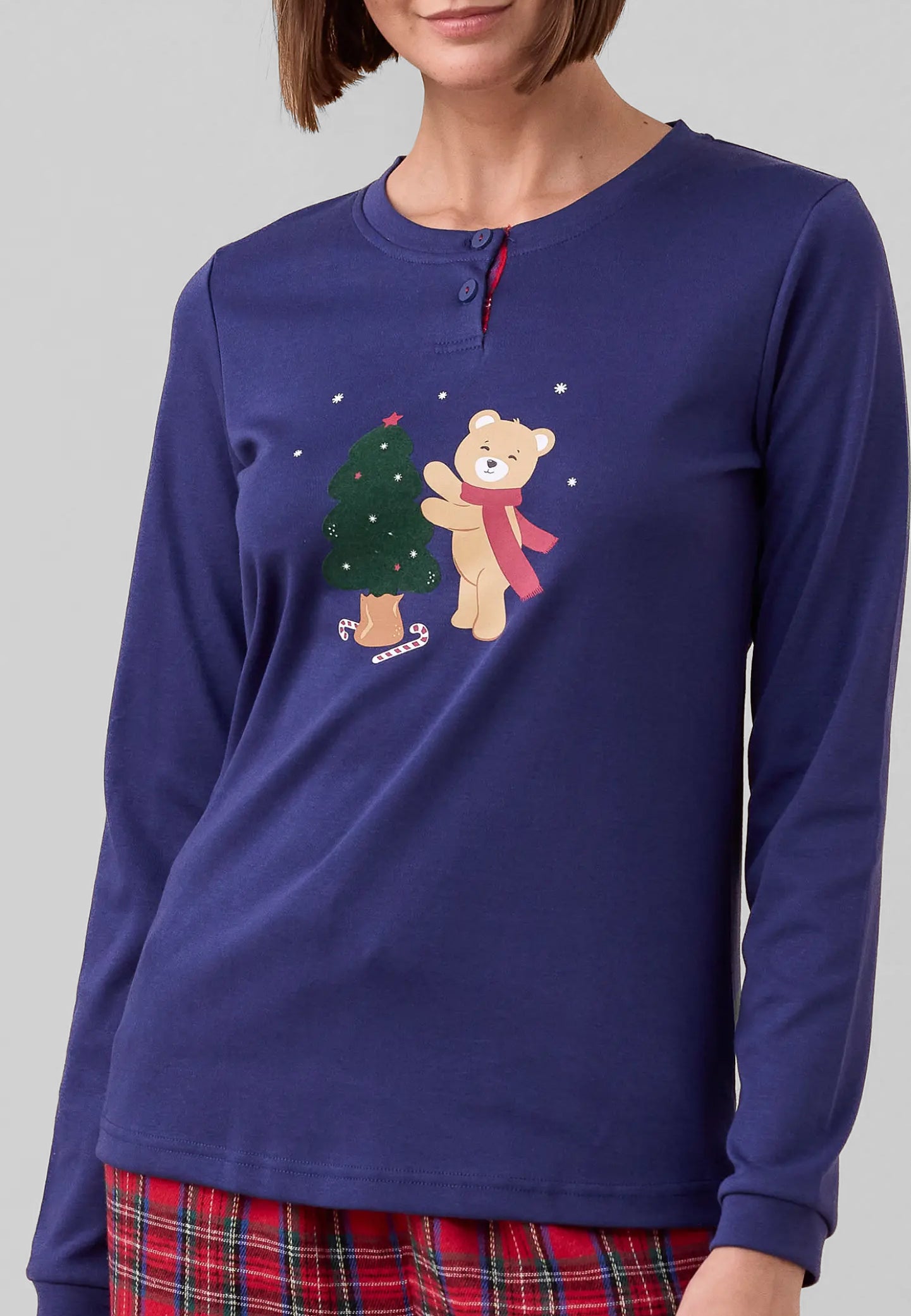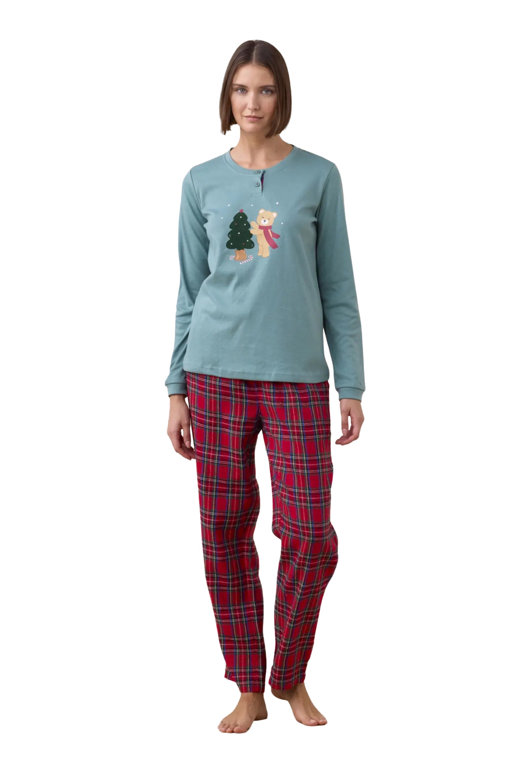 Scopri il pigiama donna invernale lungo manica lunga della linea Natale firmato Noi di Notte, perfetto per chi cerca un pigiama natalizio donna dal comfort avvolgente. Realizzato in morbido cotone interlock felpato (80 % cotone e 20 % poliestere), questo pigiama caldo per donna inverno offre calore e qualità, ideale per dormire o rilassarsi in casa durante le feste. Il modello presenta un elegante collo serafino e una maglia decorata con applicazione orso e albero, che unisce stile festivo e dolcezza natalizia. I pantaloni a quadri completano l’insieme conferendo un tocco tradizionale ma raffinato, rendendo questo pigiama in cotone felpato Natale la scelta perfetta per chi desidera un capo versatile, morbido e dedicato al relax. Scegli il piacere di un pigiama donna confortevole e festoso con Noi di Notte.