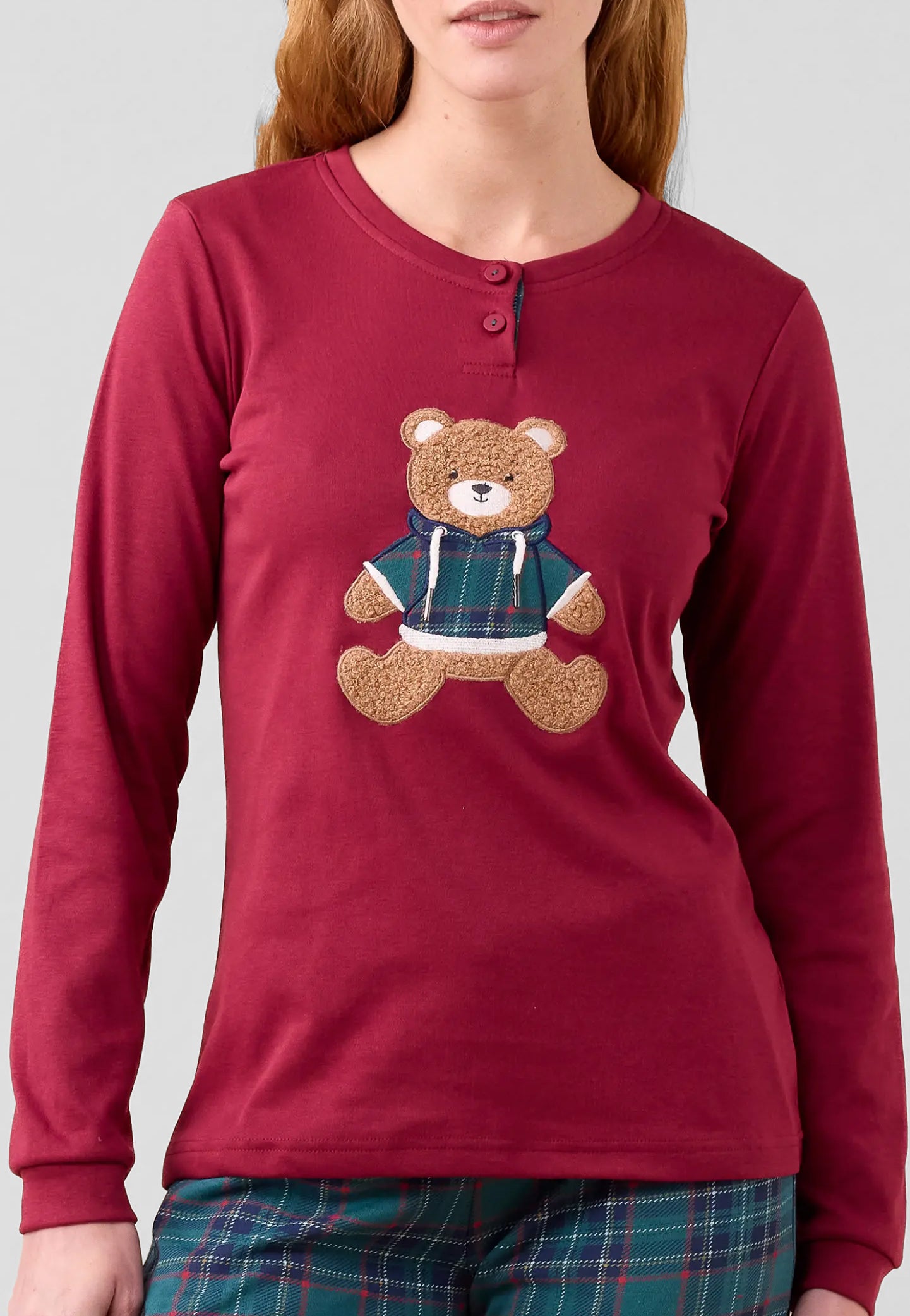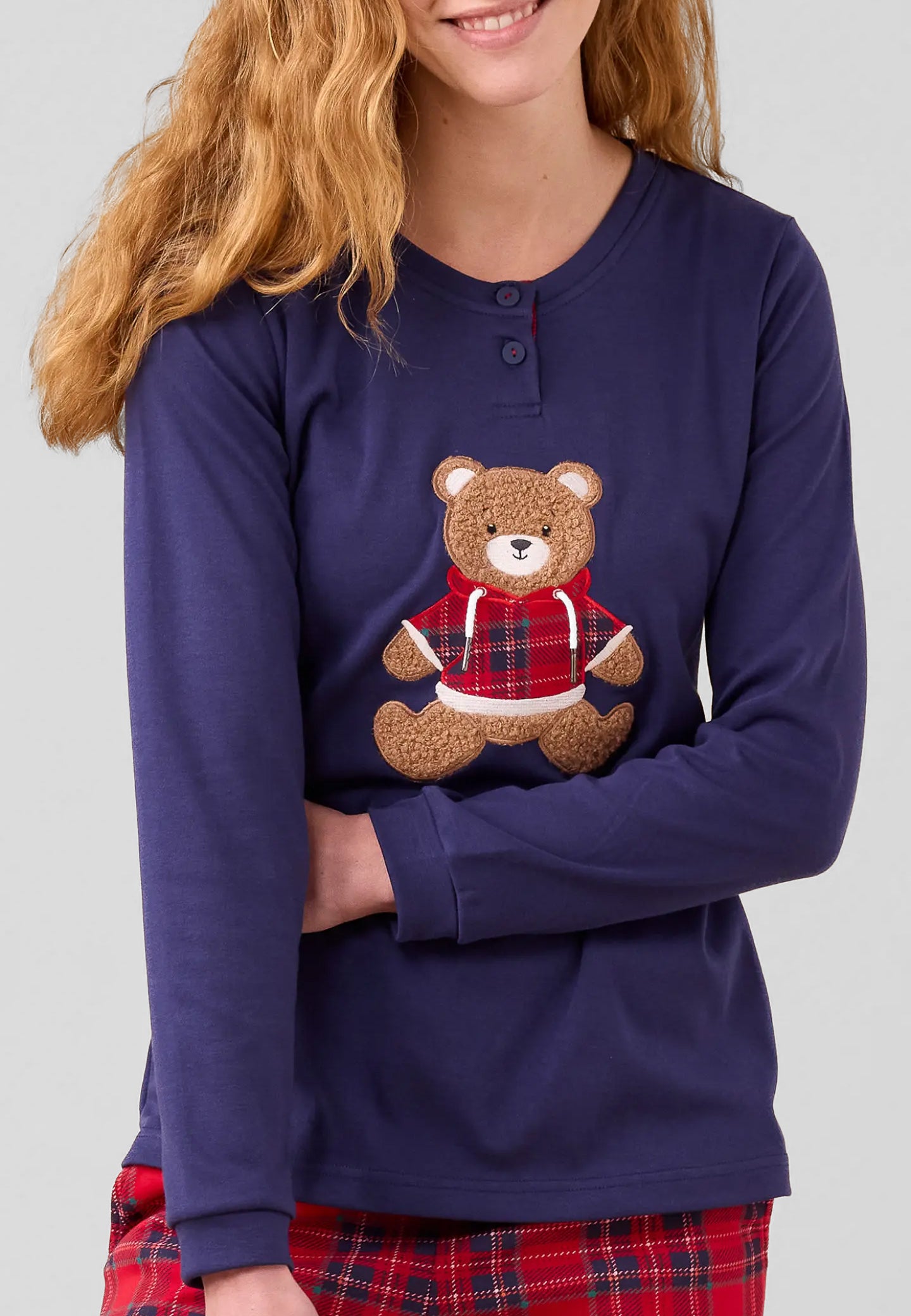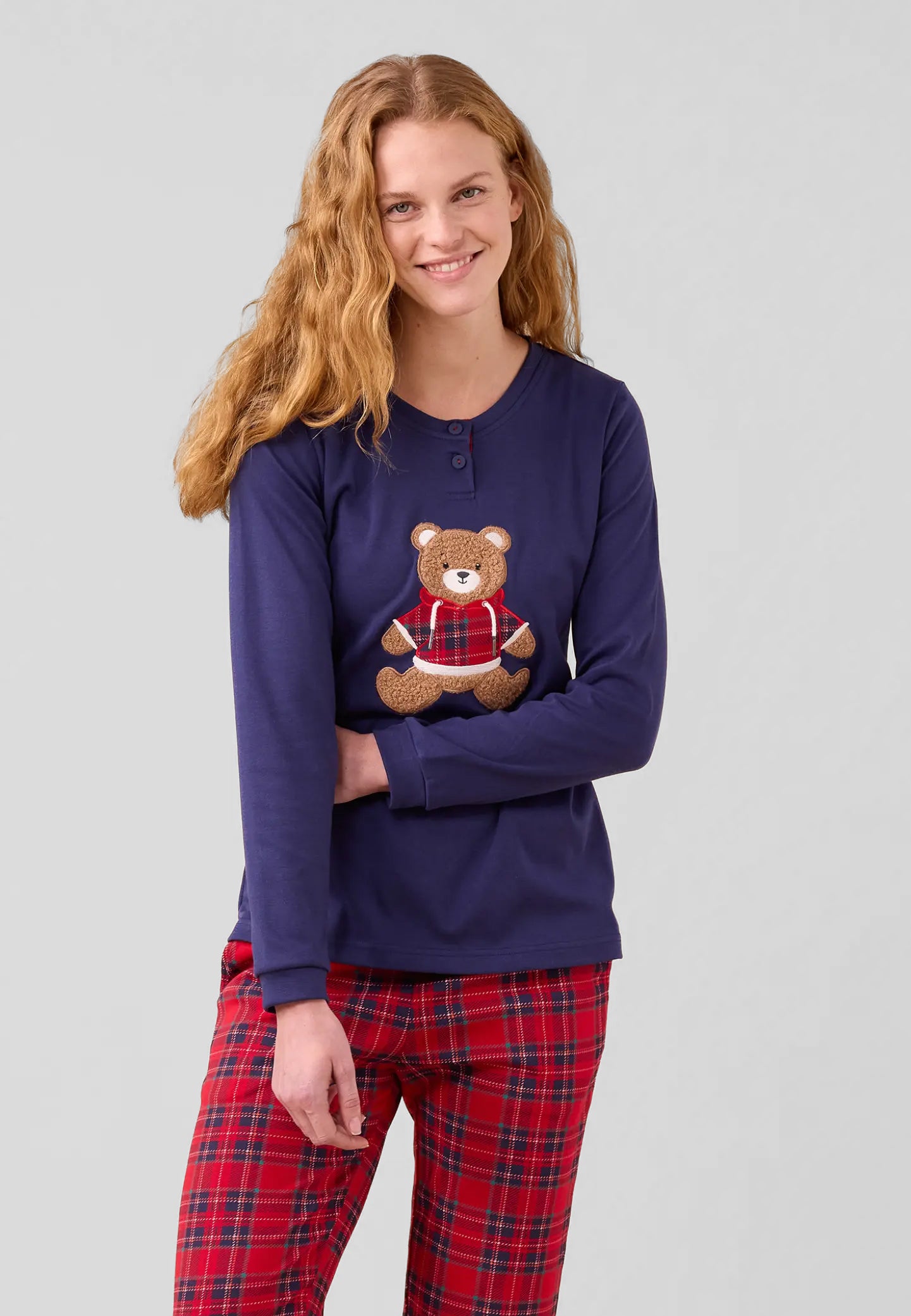 Il pigiama donna della linea Natale firmato NOI DI NOTTE è pensato per offrire comfort e calore durante le serate invernali. Realizzato in morbido cotone interlock felpato, avvolge il corpo con una piacevole sensazione di morbidezza ed è ideale per affrontare le notti più fredde. La maglia a manica lunga con collo serafino si distingue per l’applicazione con orso, un dettaglio che richiama lo spirito natalizio con delicatezza e originalità. I pantaloni a quadri completano l’insieme con un tocco classico e raffinato, perfettamente in linea con lo stile festivo. Questo pigiama invernale unisce praticità, calore e design ricercato, diventando il capo ideale per i momenti di relax a casa e per vivere l’atmosfera delle feste con stile e comodità.