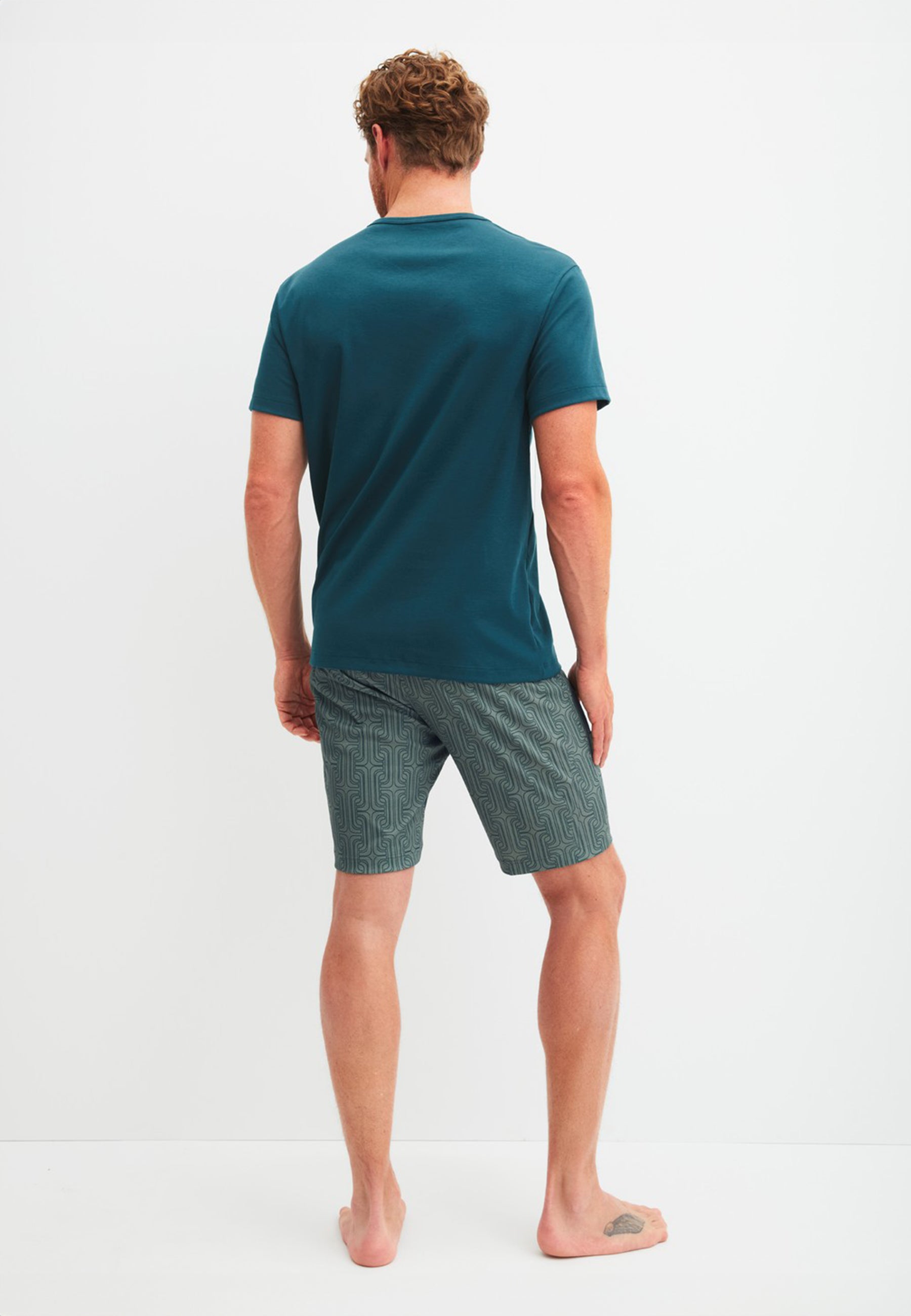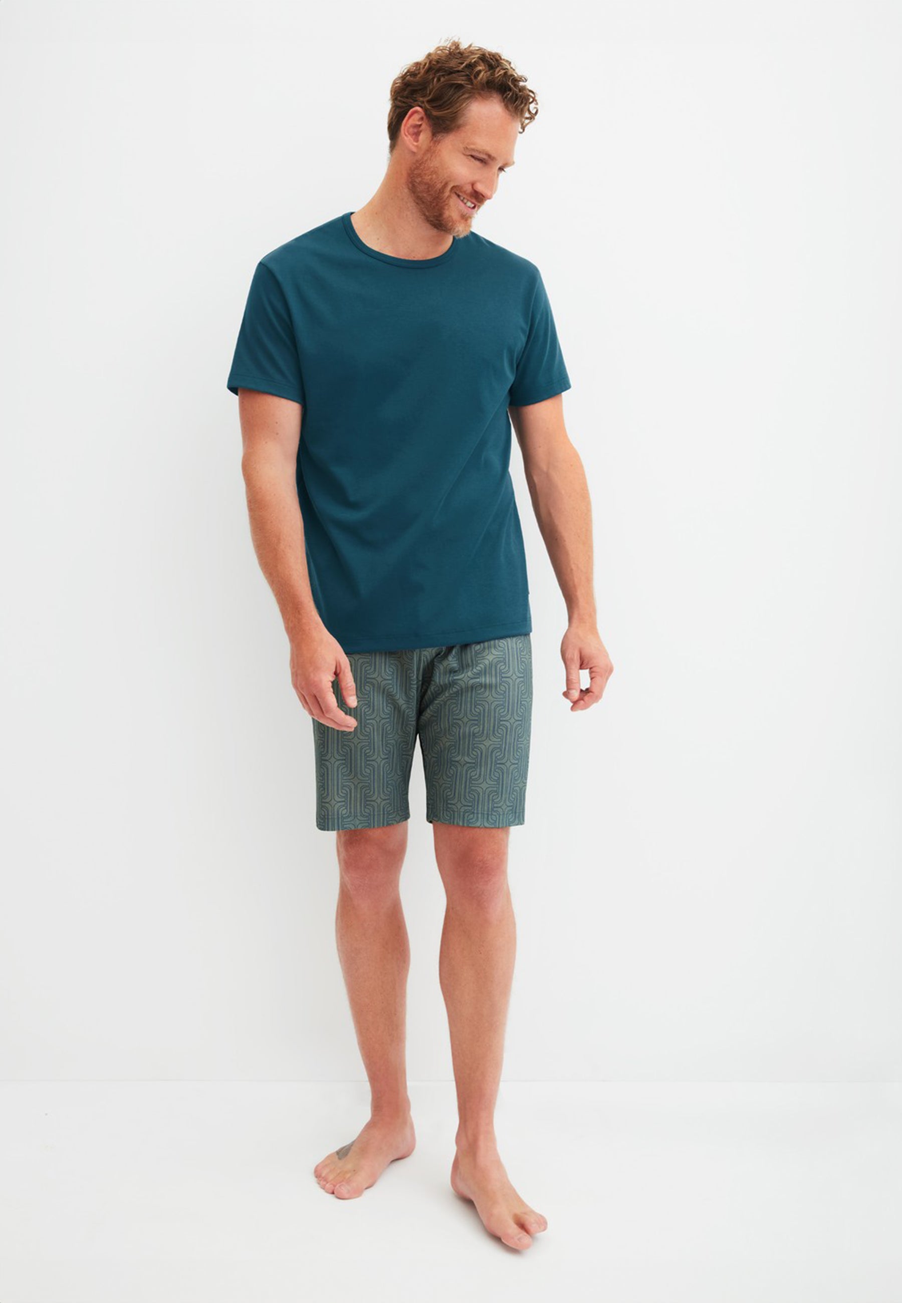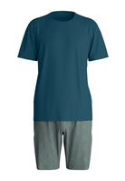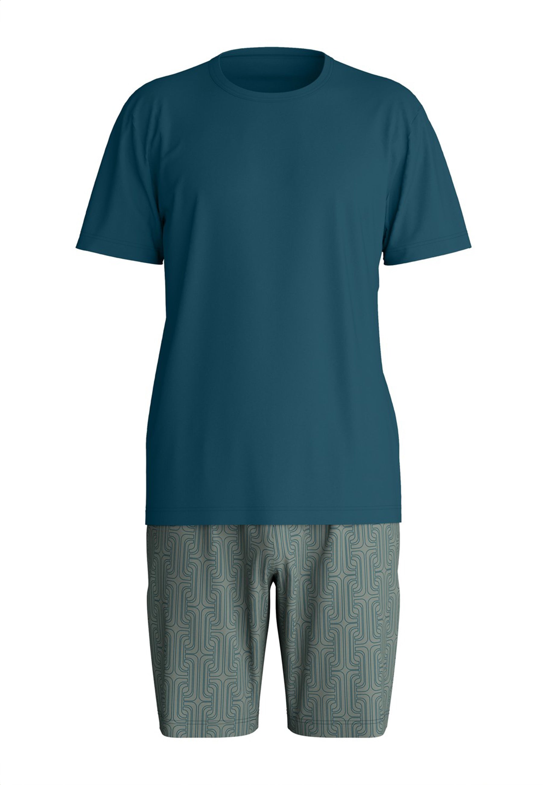 Pigiama uomo Calida corto in cotone interlock leggero con maglia unita a mezza manica e bermuda fantasia, ideale per comfort, traspirabilità e benessere nelle notti estive.
