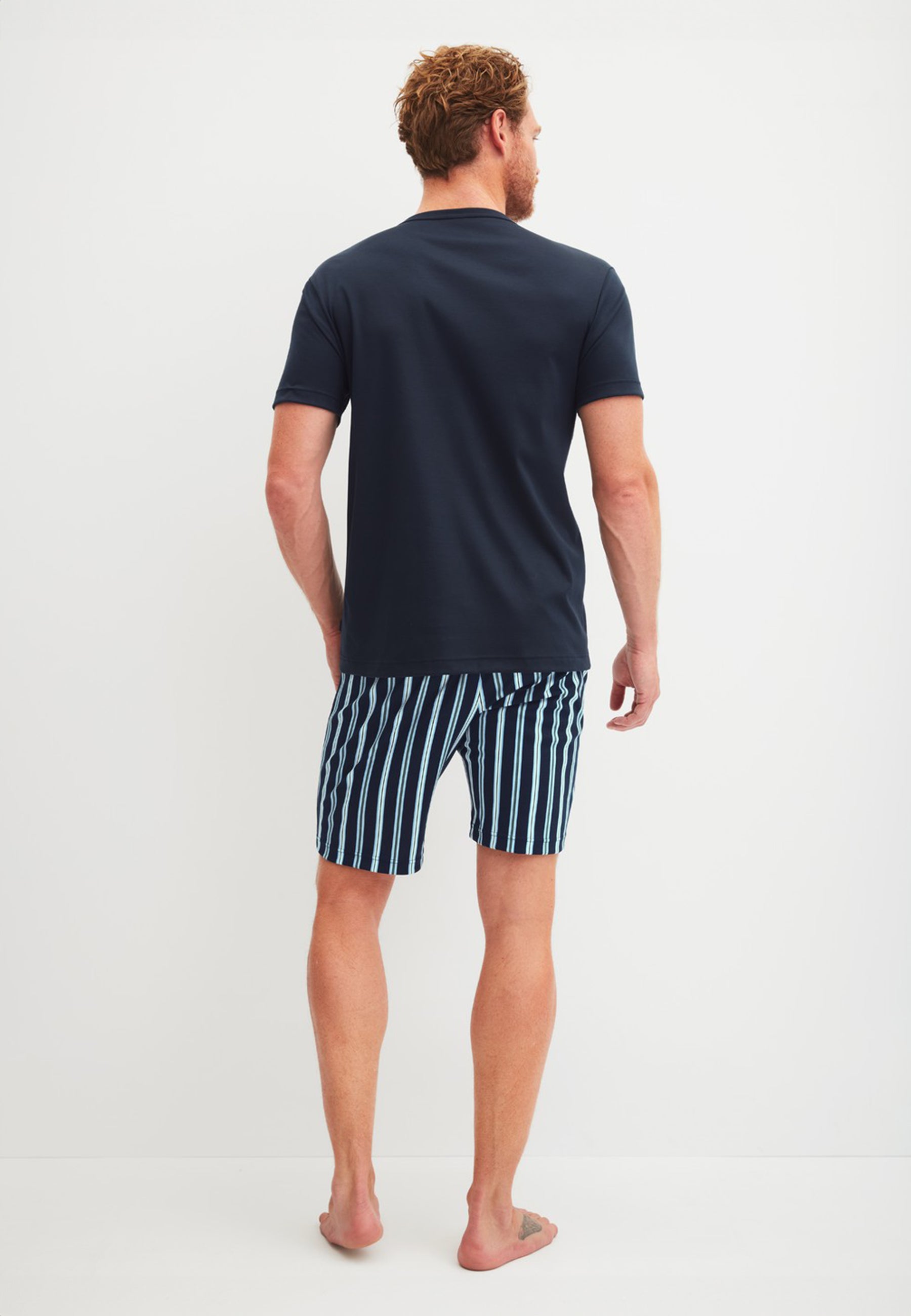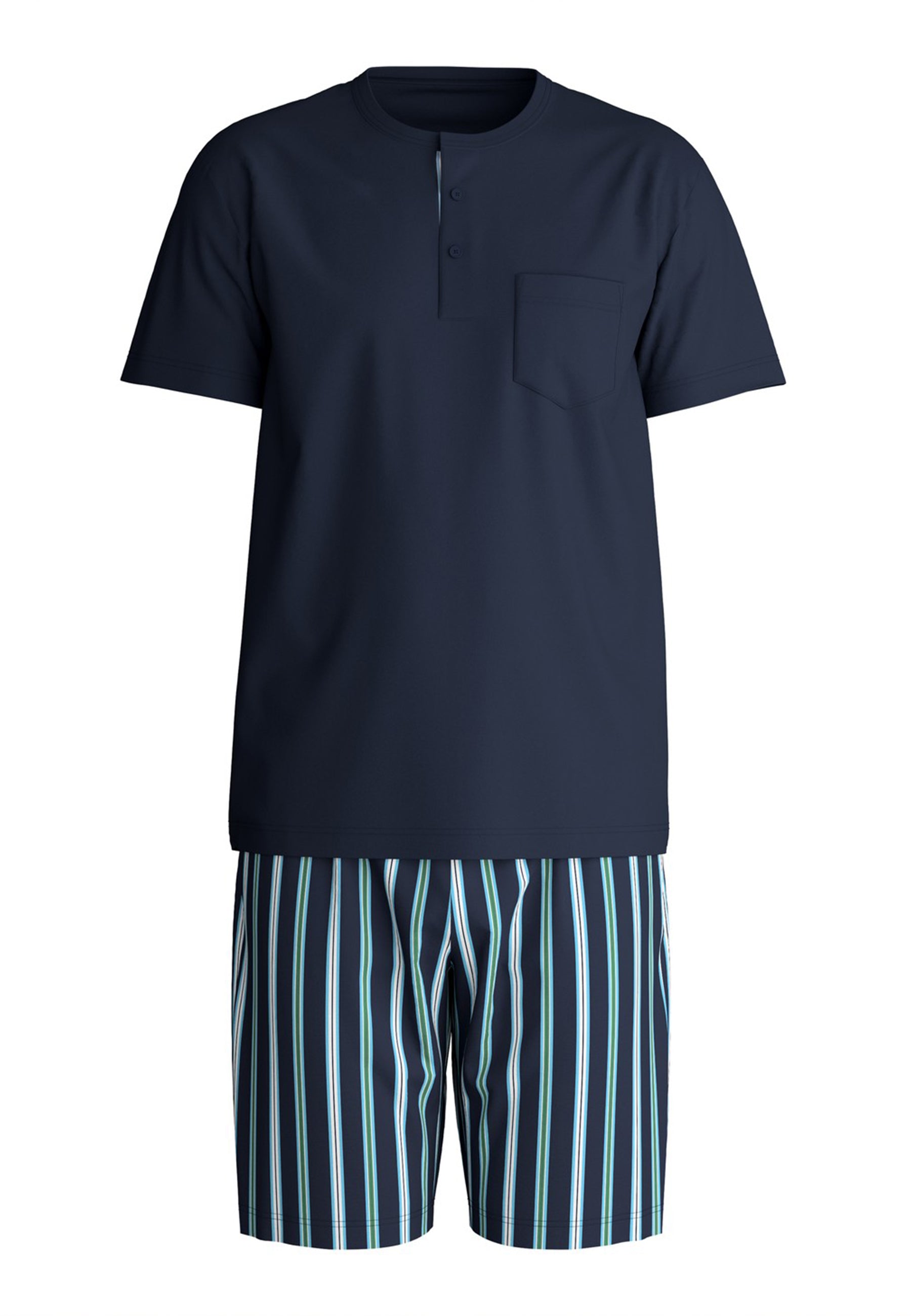 Pigiama uomo Calida corto in Pima Cotton puro cotone leggero con maglia serafino a mezza manica e bermuda fantasia, ideale per comfort superiore e freschezza estiva.