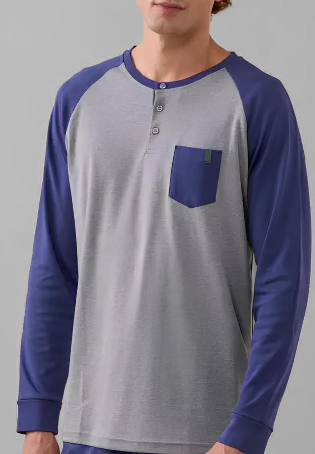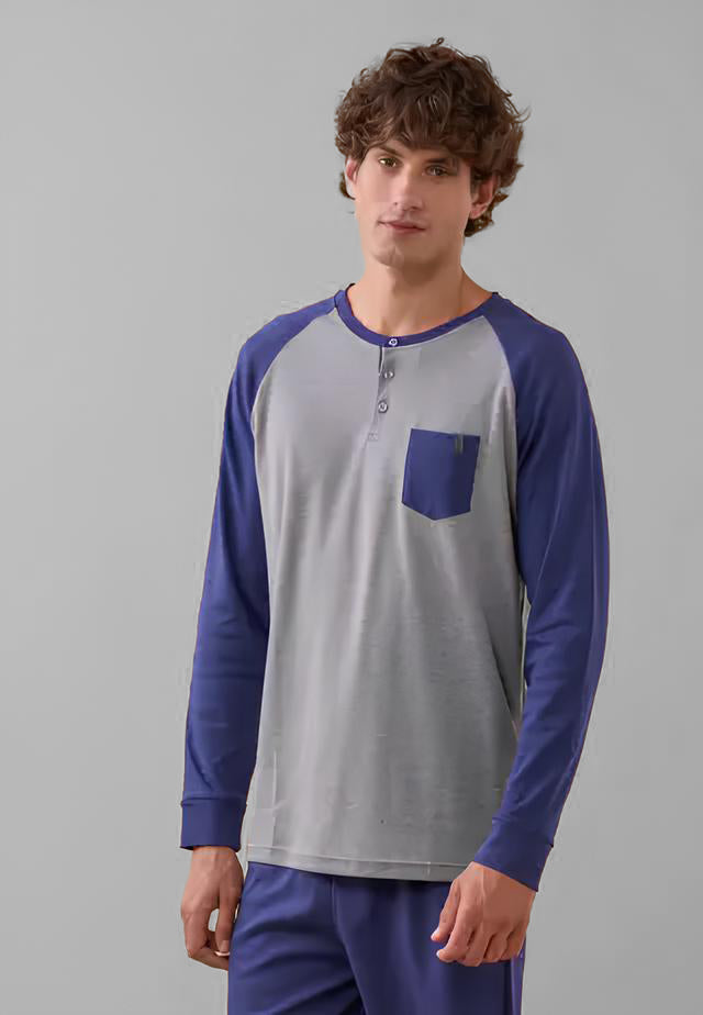 Il pigiama uomo manica lunga collo serafino di NOI DI NOTTE è la scelta ideale per affrontare le notti più fredde con comfort e stile. Realizzato in caldo interlock di cotone invernale, offre una sensazione di morbidezza e calore che accompagna ogni movimento. Il design elegante, caratterizzato da una raffinata tinta unita con maniche e pantaloni in contrasto, esprime il gusto unico del brand NOI DI NOTTE, da sempre sinonimo di qualità e cura nei dettagli. Perfetto per chi cerca un pigiama da uomo comodo ma con un tocco di classe, questo modello unisce tradizione sartoriale e stile contemporaneo, rendendolo ideale sia per il relax serale sia per un look curato anche nei momenti di riposo.