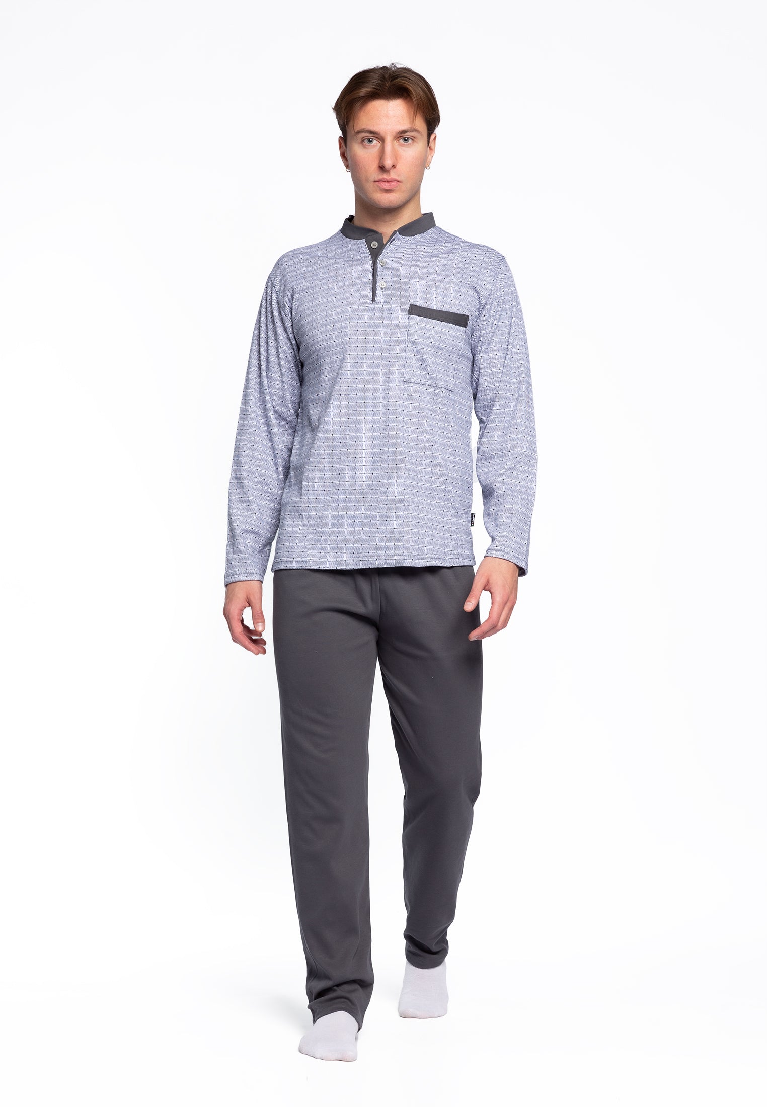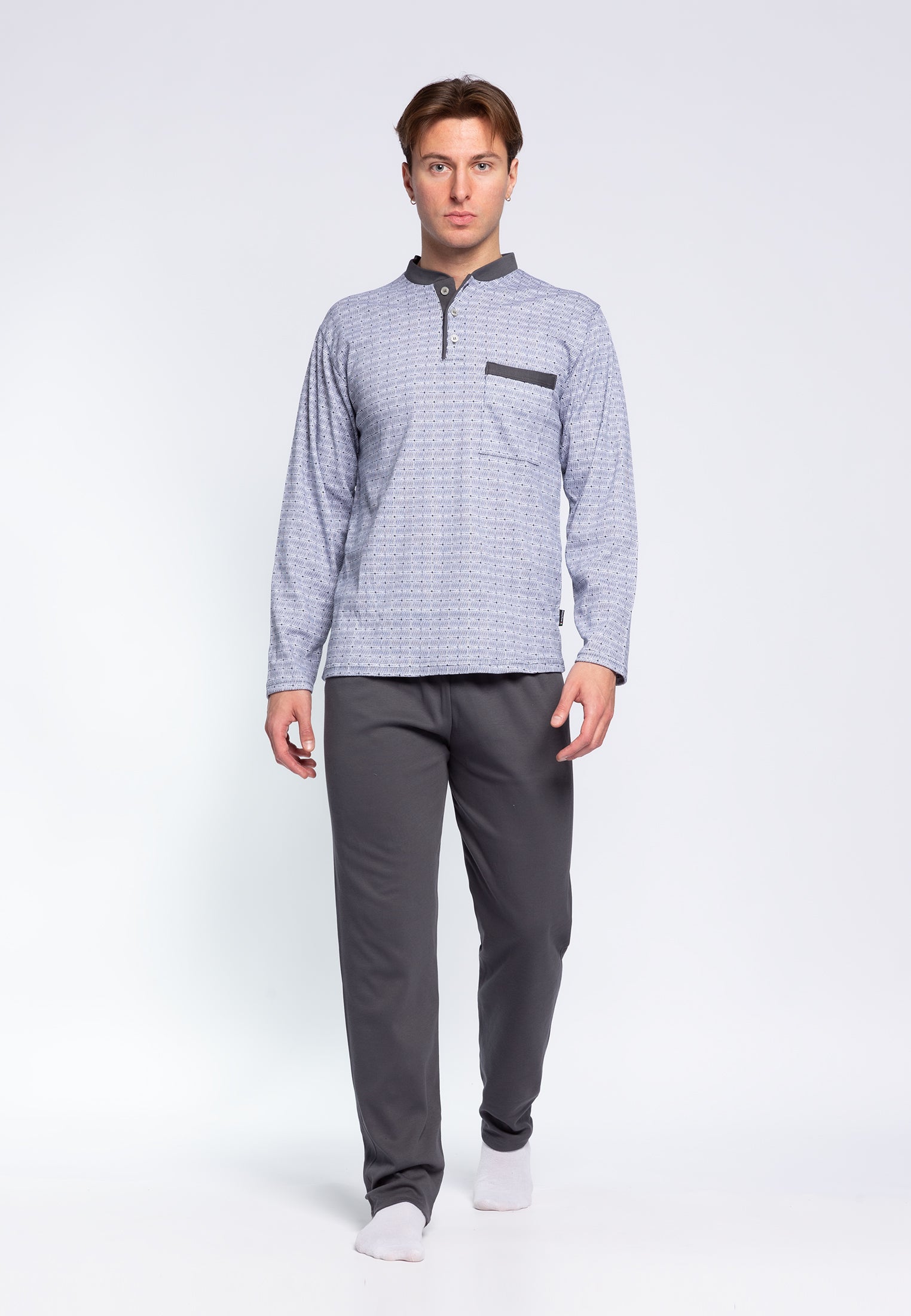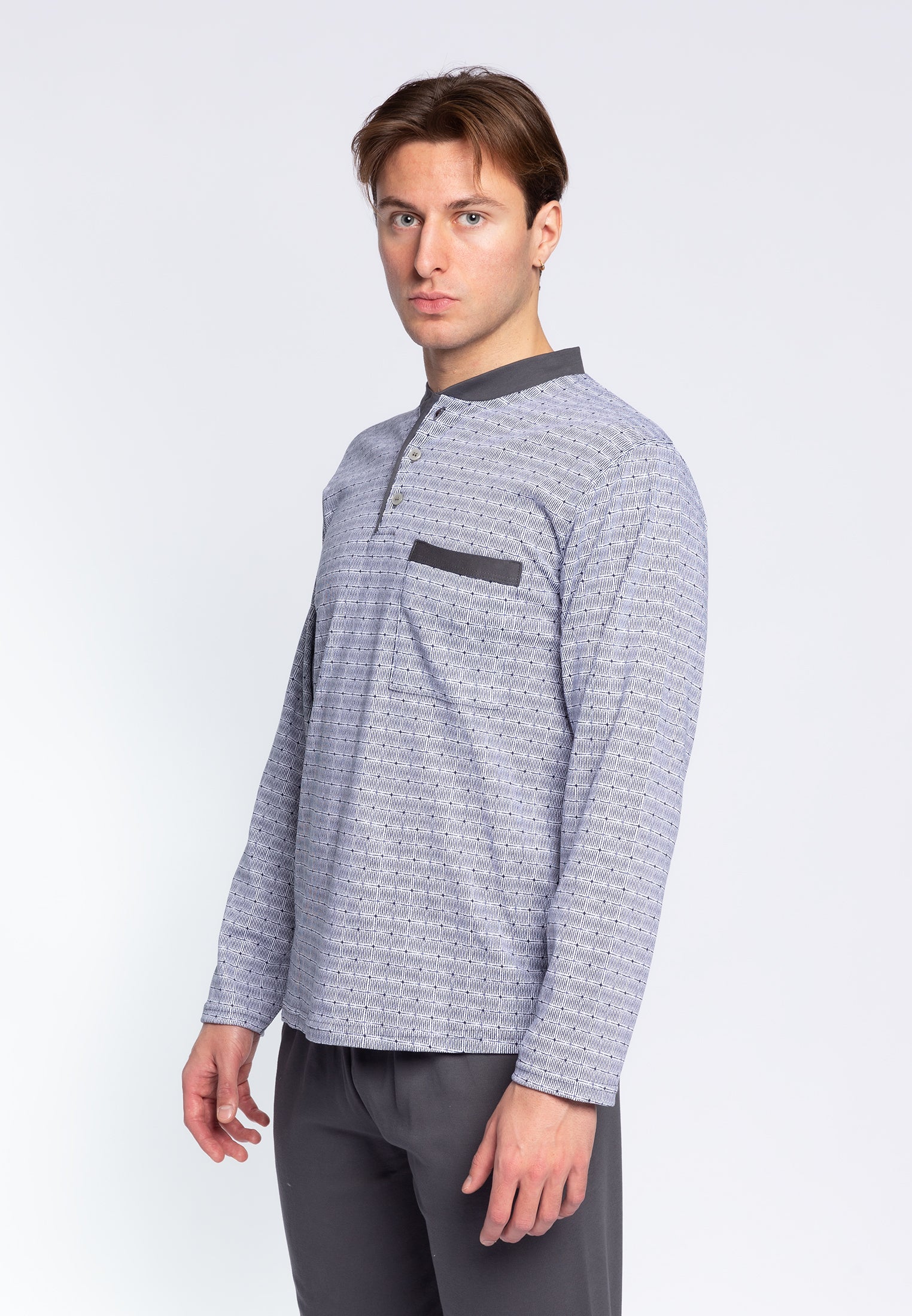 Pigiama da uomo in 100% cotone interlock fantasia micro quadretti Made in italy a maniche lunghe, con collo a serafino, senza polsini, orlato per una vestibilità ottimale. la maglia presenta una micro fantasia all over spigata e un taschino sul petto. Pantalone tinta unita orlato e con elastico in vita. I pigiami BIP BIP rappresentano il meglio dell'artigianato italiano.