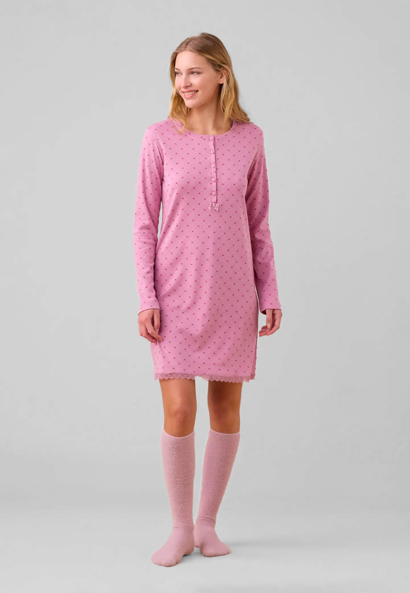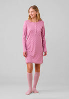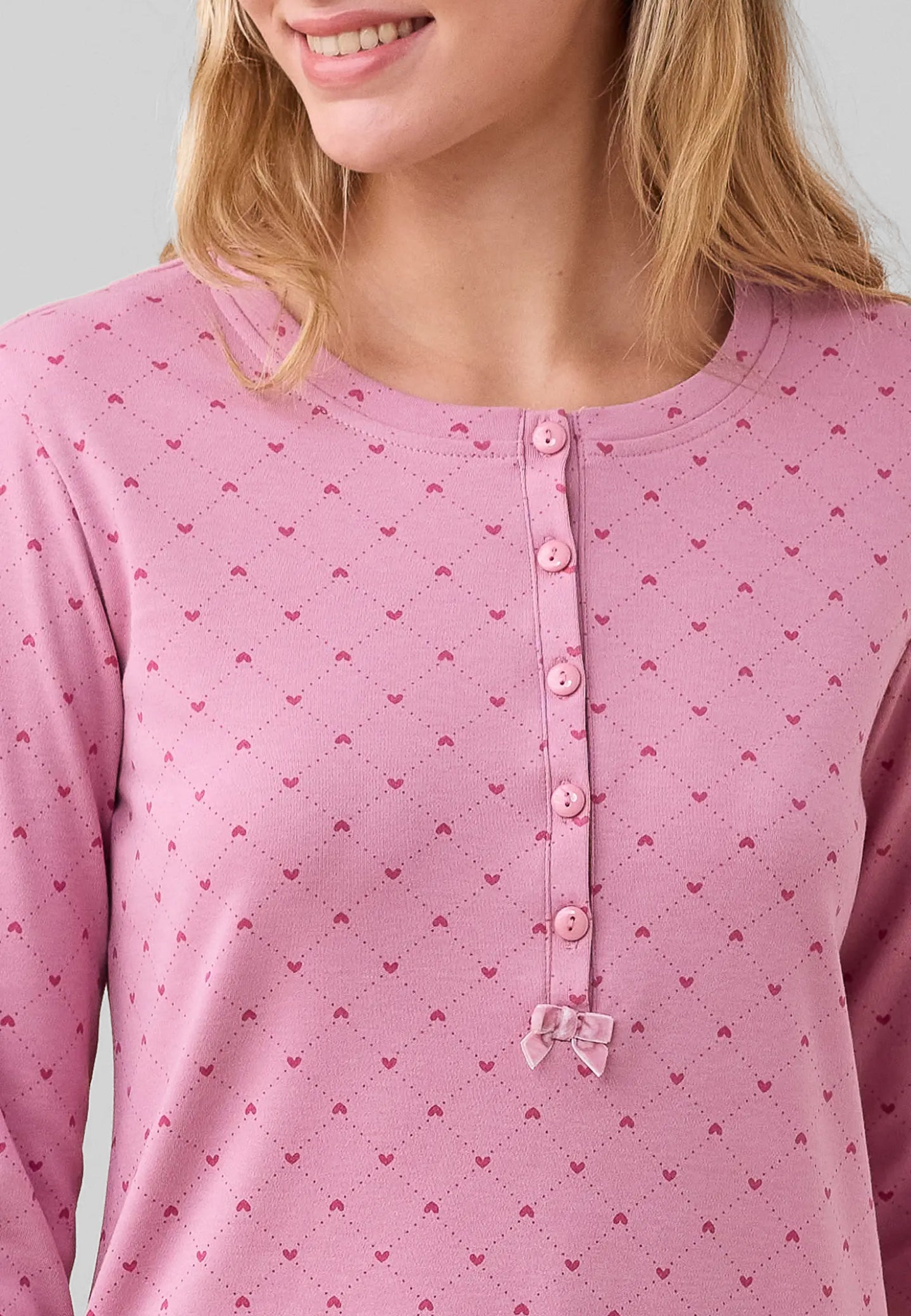La camicia da notte da donna NOI DI NOTTE è la scelta ideale per chi cerca un pigiama invernale caldo, morbido e confortevole, perfetto per riposare al meglio durante le notti più fredde. Realizzata in interlock di cotone felpato, questa camicia da notte offre una piacevole sensazione di calore e delicatezza sulla pelle, risultando ideale per chi desidera un capo di qualità pensato per il benessere femminile. Il modello presenta manica lunga e collo serafino, un dettaglio che aggiunge praticità e un tocco di stile giovane e moderno. La fantasia a cuoricini rende il pigiama ancora più femminile e raffinato. Un capo ideale per chi desidera un pigiama donna invernale che unisce comfort, qualità e stile unico firmato NOI DI NOTTE.