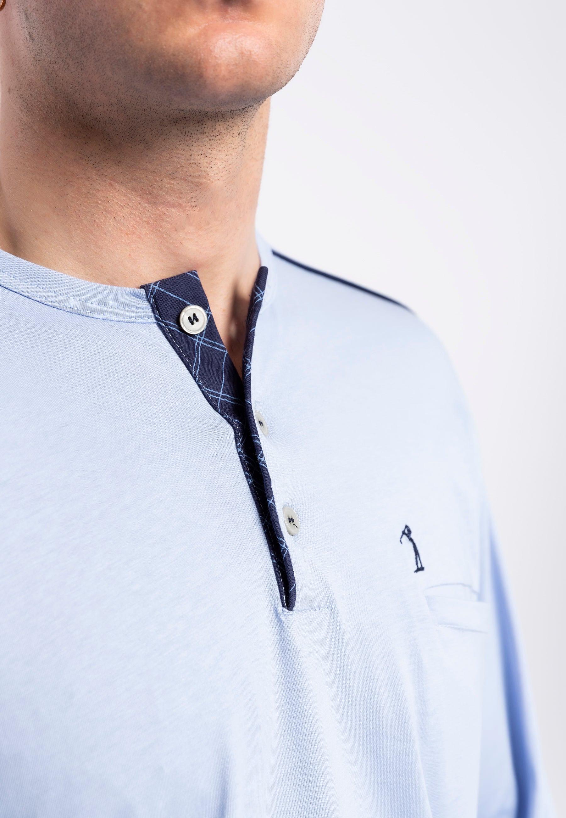 Unisce stile e comfort questo pigiama uomo in maglina di puro cotone leggero con maniche lunghe. Perfetto per una notte di sonno tranquillo, ti farà sentire a tuo agio. Semplice e di alta qualità, l'aggiunta perfetta al tuo guardaroba notturno. Buon riposo in stile con il nostro pigiama. Capo prodotto in Italia. Made in Italy.