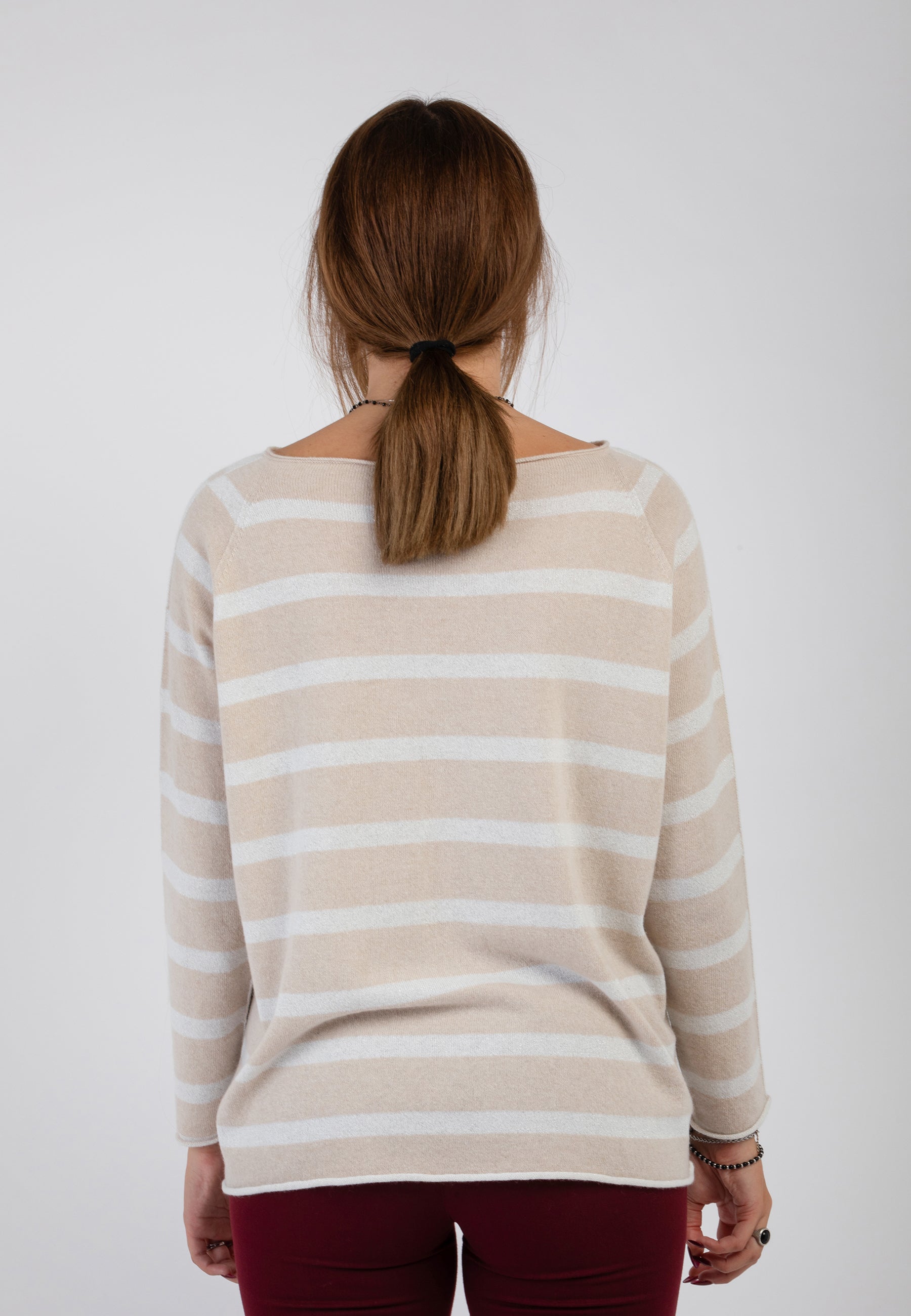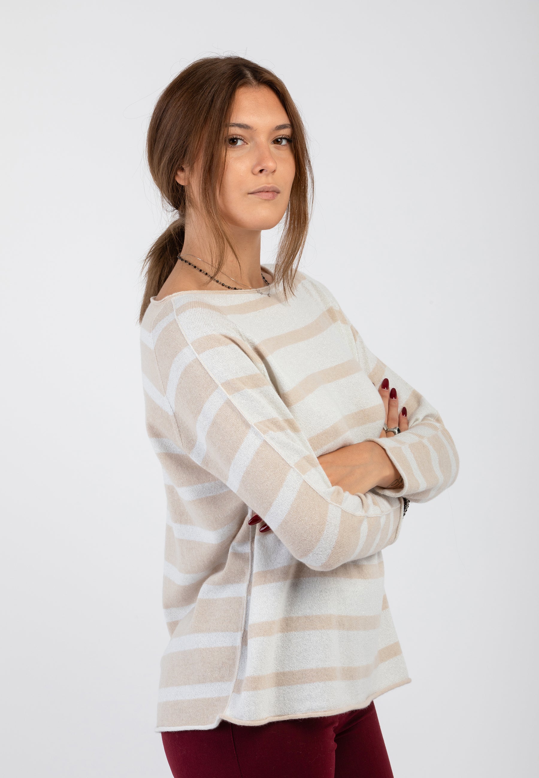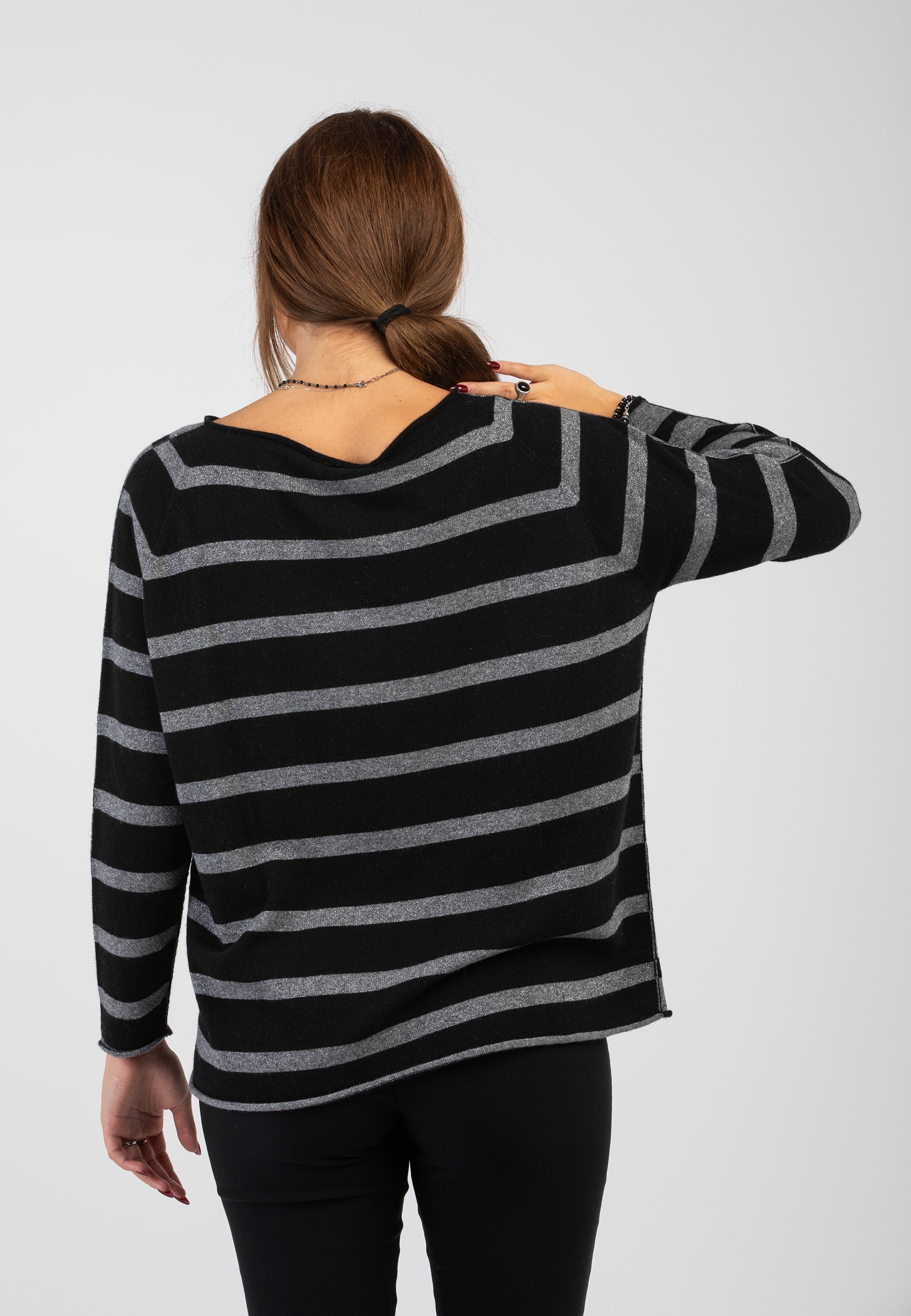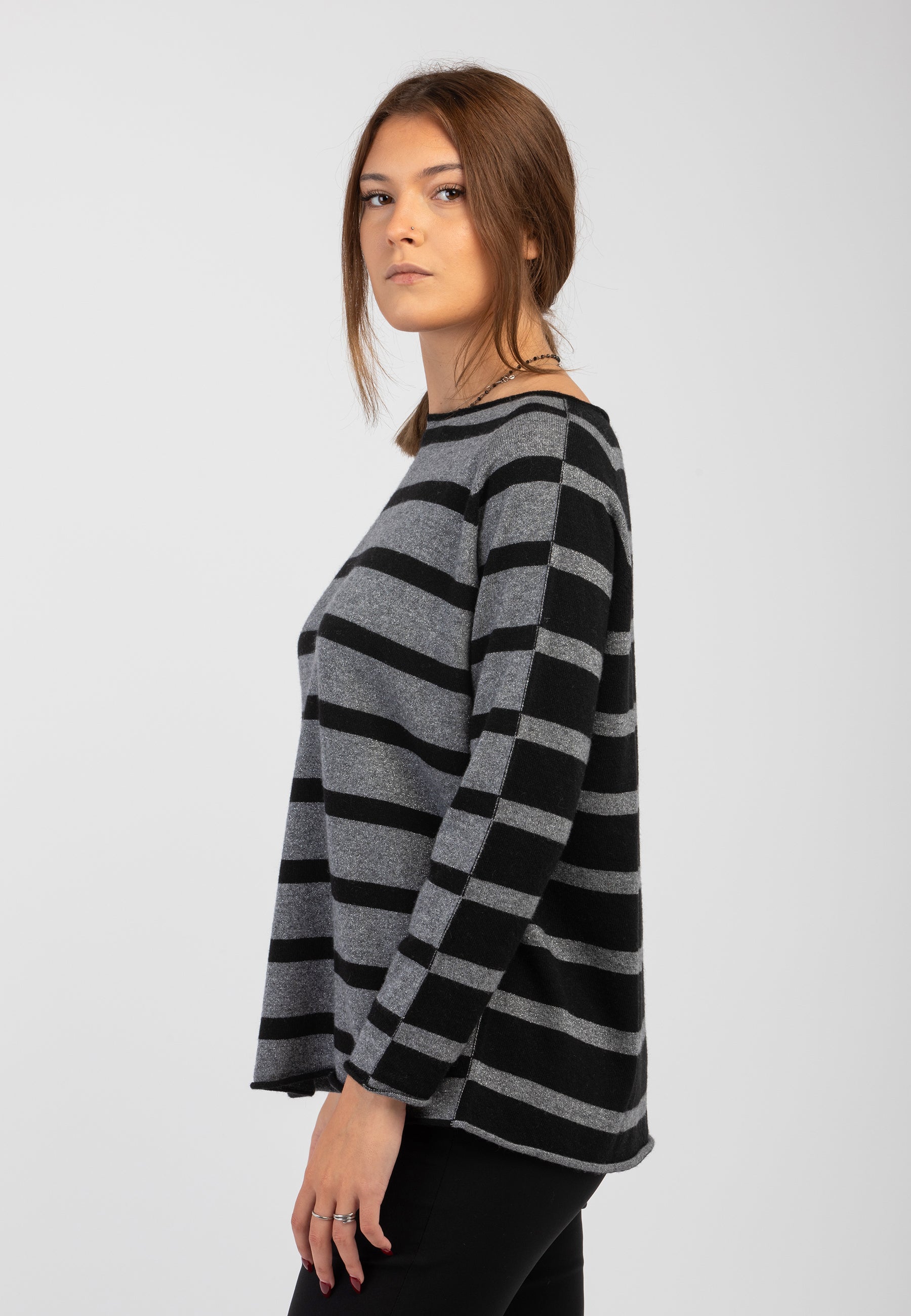 Espandi il tuo guardaroba con la nostra maglia da donna PREMODE girocollo rigata in filato di lana e cashmere. Grazie ai suoi inserti in lurex e al dorso con colore inverso, questa maglia ti darà un tocco di eleganza e stile unico. La lana e il cashmere la rendono anche calda e confortevole. Affida al nostro prodotto la tua bellezza e il tuo comfort. Capo prodotto in Italia. Made in Italy.