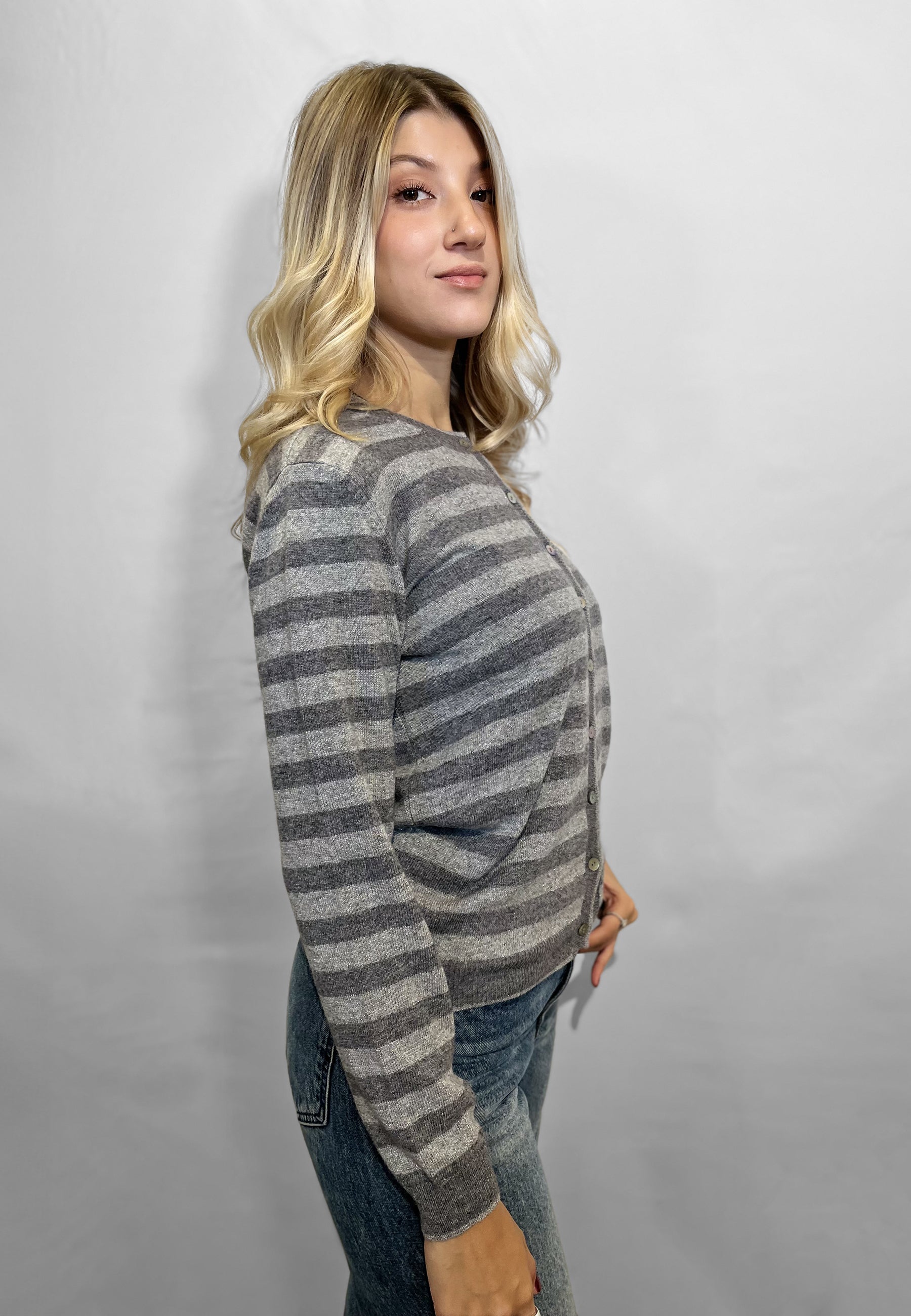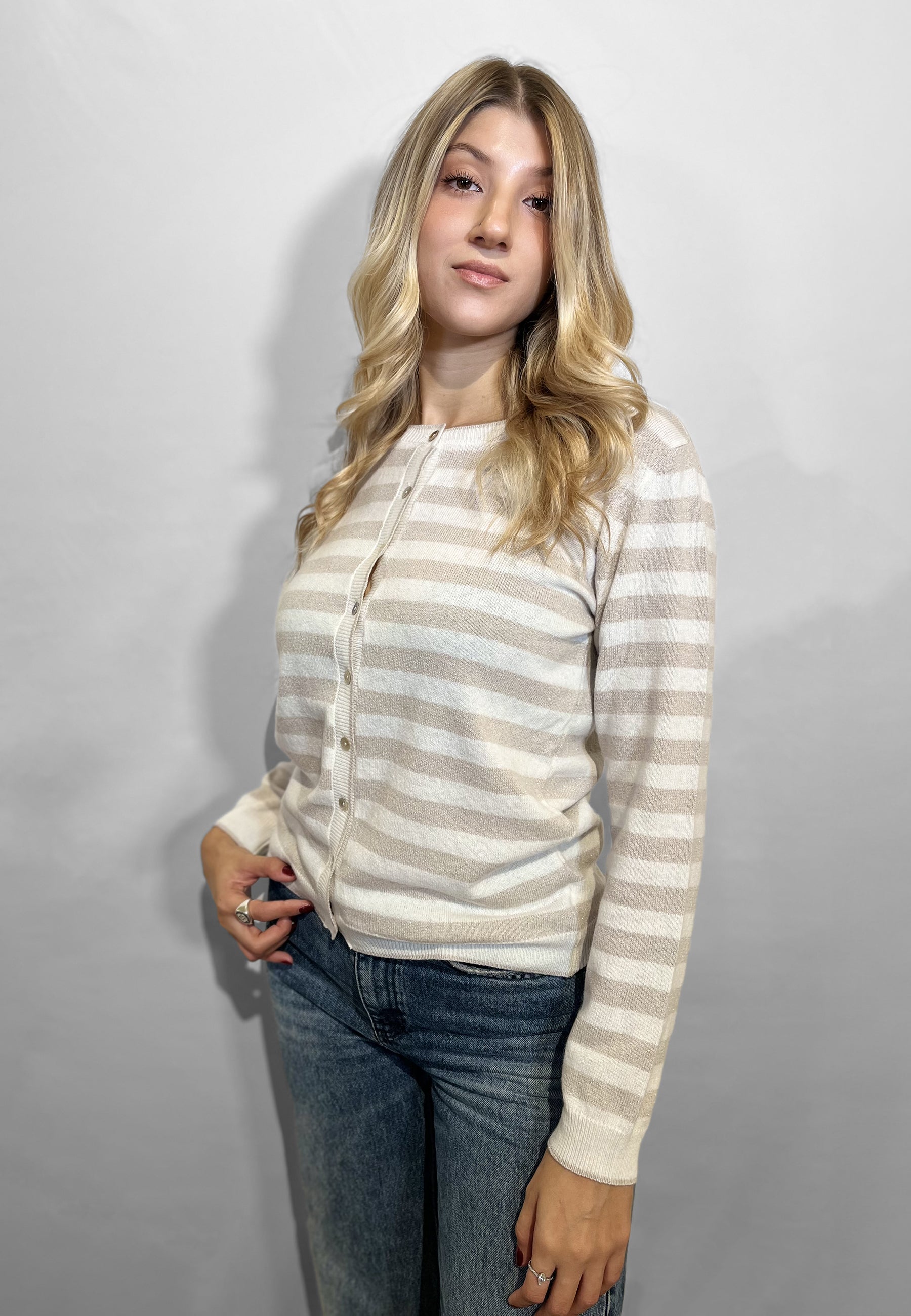 Scopri la giacca a bottoni da donna in maglia di lana e cashmere firmata PREMODE, un capo elegante e confortevole pensato per chi ama la qualità e lo stile italiano. Realizzata con filati pregiati, questa giacca coreana rigata con inserti lurex unisce la morbidezza del cashmere alla resistenza della lana, offrendo una vestibilità perfetta e un look raffinato per ogni occasione. La texture in maglia sottolinea la cura artigianale tipica di PREMODE, brand specializzato in maglieria da donna di alta qualità. Ideale per completare outfit casual chic o abbinamenti più eleganti, la giacca in lana e cashmere PREMODE dona calore, luminosità e comfort in ogni stagione, rappresentando una scelta di stile senza tempo per la donna moderna. Capo prodotto in Italia. Made in Italy.