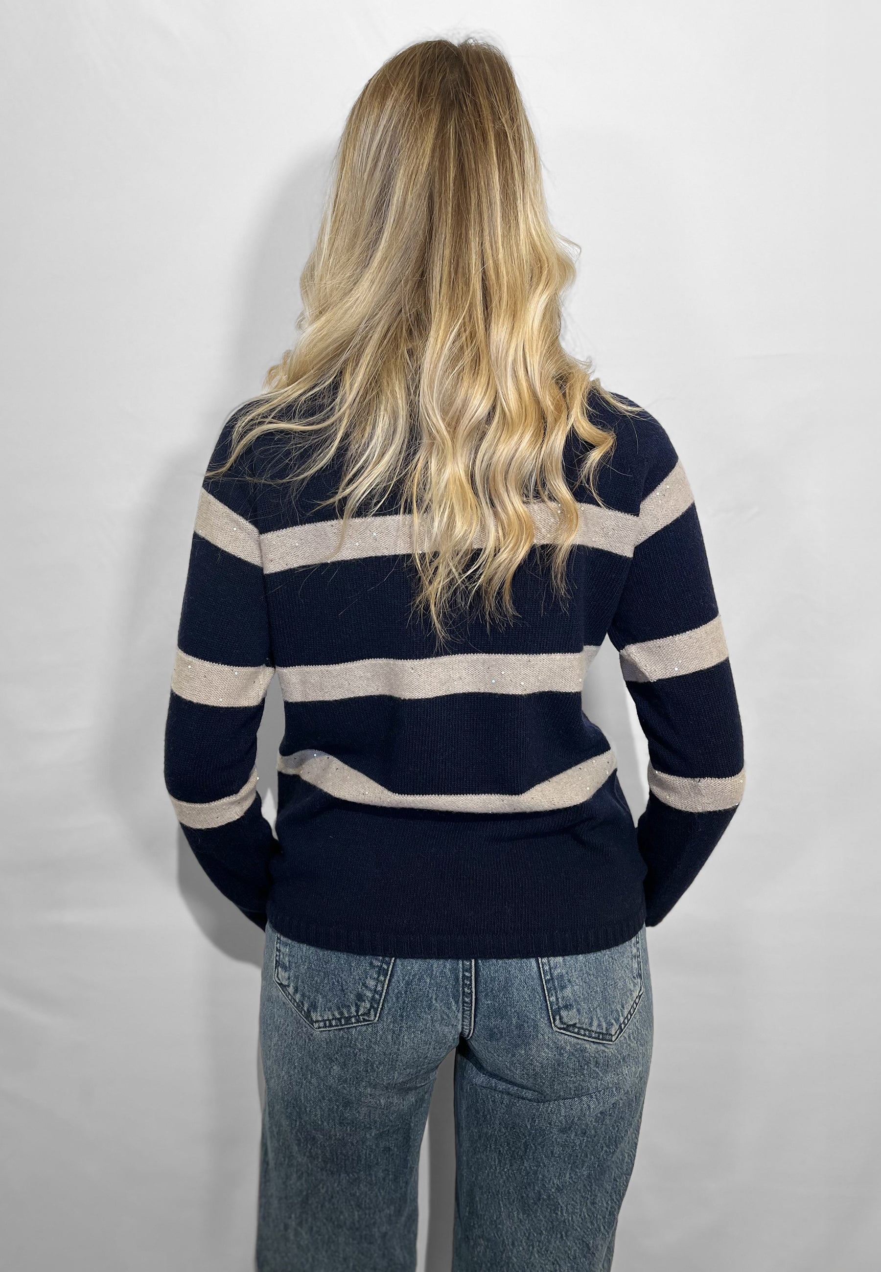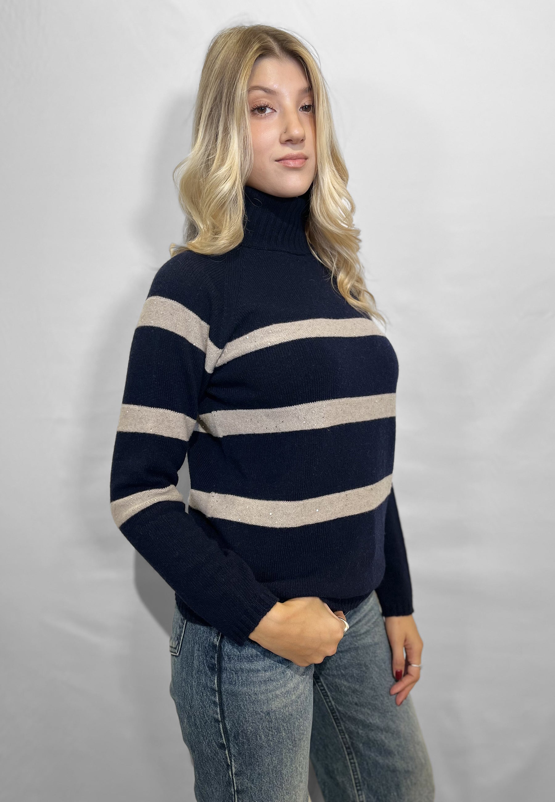 Scopri la maglia donna a manica lunga con collo alto dolcevita di PREMODE, realizzata in un pregiato mix di lana e cashmere per offrire comfort, morbidezza e una vestibilità impeccabile. Questo capo di maglieria femminile unisce eleganza e calore, ideale per la stagione invernale e per chi cerca uno stile raffinato senza rinunciare alla comodità. Il design rigato con delicati inserti di paillettes dona un tocco di luce e femminilità, rendendo questa maglia perfetta sia per un look casual chic da giorno che per un outfit più sofisticato da sera. PREMODE, brand specializzato in maglieria da donna di alta qualità, propone capi curati nei dettagli e realizzati con filati pregiati per garantire durata e stile in ogni occasione. Scegli la maglia dolcevita di lana e cashmere PREMODE per valorizzare il tuo guardaroba con un capo versatile, elegante e sempre attuale.