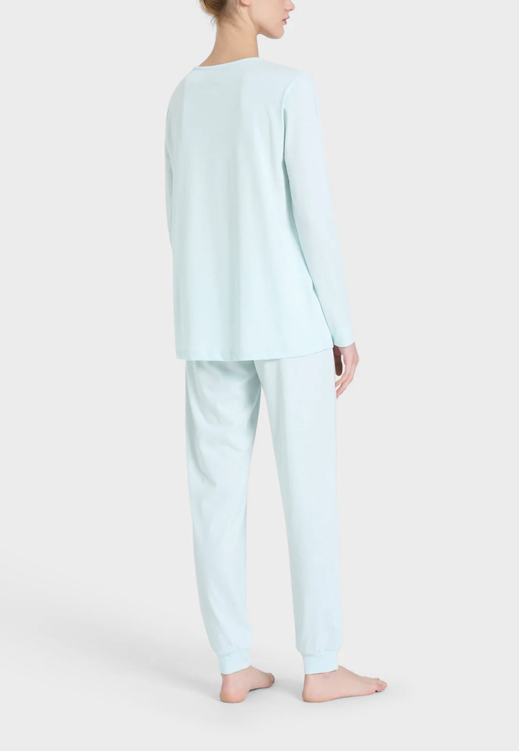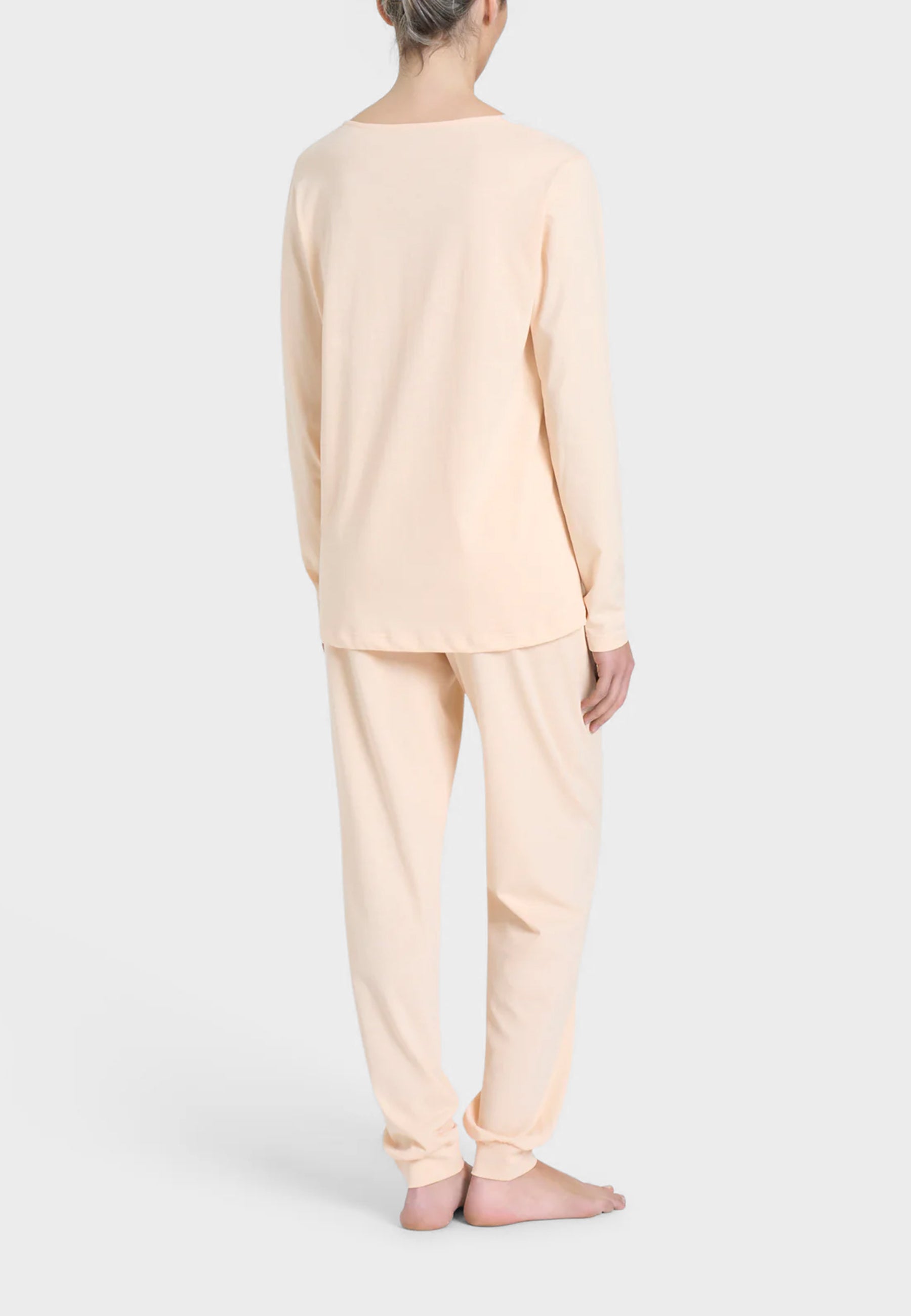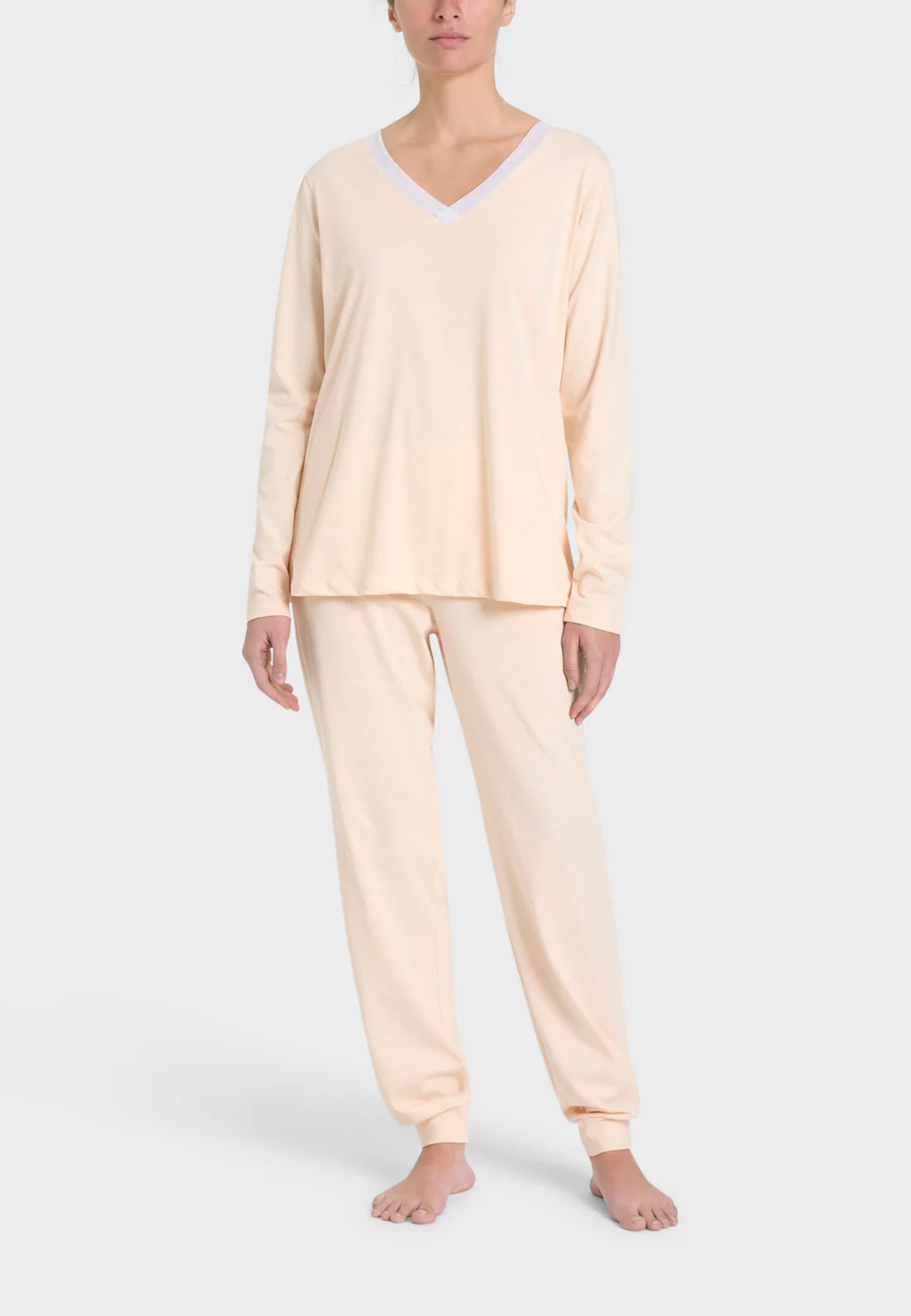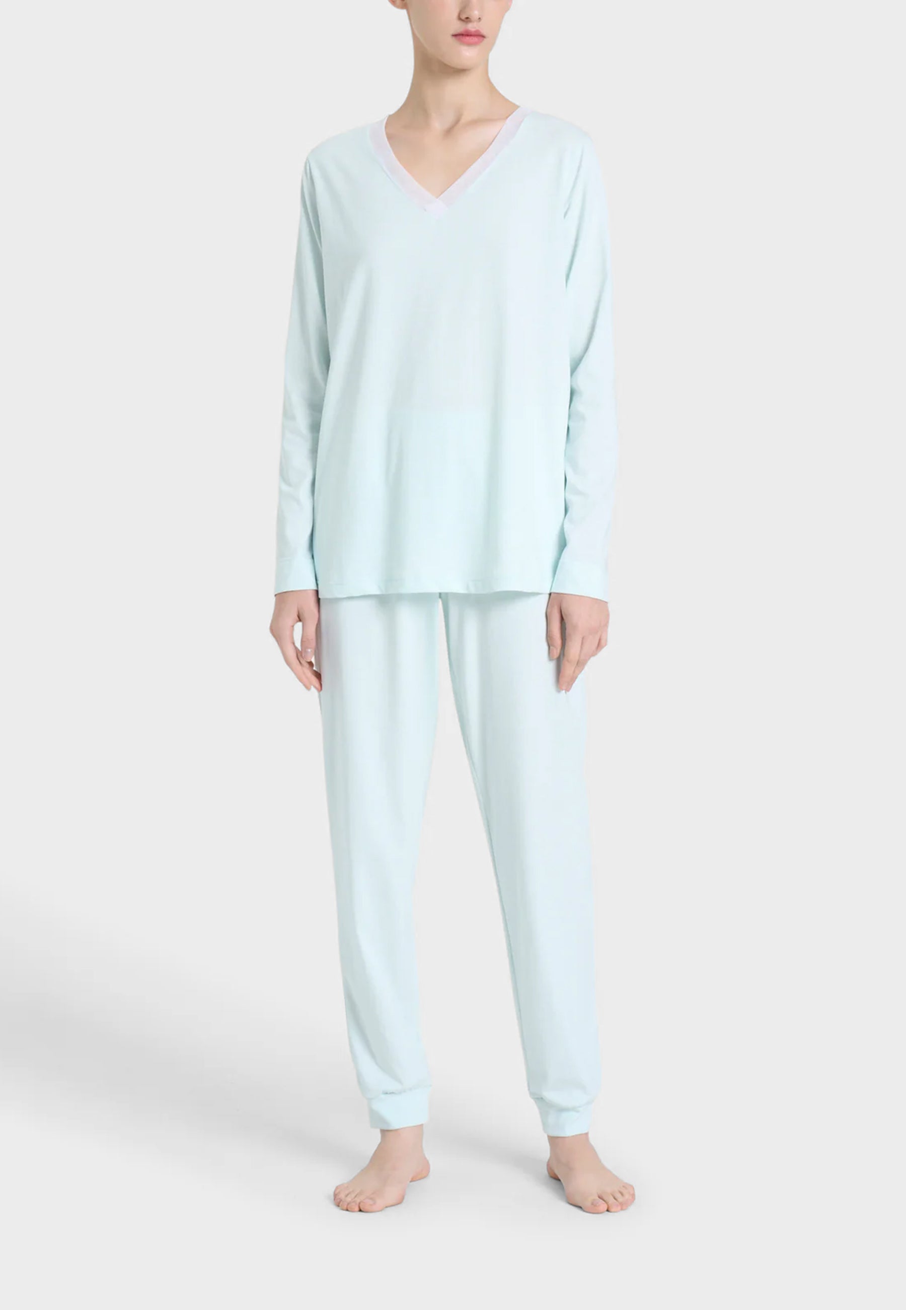 Il pigiama a manica lunga in jersey di cotone di RAGNO unisce comfort e raffinatezza per accompagnare le tue notti con uno stile elegante e senza tempo. Realizzato in jersey leggero, offre una piacevole sensazione di morbidezza sulla pelle, garantendo il massimo del benessere durante il riposo. Il design è impreziosito da uno scollo a V, valorizzato da un delicato bordo in tulle che aggiunge un tocco di femminilità e ricercatezza. Perfetto per chi ama sentirsi comoda senza rinunciare all'eleganza, questo pigiama rappresenta la scelta ideale per le serate rilassanti e i momenti di puro relax.