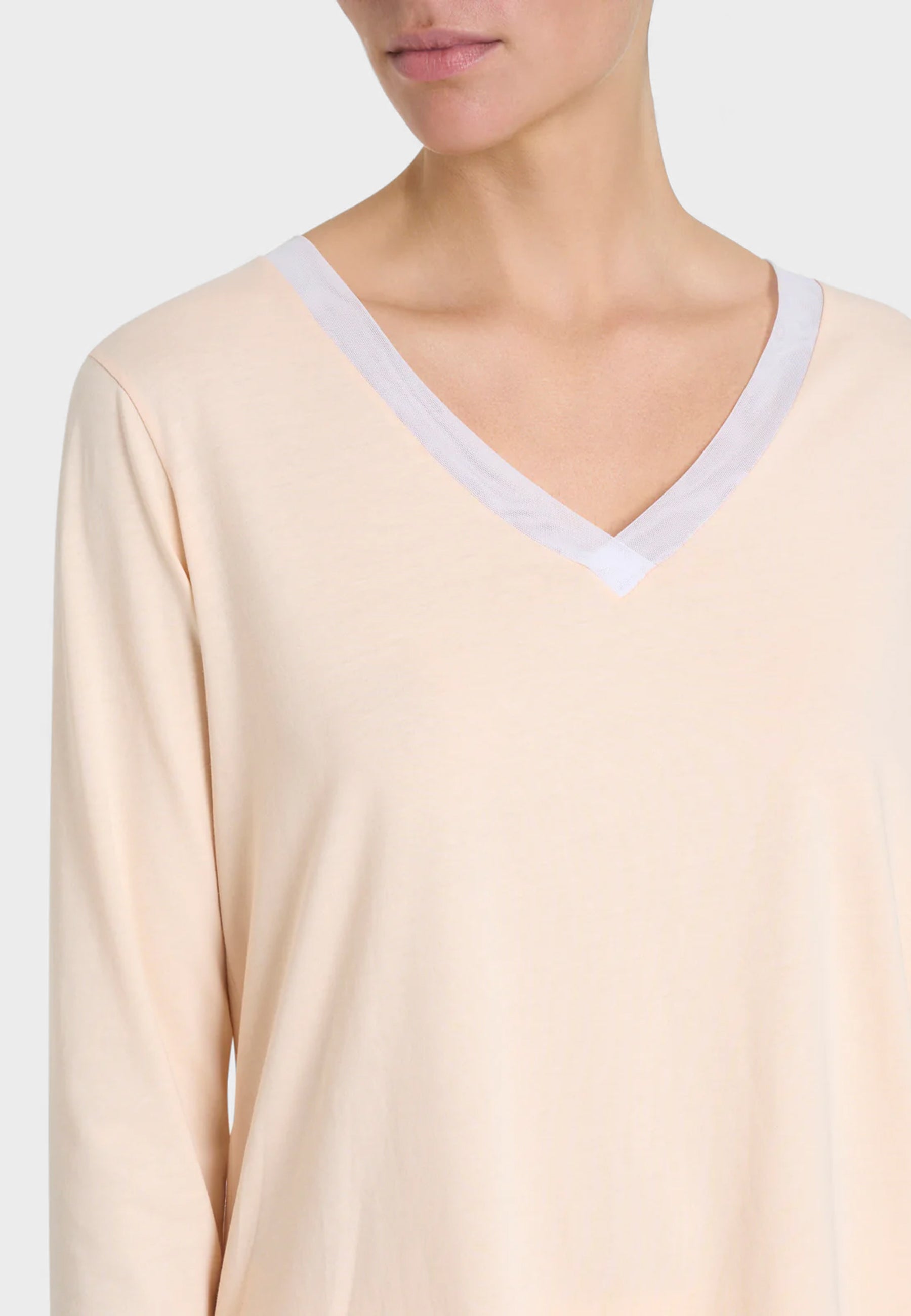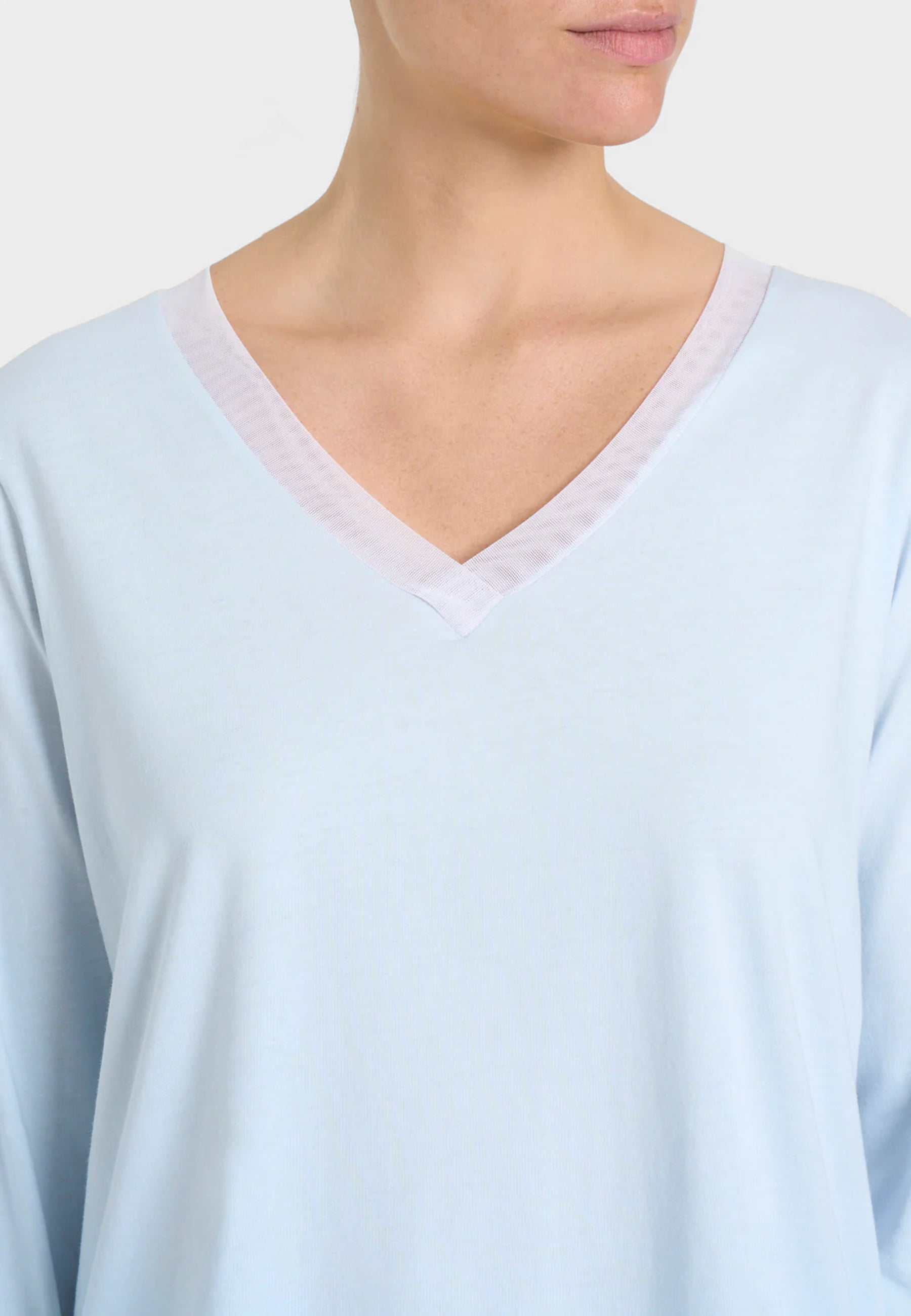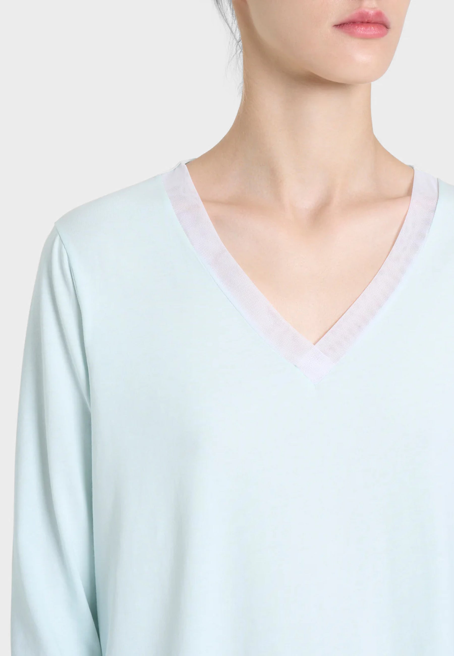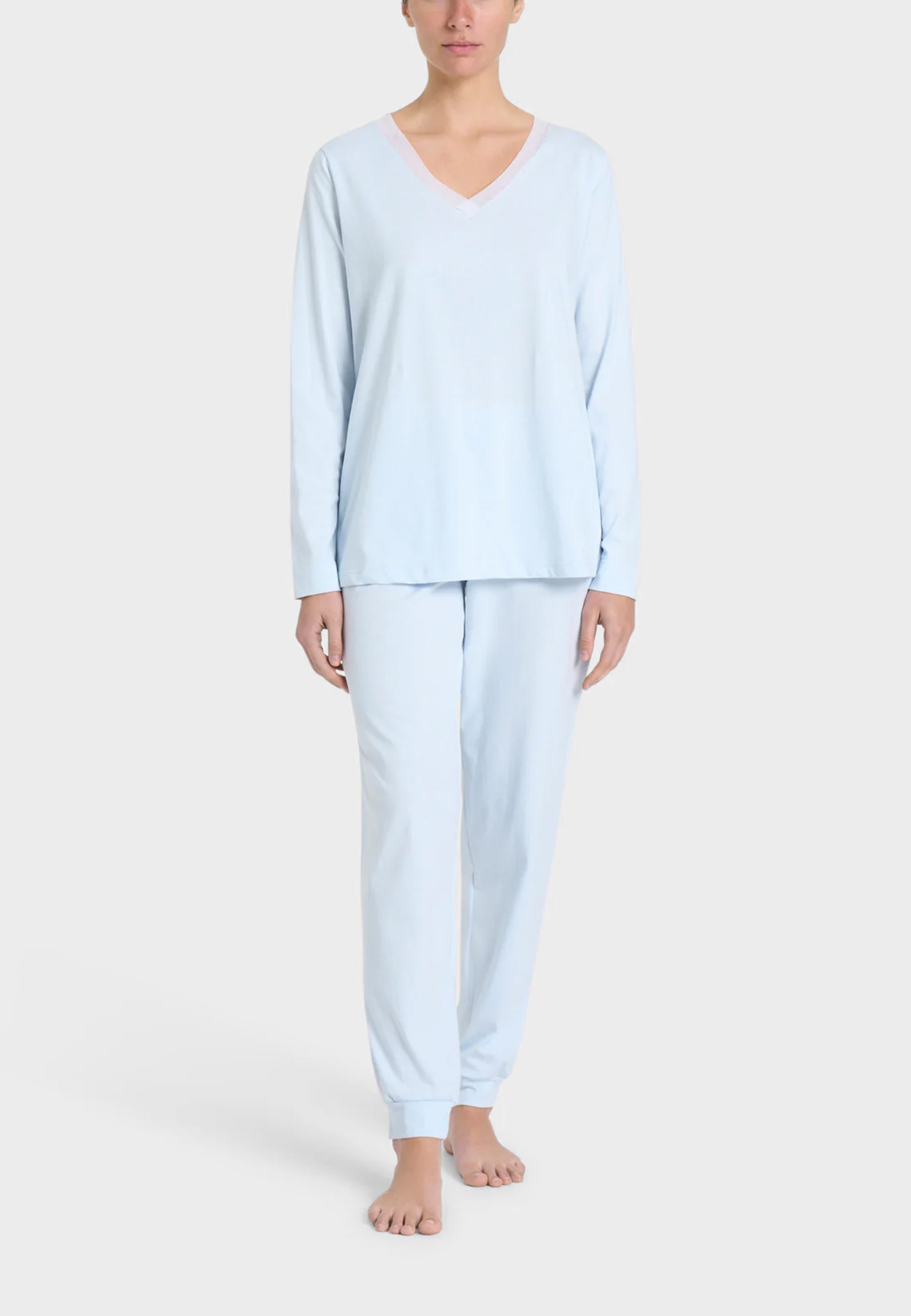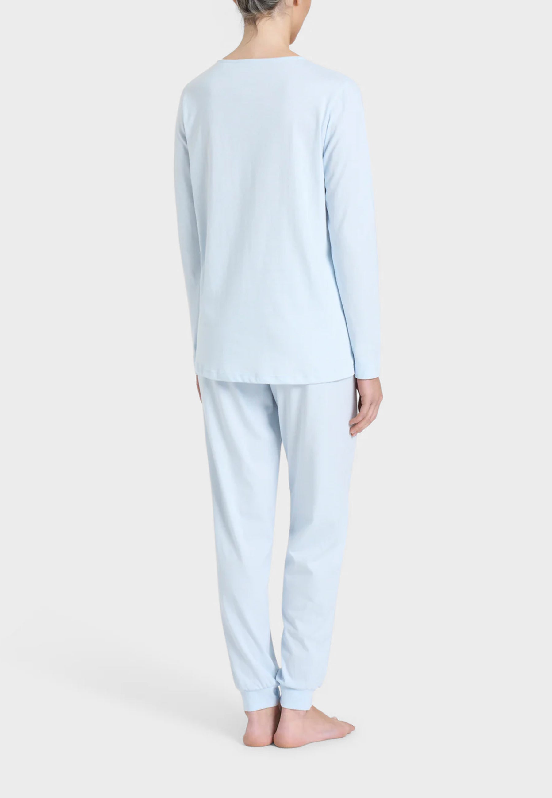 Il pigiama a manica lunga in jersey di cotone di RAGNO unisce comfort e raffinatezza per accompagnare le tue notti con uno stile elegante e senza tempo. Realizzato in jersey leggero, offre una piacevole sensazione di morbidezza sulla pelle, garantendo il massimo del benessere durante il riposo. Il design è impreziosito da uno scollo a V, valorizzato da un delicato bordo in tulle che aggiunge un tocco di femminilità e ricercatezza. Perfetto per chi ama sentirsi comoda senza rinunciare all'eleganza, questo pigiama rappresenta la scelta ideale per le serate rilassanti e i momenti di puro relax.