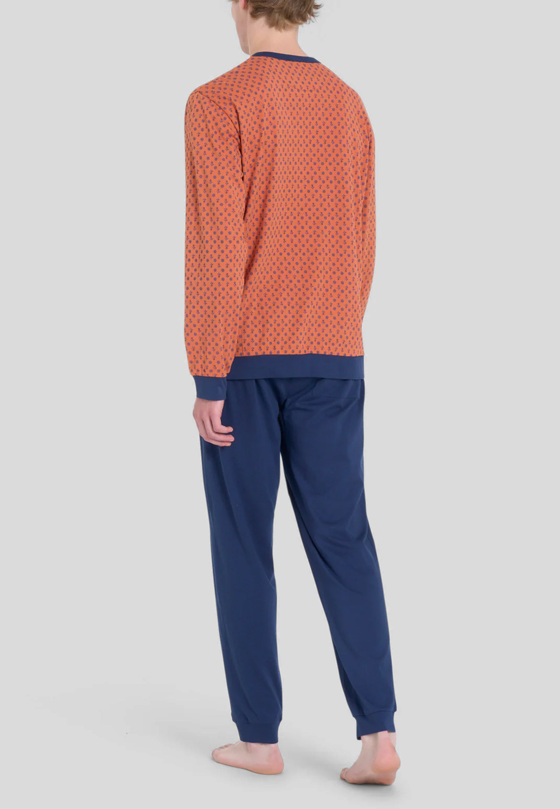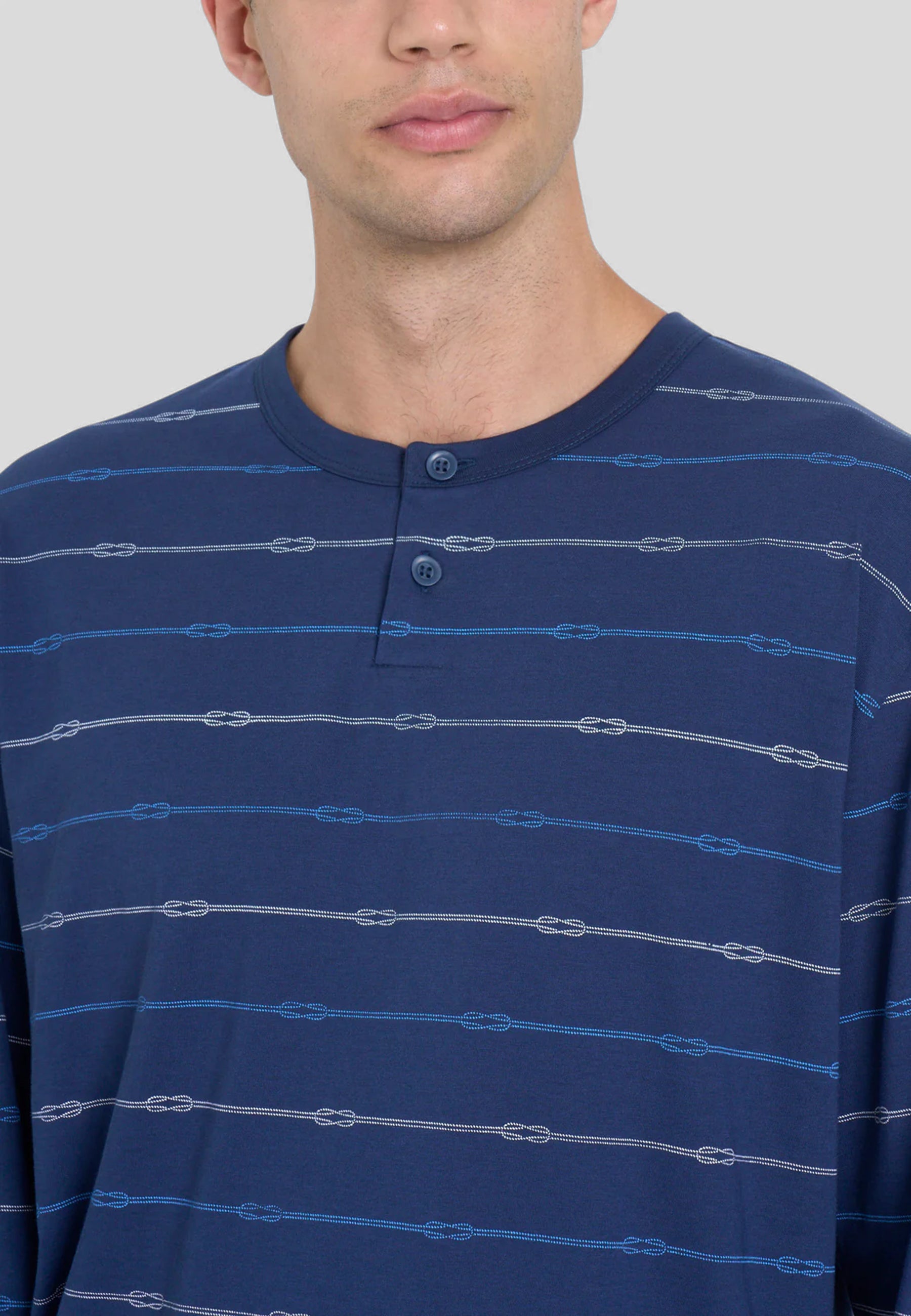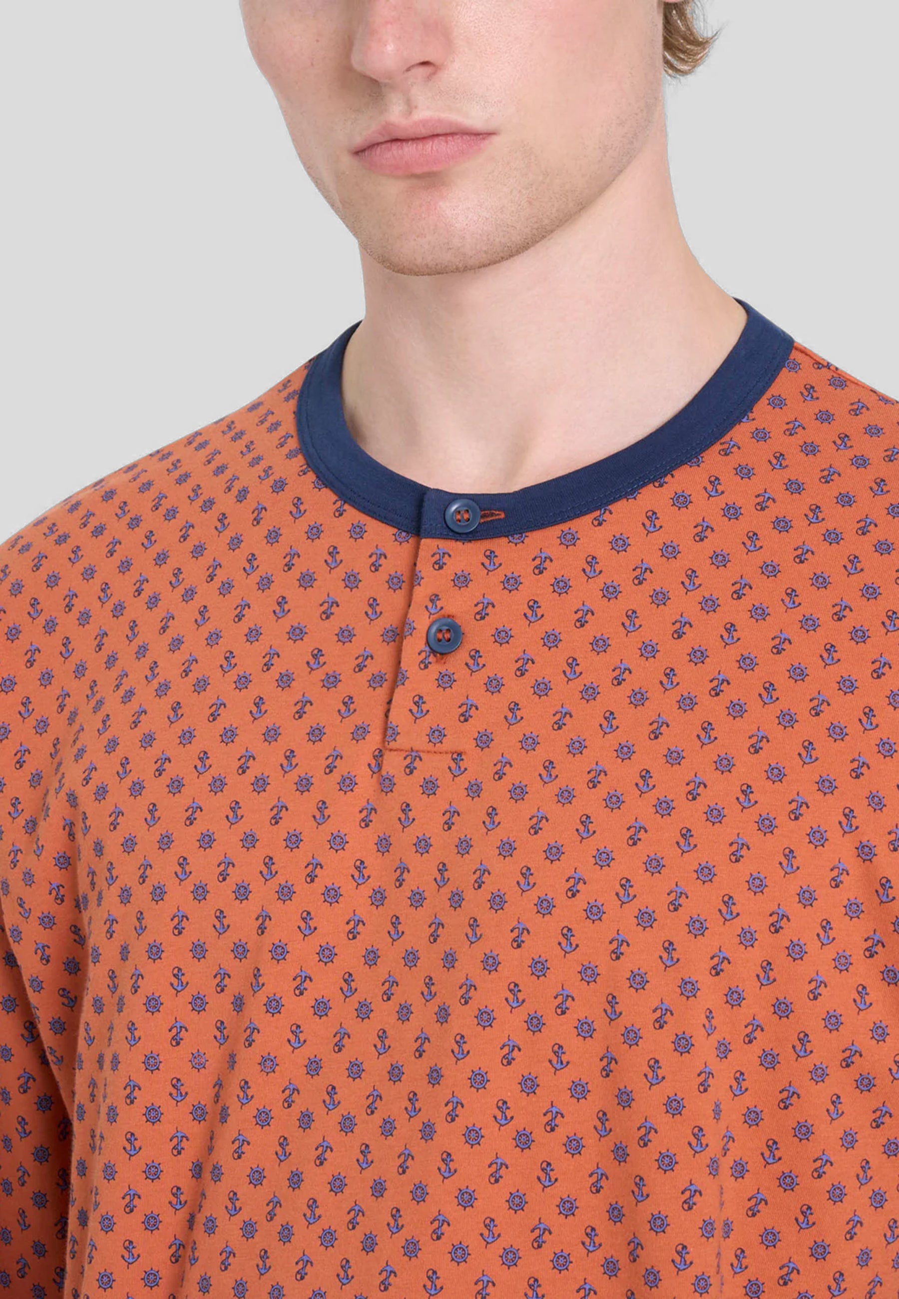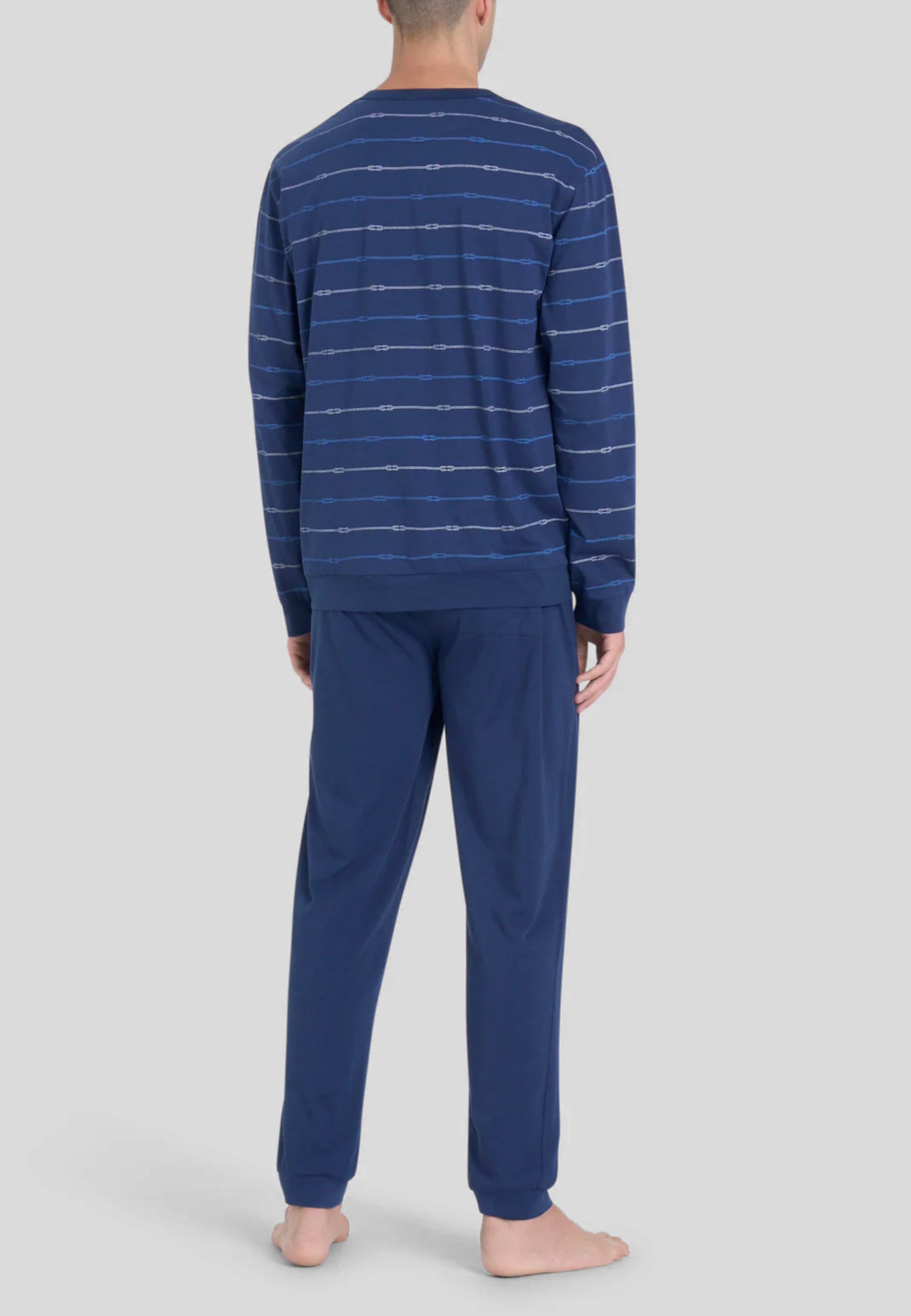 Scopri il pigiama da uomo a manica lunga di RAGNO, realizzato in morbido jersey di puro cotone leggero per garantire il massimo comfort in ogni stagione. Il design elegante con fantasia di ancore e timoni aggiunge un tocco di stile marinaro, perfetto per chi ama i dettagli raffinati anche nei momenti di relax. Il tessuto traspirante assicura una piacevole sensazione sulla pelle, mentre la vestibilità comoda offre libertà di movimento durante il riposo. Ideale per le notti più fresche, questo pigiama unisce qualità e stile in un capo essenziale per il guardaroba maschile.
