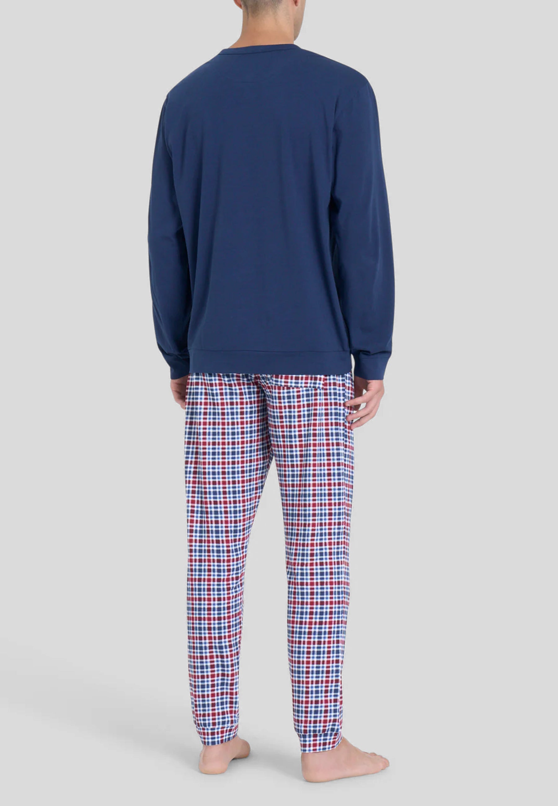 Il pigiama lungo da uomo di RAGNO combina comfort e stile per garantire un riposo piacevole in ogni stagione. La maglia a tinta unita con collo a serafino e maniche lunghe offre una vestibilità morbida e avvolgente, perfetta per le serate più fresche. Il pantalone in jersey di cotone, caratterizzato da un elegante motivo a quadri, aggiunge un tocco di personalità mantenendo la massima leggerezza e traspirabilità. Realizzato con materiali di alta qualità, questo pigiama è ideale per chi cerca il perfetto equilibrio tra praticità e raffinatezza, assicurando una sensazione di benessere notte dopo notte.