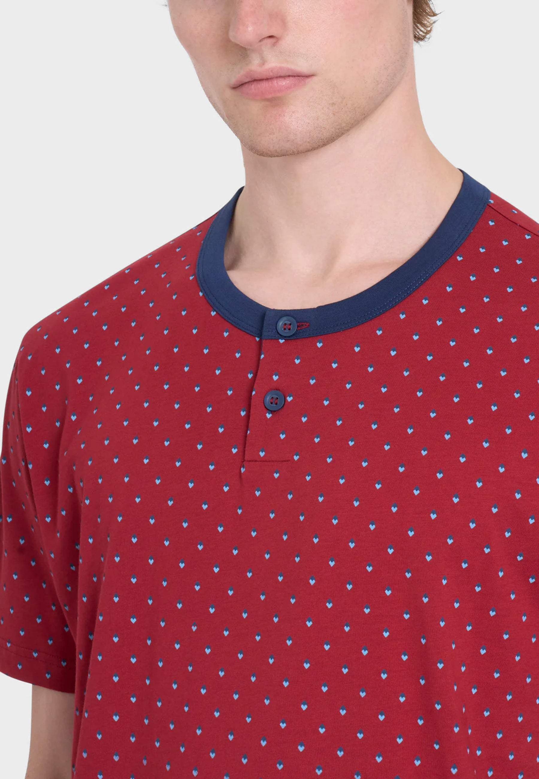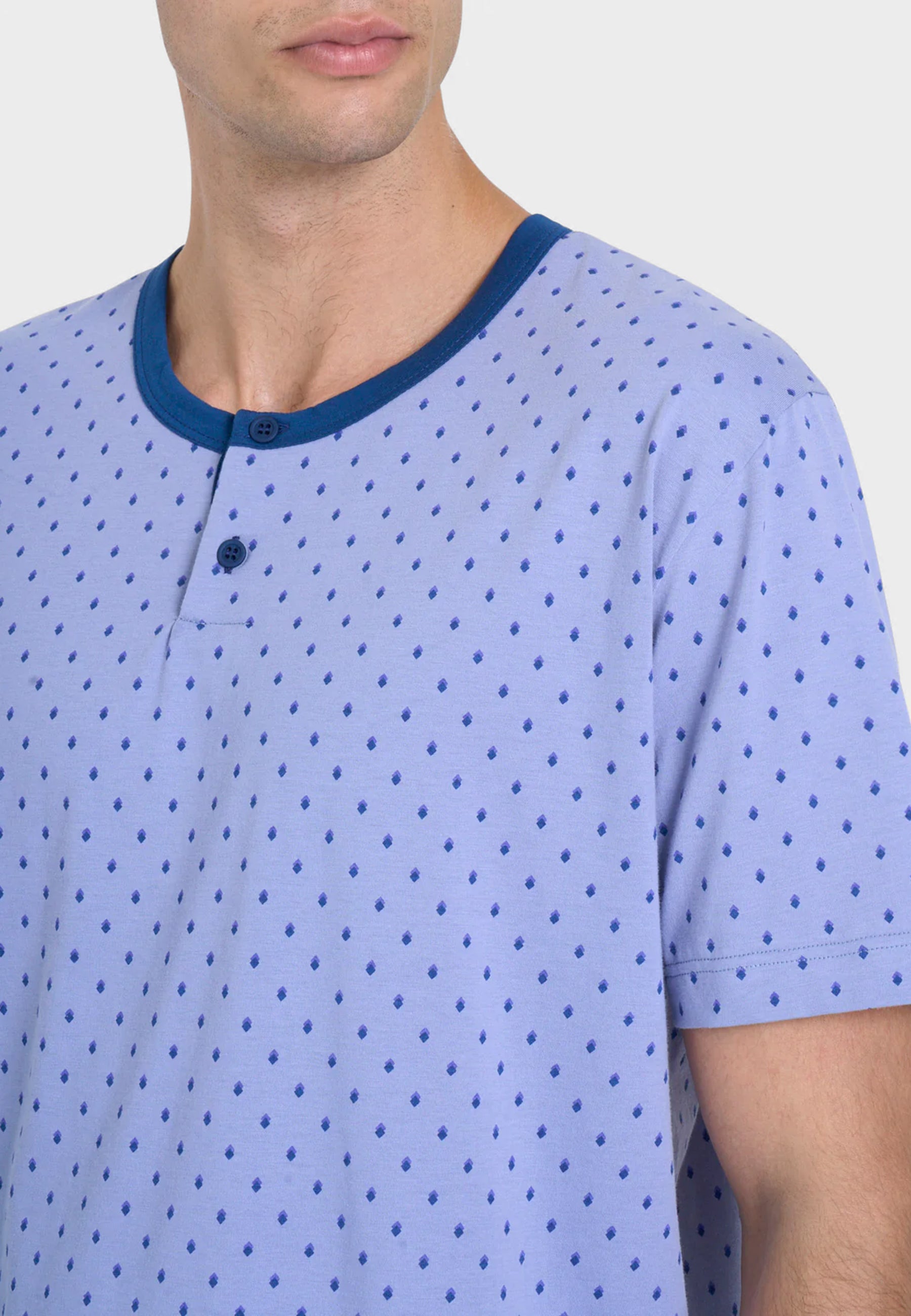Il pigiama da uomo in jersey di cotone di RAGNO combina comfort e stile per garantire un riposo ottimale in ogni stagione. La maglia a manica corta con collo a serafino presenta una fantasia moderna e ricercata, perfetta per chi ama dettagli distintivi anche nei capi da notte. Il pantalone corto in tinta unita, dotato di una pratica tasca posteriore, offre una vestibilità comoda e funzionale. Realizzato in morbido jersey di cotone, questo pigiama assicura una sensazione di freschezza e leggerezza sulla pelle, ideale per le notti più calde. Un capo essenziale per chi cerca qualità, praticità e un tocco di eleganza anche nei momenti di relax.