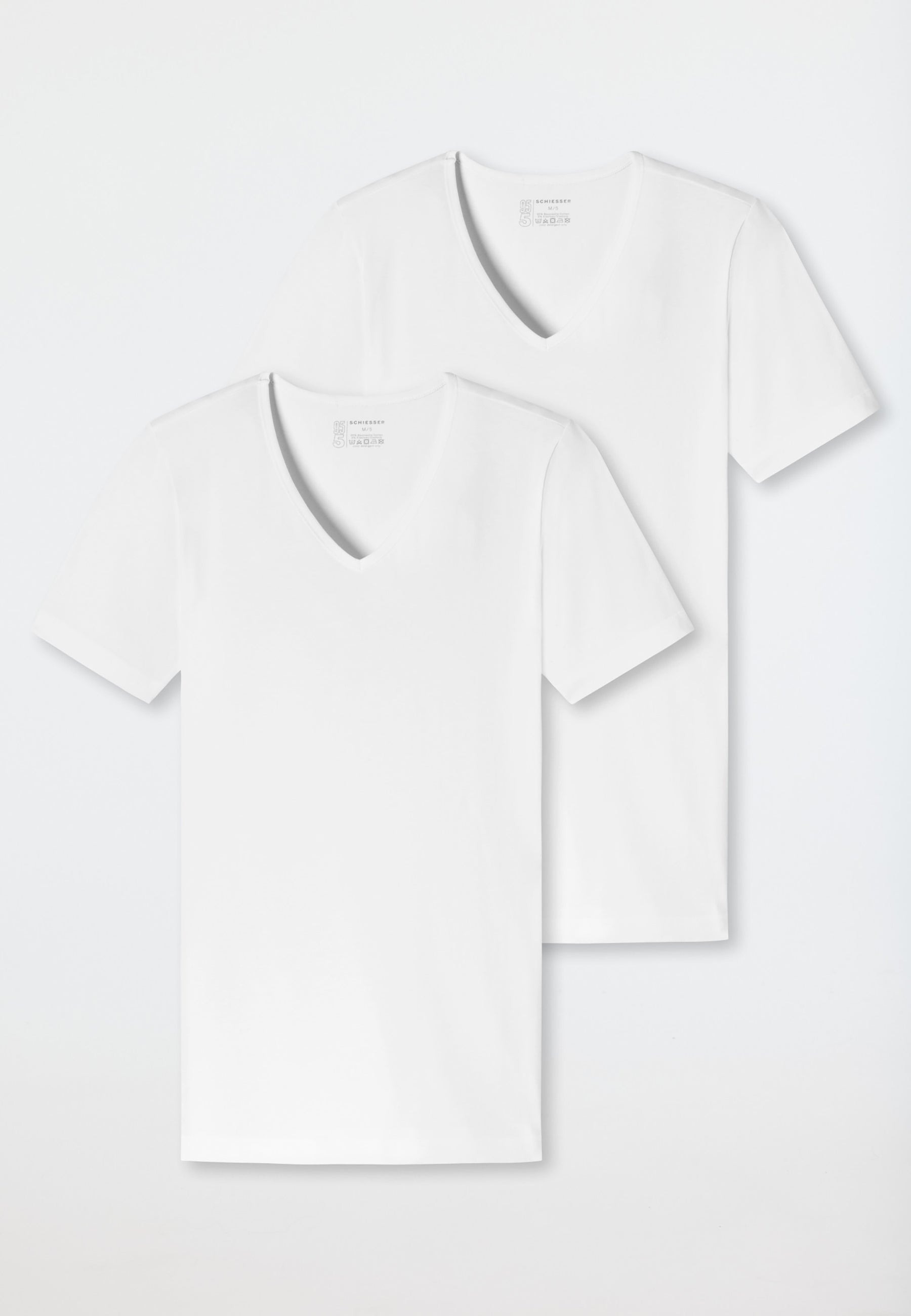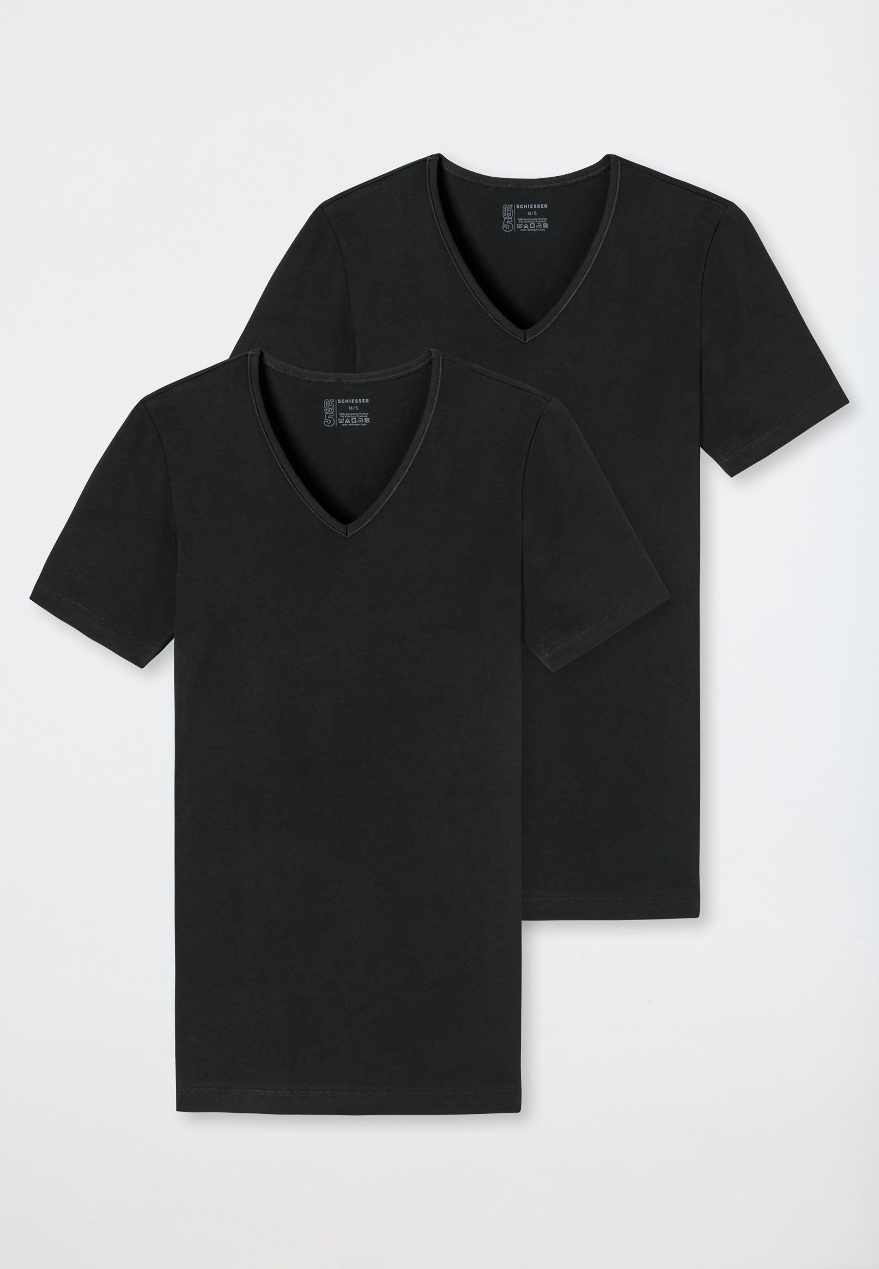 Confezione da 2 maglie intime da uomo mezze maniche a scollo a v della storica linea 95/5 della Schiesser. Realizzate in un morbido e comodo cotone elasticizzato, garantiscono un confort unico. Inoltre, grazie al cotone organico sostenibile testato nei laboratori Schiesser, queste maglie garantiscono una durata unica