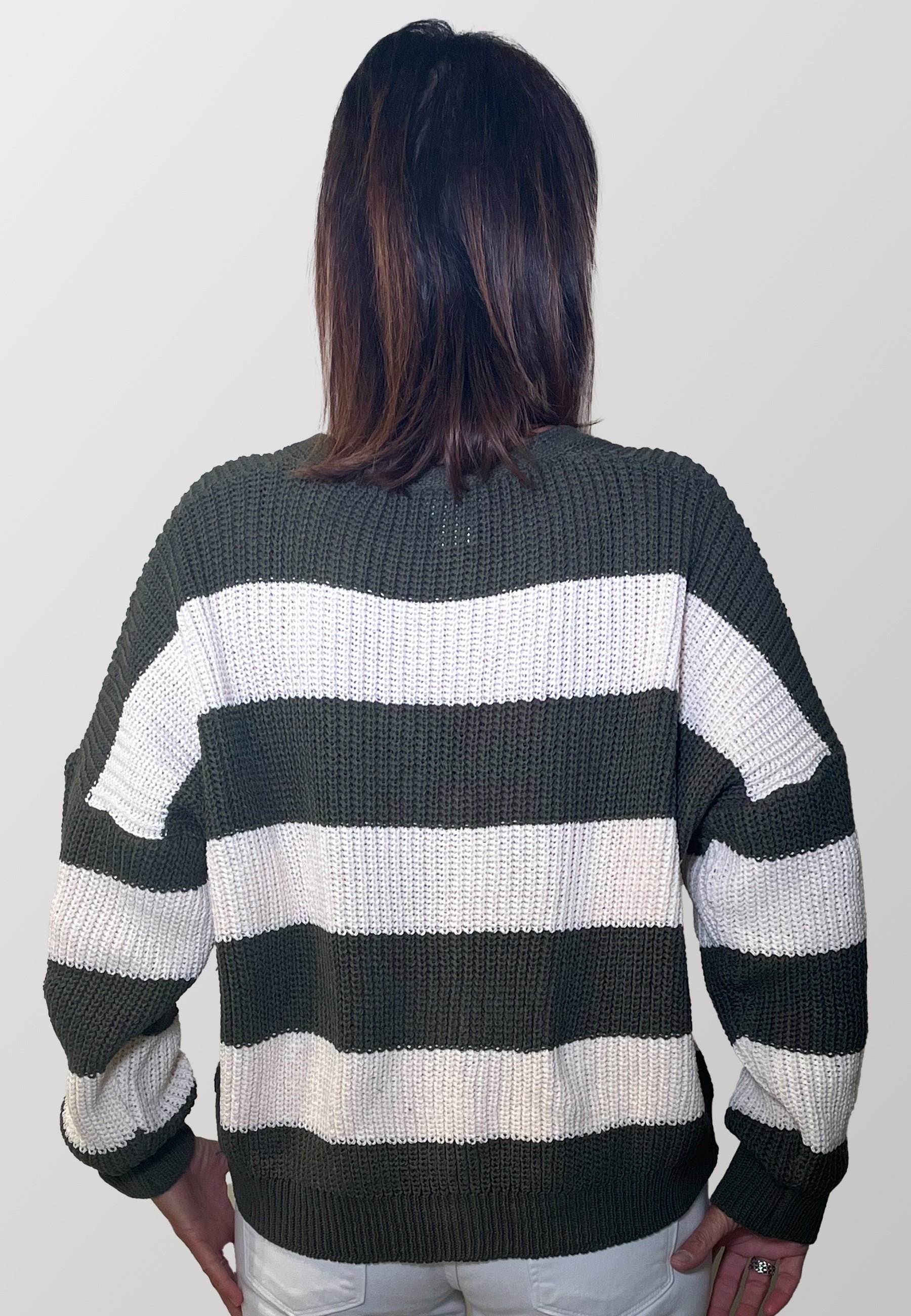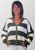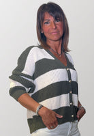Il cardigan rigato con chiusura a bottoni e scollo a V di SUSY MIX è l'accessorio ideale per completare il look di una donna giovane e dinamica. Realizzato in morbido cotone, questo cardigan offre una vestibilità comoda e traspirante, perfetto per ogni stagione. Il design con righe sottili aggiunge un tocco di eleganza discreta, mentre lo scollo a V e la chiusura con bottoni valorizzano la silhouette in modo sofisticato. Versatile e facile da abbinare, questo cardigan si presta a numerosi outfit, rendendolo un capo essenziale per ogni guardaroba. Che tu lo indossi sopra una t-shirt o con un abito, questo cardigan è un must-have per chi cerca stile e comfort. Capo prodotto in Italia. Made in Italy.
