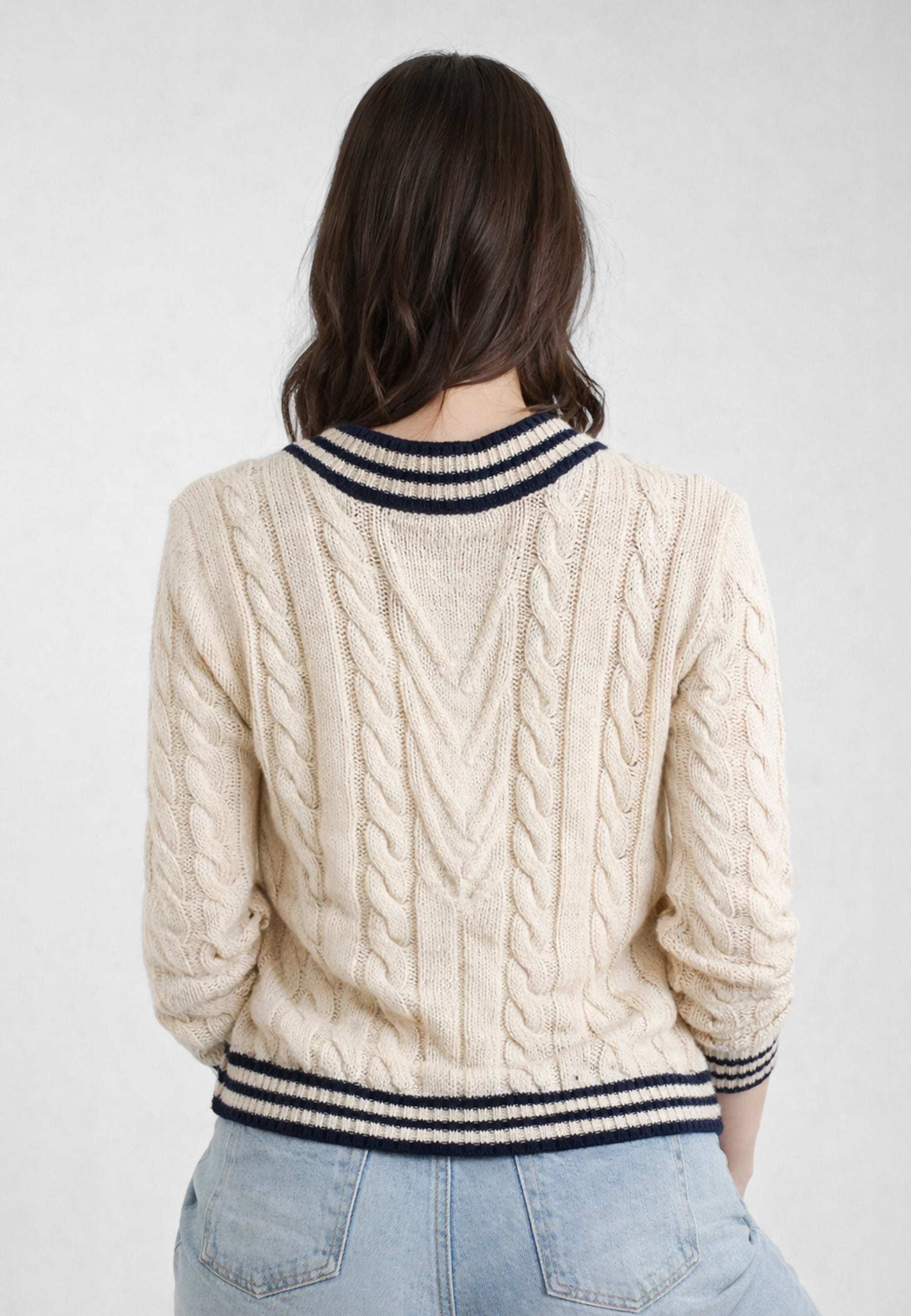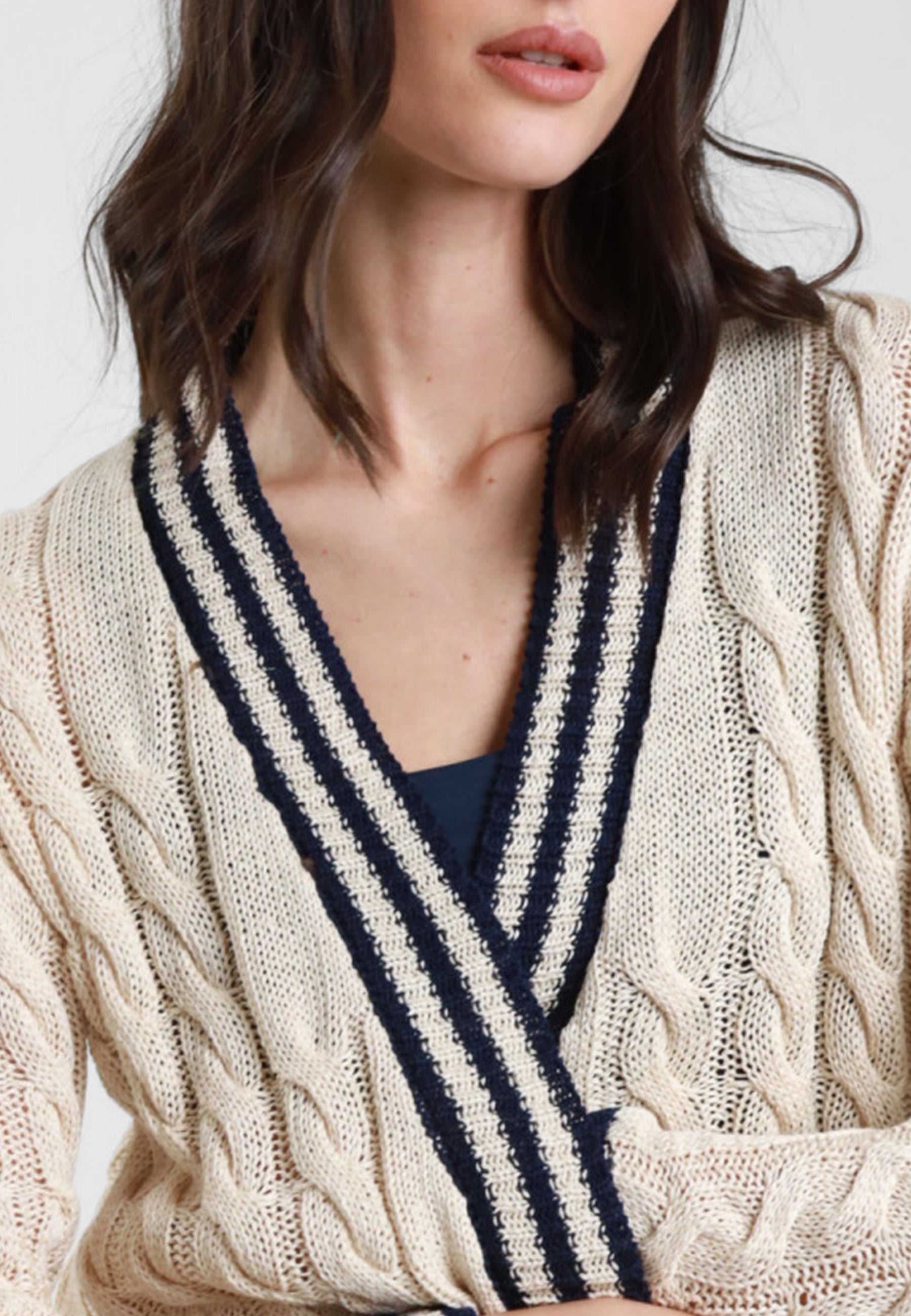 Dall’immagine emerge una lavorazione a trecce ben definita che attraversa l’intera superficie del capo, conferendo struttura e profondità visiva. Il modello aperto presenta uno scollo a V incrociato, valorizzato da bordi a righe a contrasto che definiscono profili e fondo, donando un tocco grafico e moderno.La vestibilità risulta confortevole ma ordinata, ideale per essere indossata sopra top o maglie leggere durante la stagione più fresca. Il filato in acrilico assicura morbidezza, praticità e una buona tenuta della forma, rendendo il cardigan adatto all’uso quotidiano.