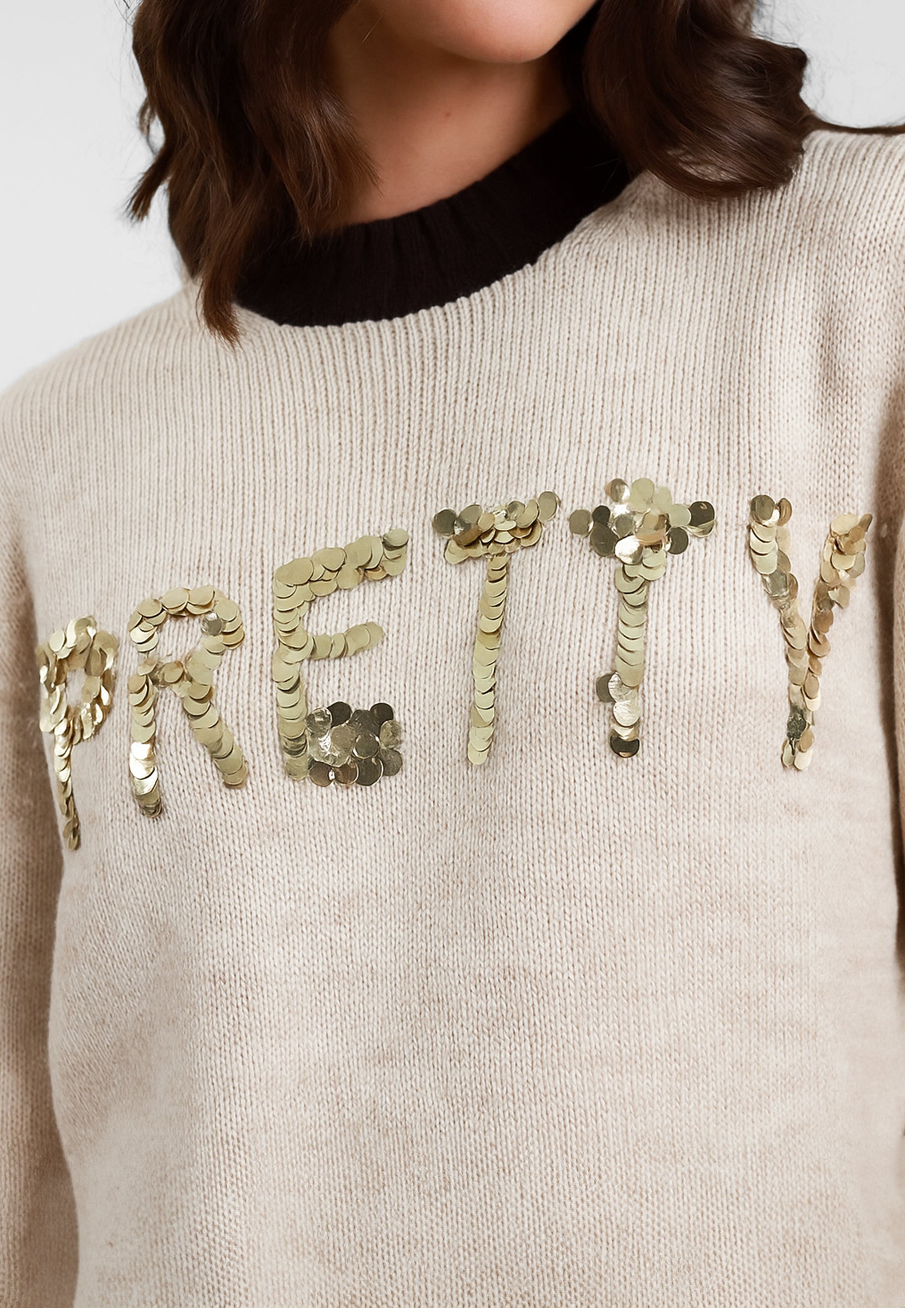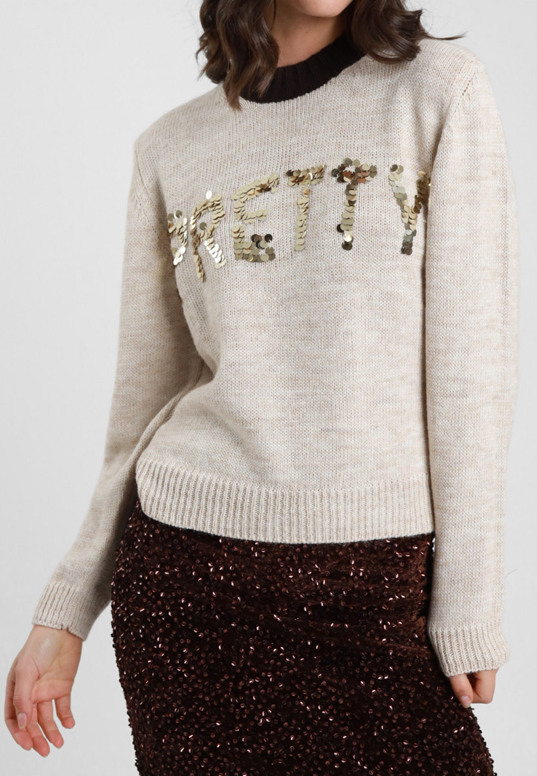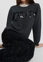 Pensato per chi ama unire comodità e moda, questo maglione SUSY MIX è perfetto per donna. Made in Italy, Maglione con Ricamo Scritta ''Pretty'' in paillettes, Girocollo a Contrasto.. Prodotto in Italia con cura artigianale, garantisce morbidezza e versatilità in una morbida miscela di lana e viscosa e alpaca.