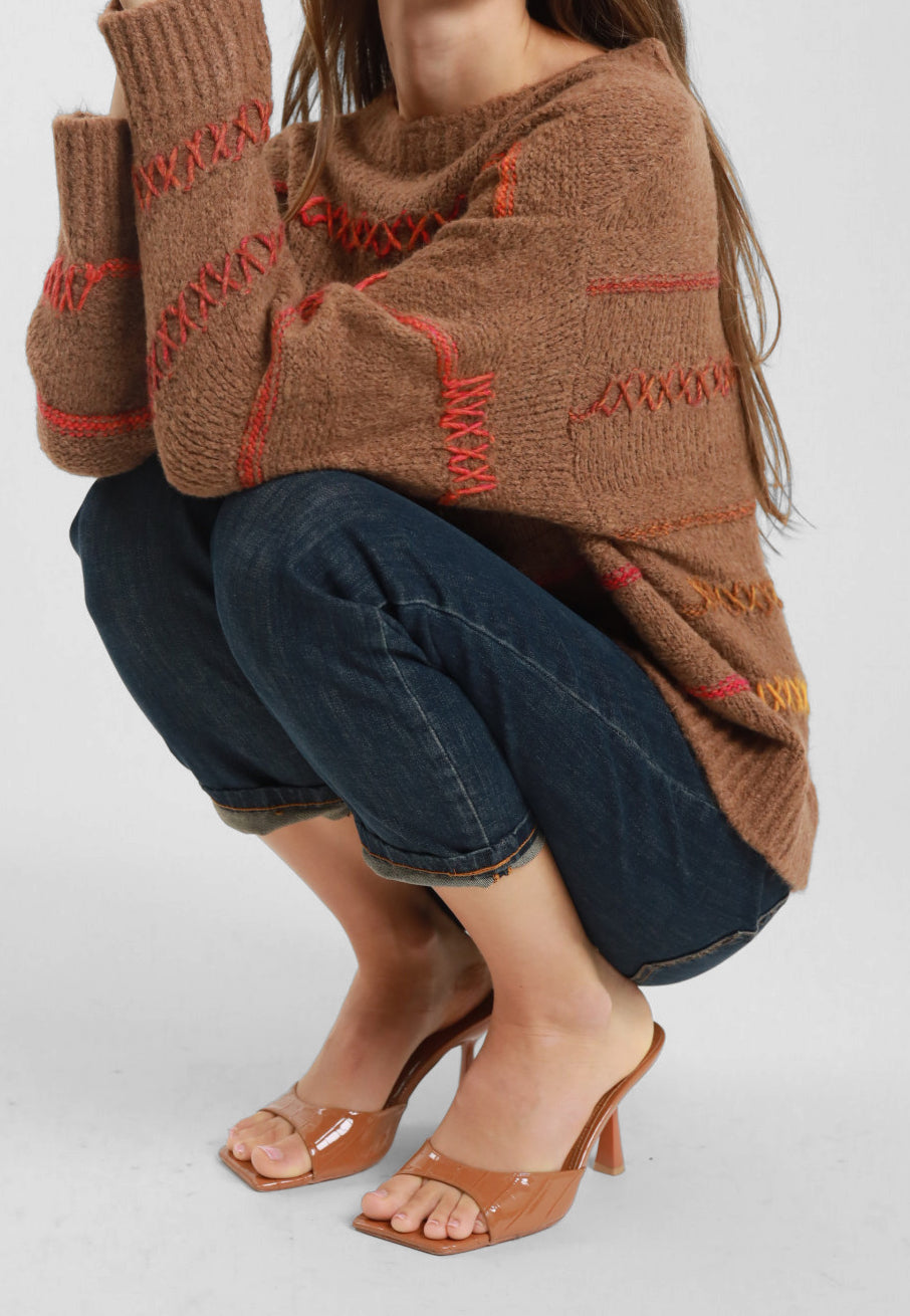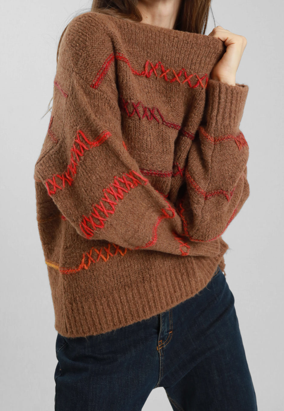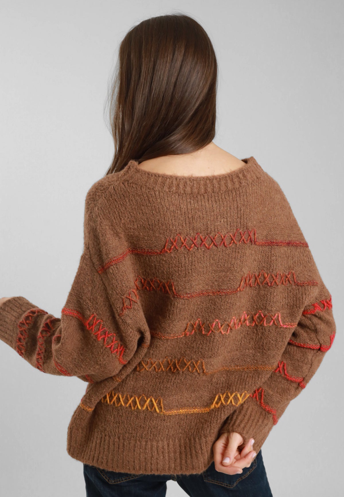 SUSY MIX Maglione Donna Scollo Barchetta con Ricami Colorati