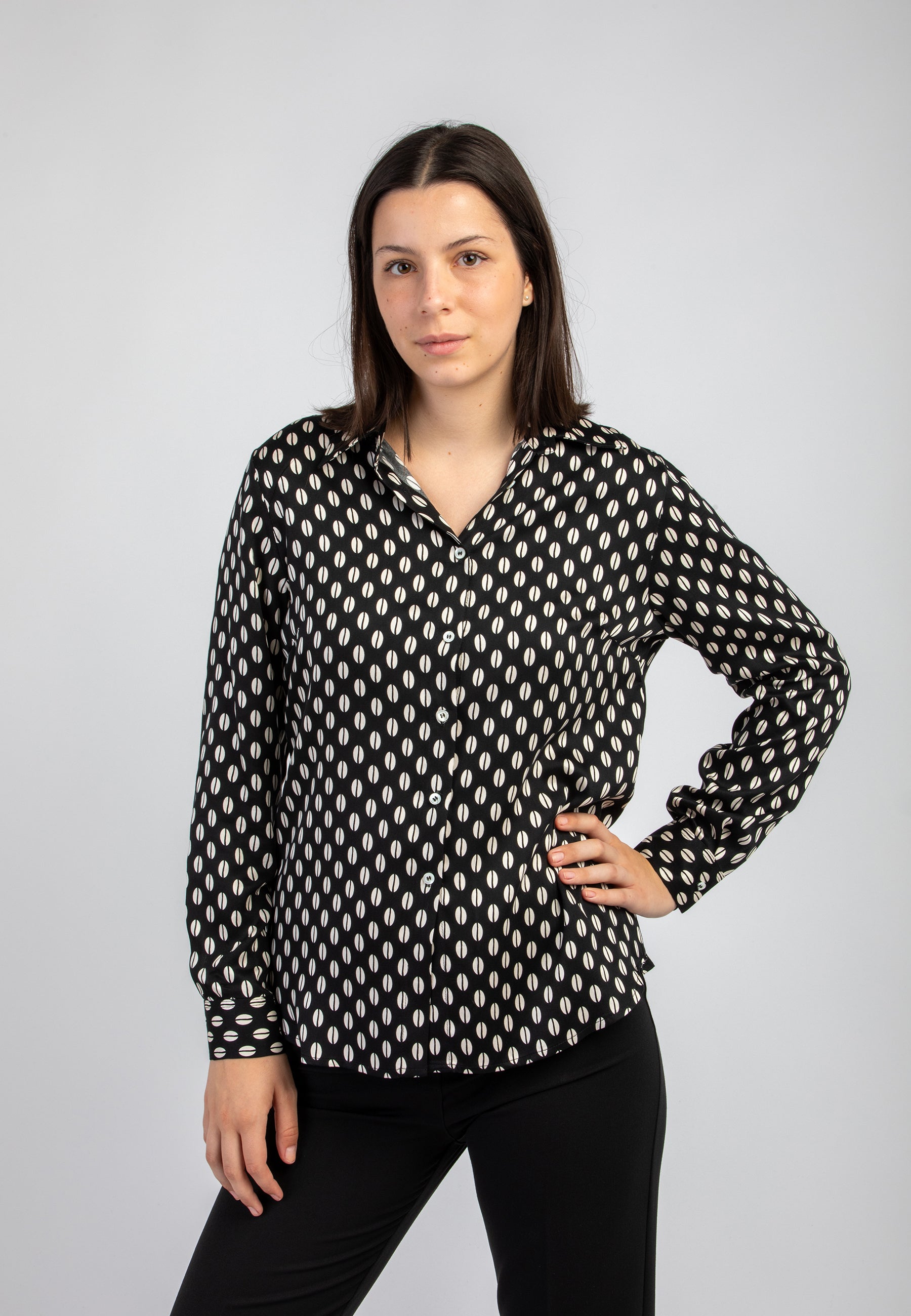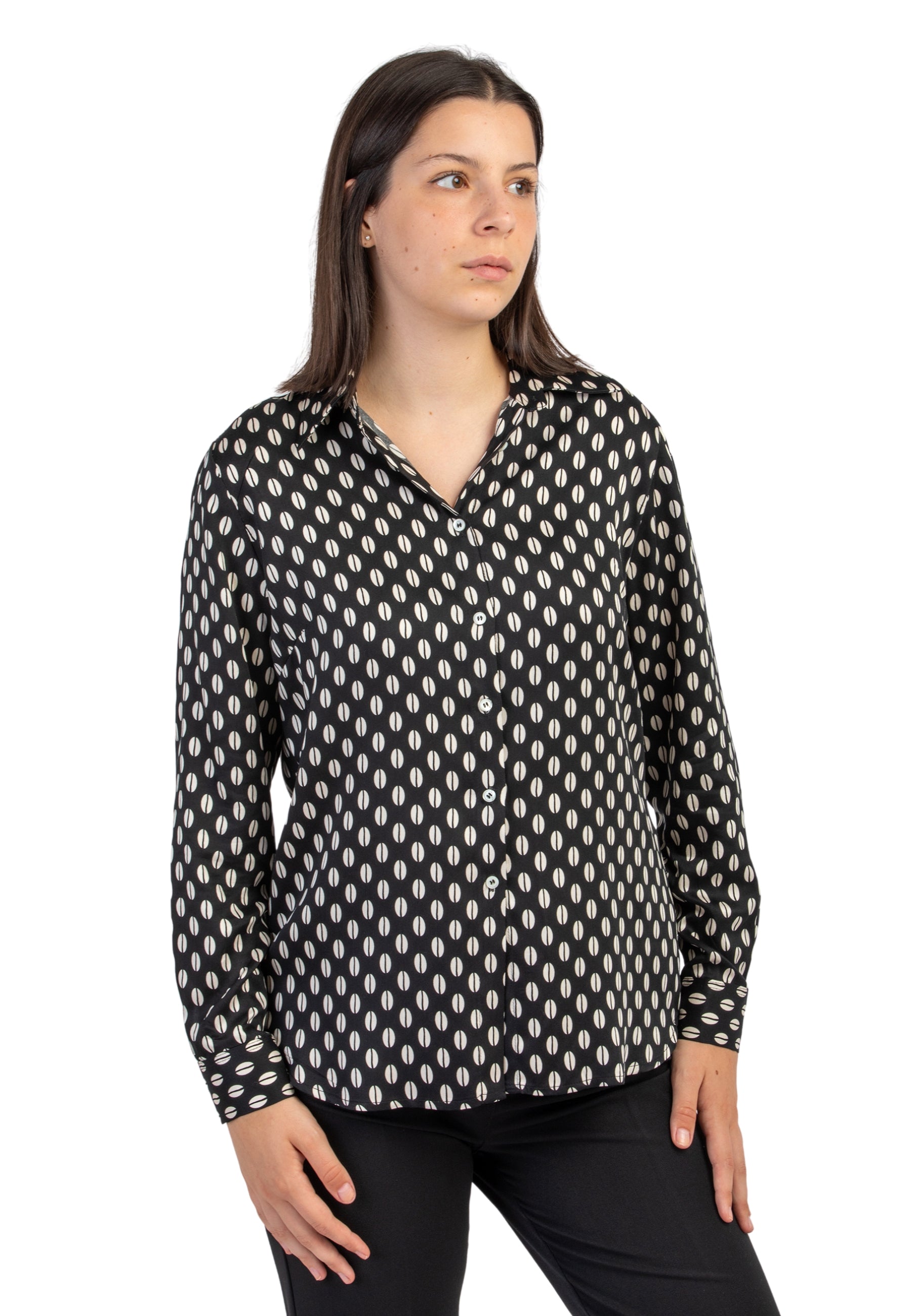 Ravviva il tuo guardaroba con la Camicia Donna di VLT's by Valentinas! Tessuto di viscosa con fantasia chicchi di caffè, questa camicia è elegante e alla moda. Aggiunge un tocco di classe e stile al tuo outfit. Vestibilità perfetta e comoda, perfetta per ogni occasione. Capo prodotto in Italia. Made in Italy.