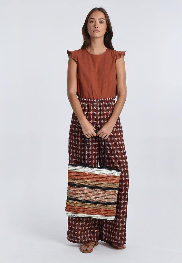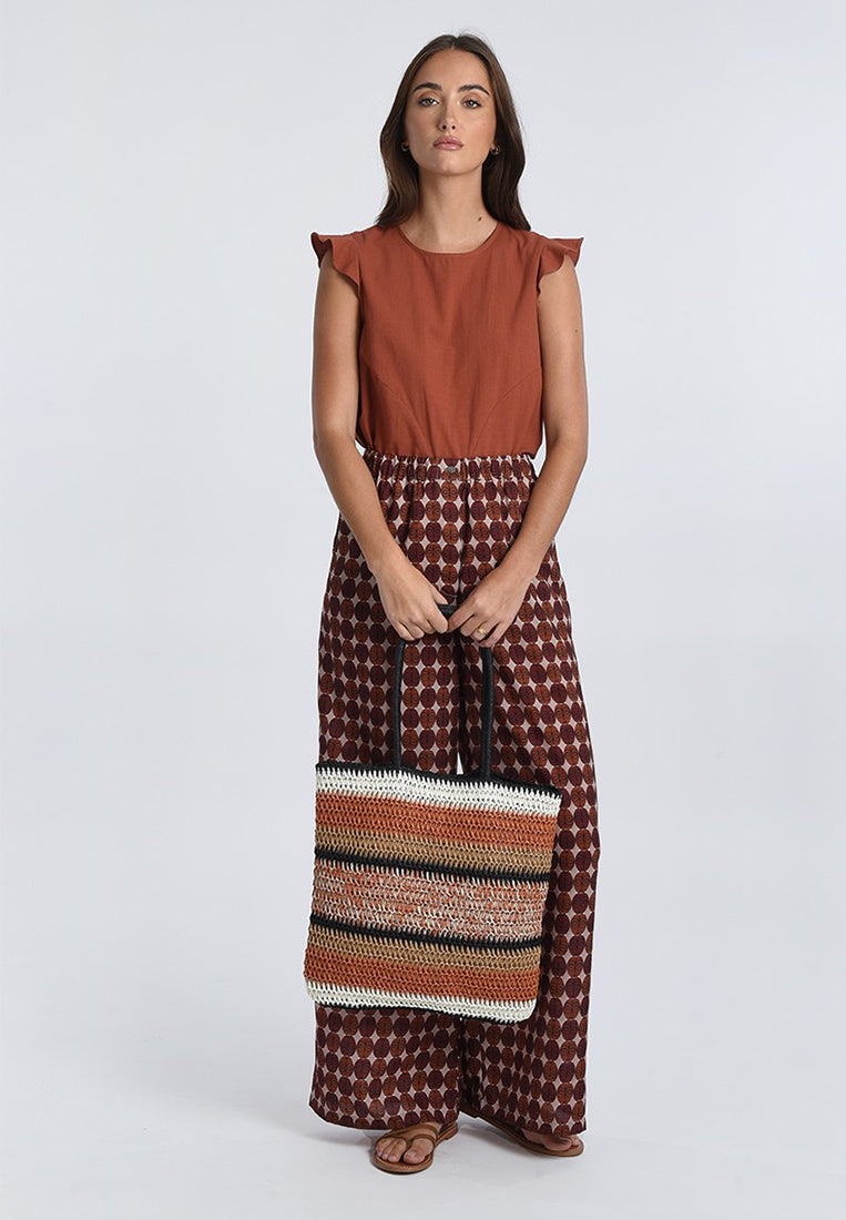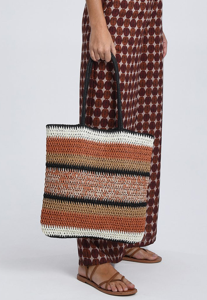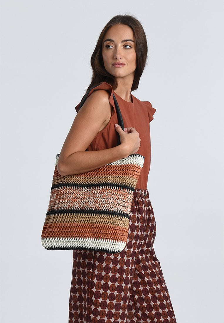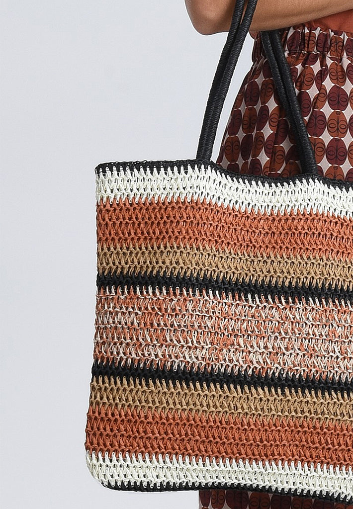 Borsa intrecciata a righe multicolor da portare in spalla. Accessorio estivo in stile bohémien o casual chic, tote bag multicolore. Dimensioni: 38 x 38 cm