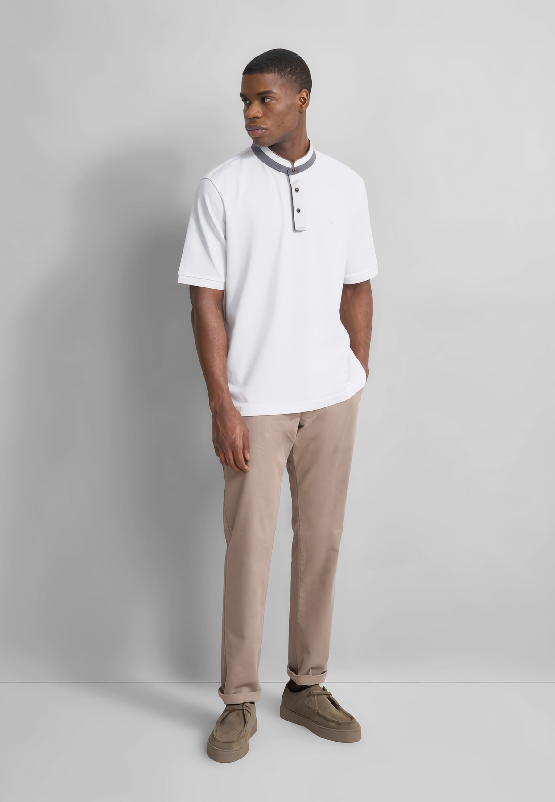 Polo uomo Bugatti a mezza manica in cotone piquet leggero con collo alla coreana, ideale per un look maschile moderno, confortevole e curato, perfetto per lavoro e tempo libero.