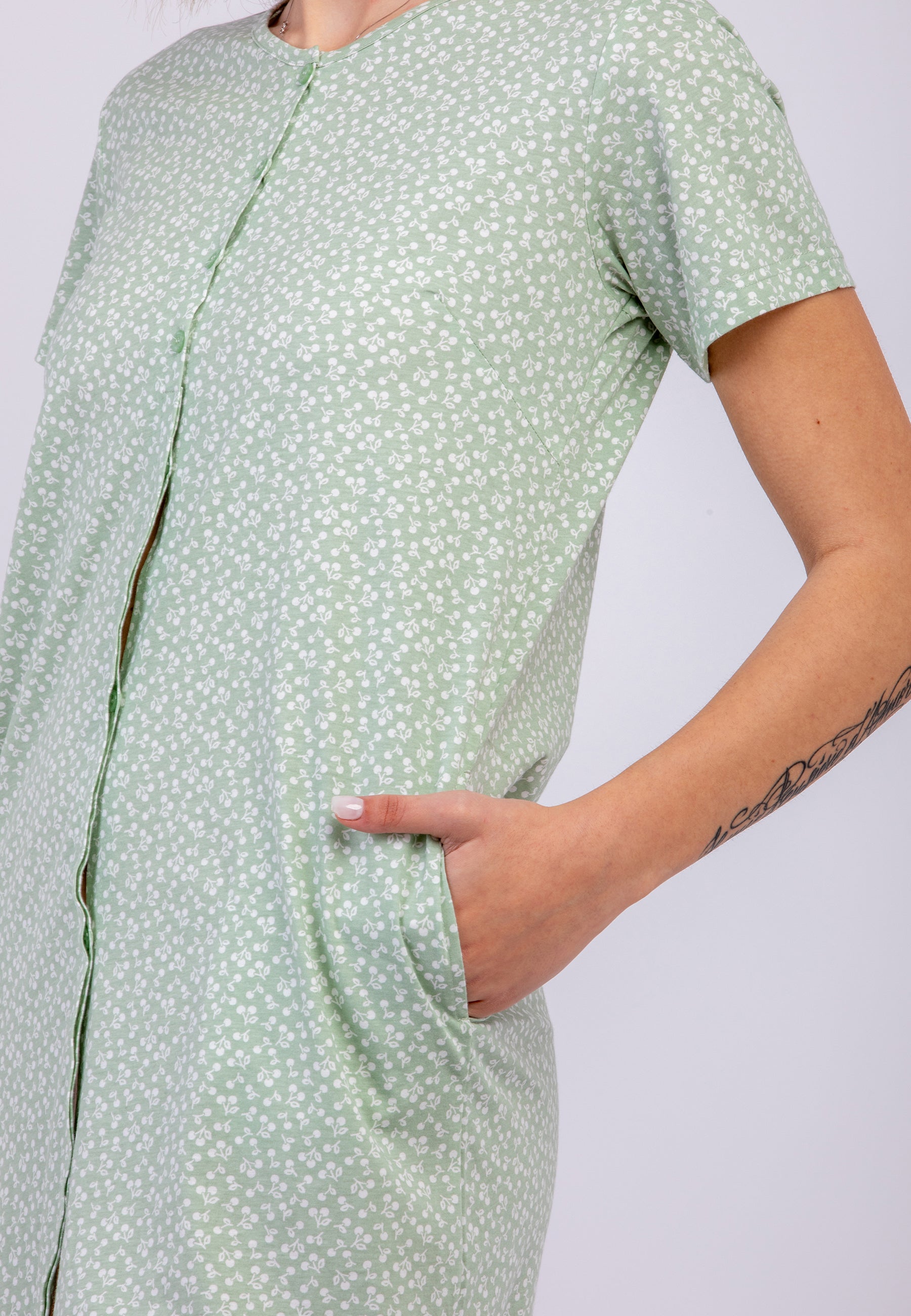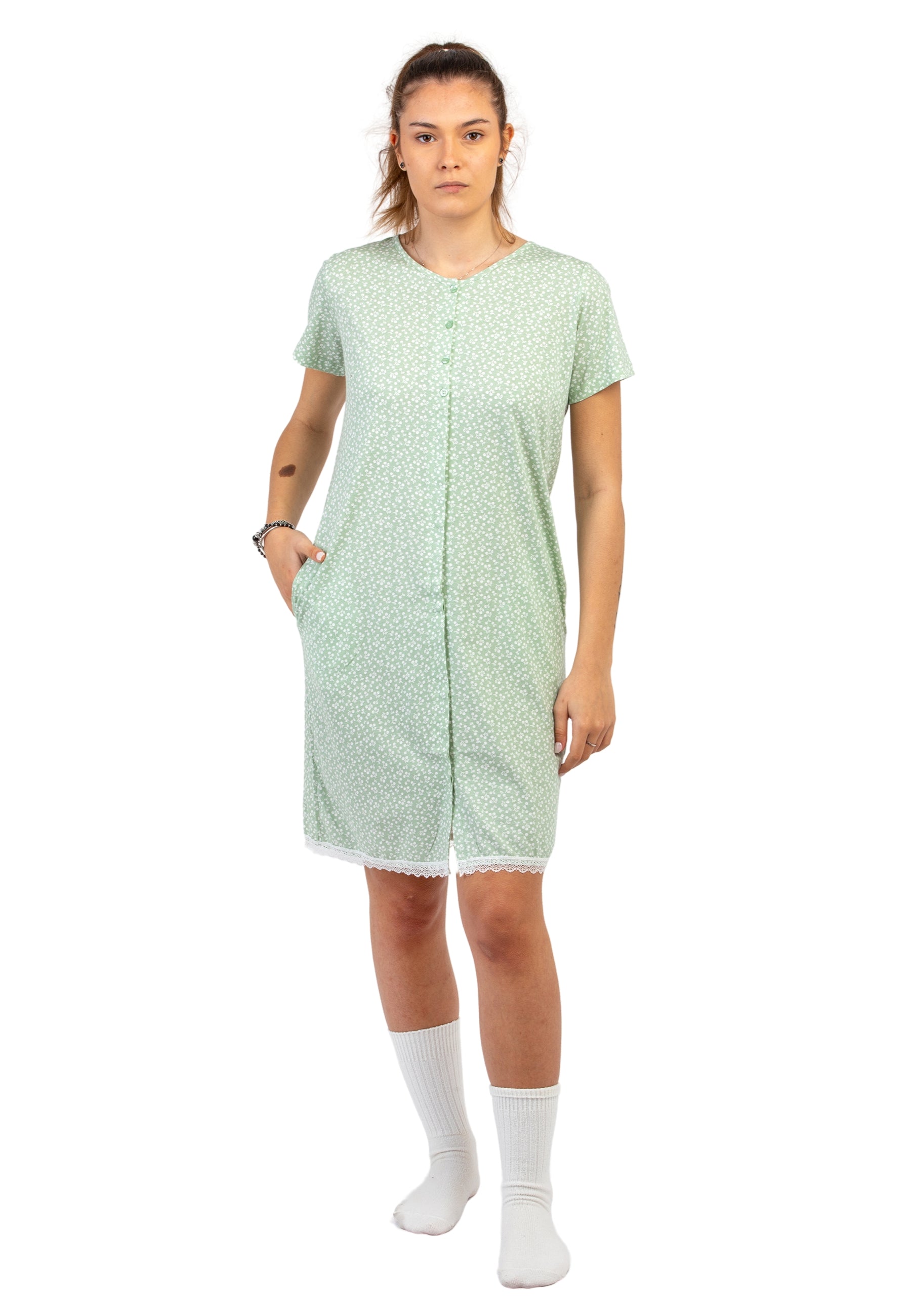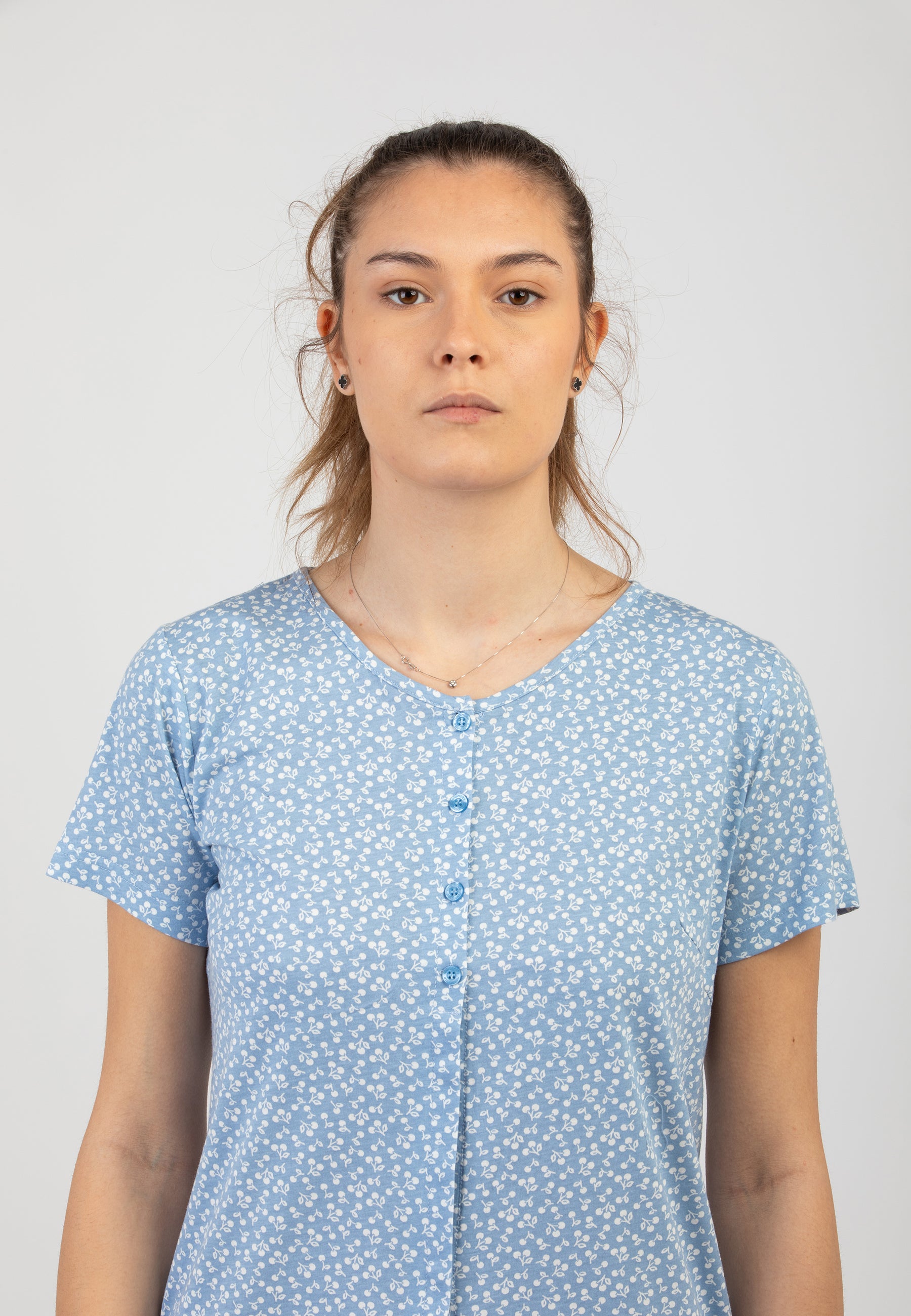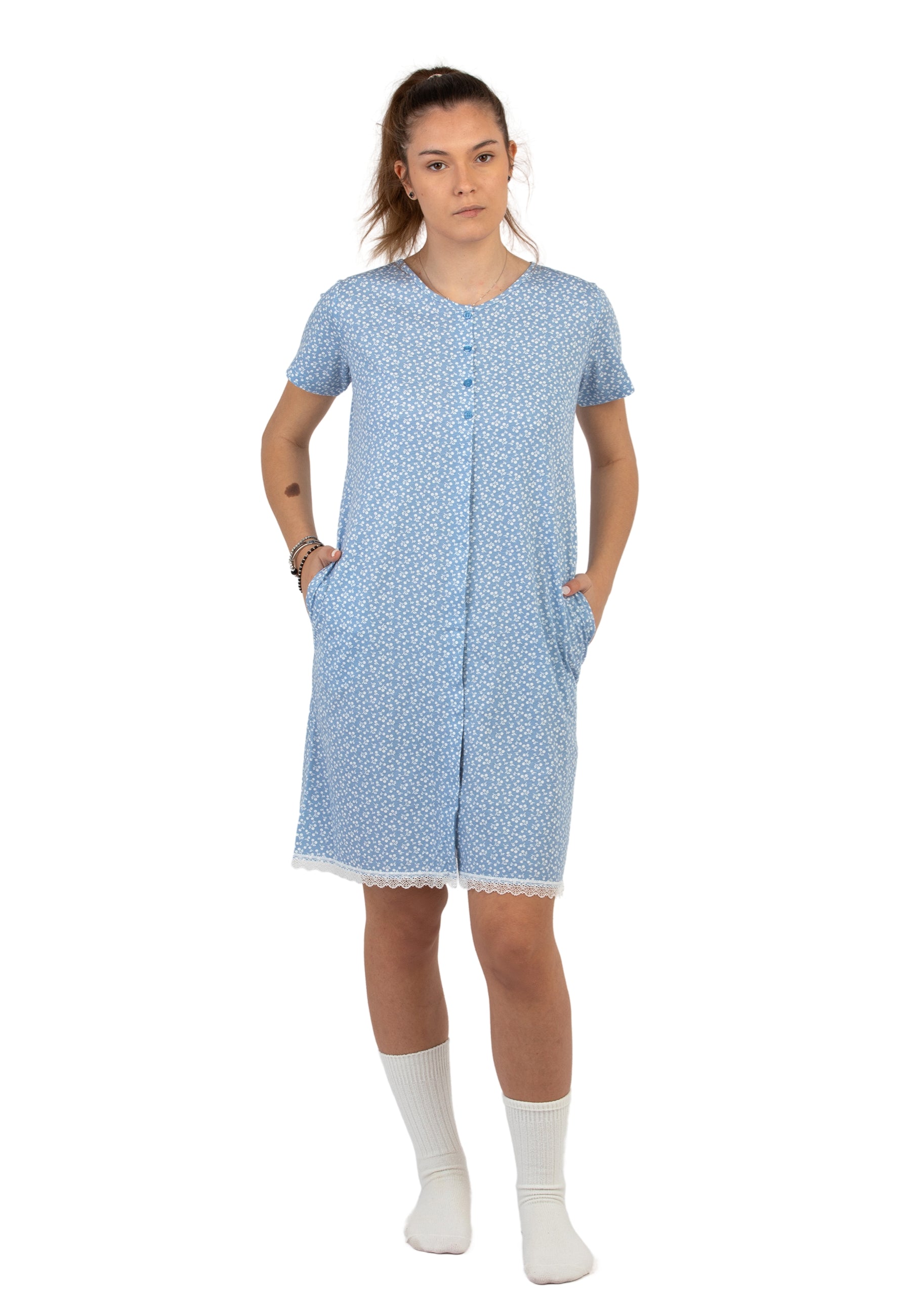 Scopri l'eleganza e il comfort della camicia da notte da donna a mezza manica di NOI DI NOTTE, realizzata in morbido jersey di puro cotone leggero. Il design raffinato, caratterizzato da una delicata microfantasia, esalta uno stile senza tempo, perfetto per chi cerca un mix di praticità e femminilità. L'apertura frontale con bottoni aggiunge un tocco di eleganza e funzionalità, rendendola ideale anche per chi desidera maggiore comodità nei movimenti. Perfetta per le notti più fresche o le stagioni intermedie, questa camicia da notte avvolge la pelle in una sensazione di leggerezza e benessere, esprimendo il gusto unico del brand.